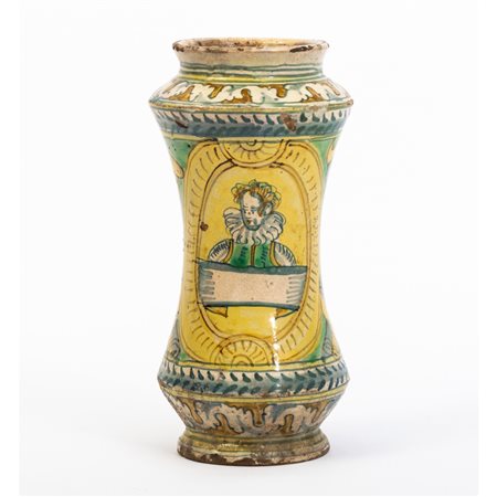 ALBARELLO in ceramica smaltata e decorata con medaglione centrale raffigurante "Figura".