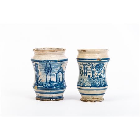 COPPIA DI PICCOLI ALBARELLI in ceramica smaltata e decorata.