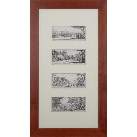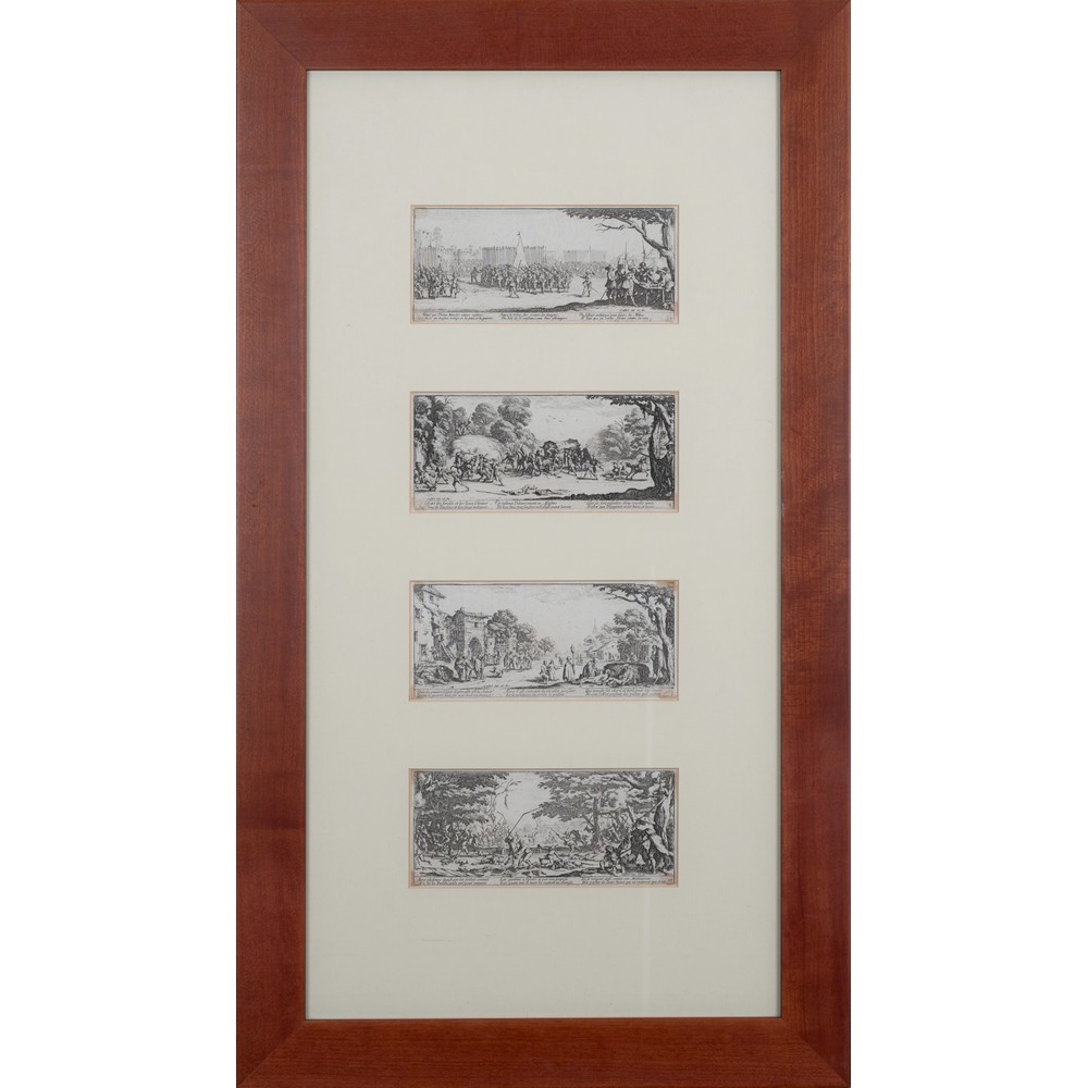 Jacques CALLOT: Les Grandes Misères de la Guerre – 1633. Bella cornice contenente 4 delle 18 acqueforti realizzate dall’autore. Ogni acquaforte differisce dall’altra di alcuni millimetro, sicchè le misure variano da mm 80/90 x 185/190. Le diciotto matrici sono conservate al Musée Lorrain di Nancy. Le nostre sono le tavole 2, 8, 16 e 17. La serie delle Grandes Misères de la Guerre è l'opera più famosa di Jacques Callot. Deve la sua fama al suo alto numero di tavole, alla sua maestria tecnica e al suo soggetto. È spesso considerata come il completamento di un progetto iniziato con la serie di undici tavole note come le Petites Misères, incise molto probabilmente nel 1632, che rimase incompleta e fu pubblicata solo dopo la morte di Callot. Le presenti incisioni presentano lo sfondo ben visibile, con alcuni tratti di puntasecca sulle lance dei fanti. Paulette Choné ha notato che lo storico dell'arte Filippo Baldinucci (1625-1697) descrive ogni lastra lodando la maestria tecnica e la creatività di Callot e ci ricorda che Les Grandes Misères sono stati inizialmente conosciuti con il titolo La Vita del Soldato. Il titolo della serie dei Misères nell'inventario del patrimonio dell'incisore dopo la sua morte è, infatti, La Vie des Soldats (La Vita dei Soldati)." (P. Choné, p. 397.).