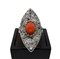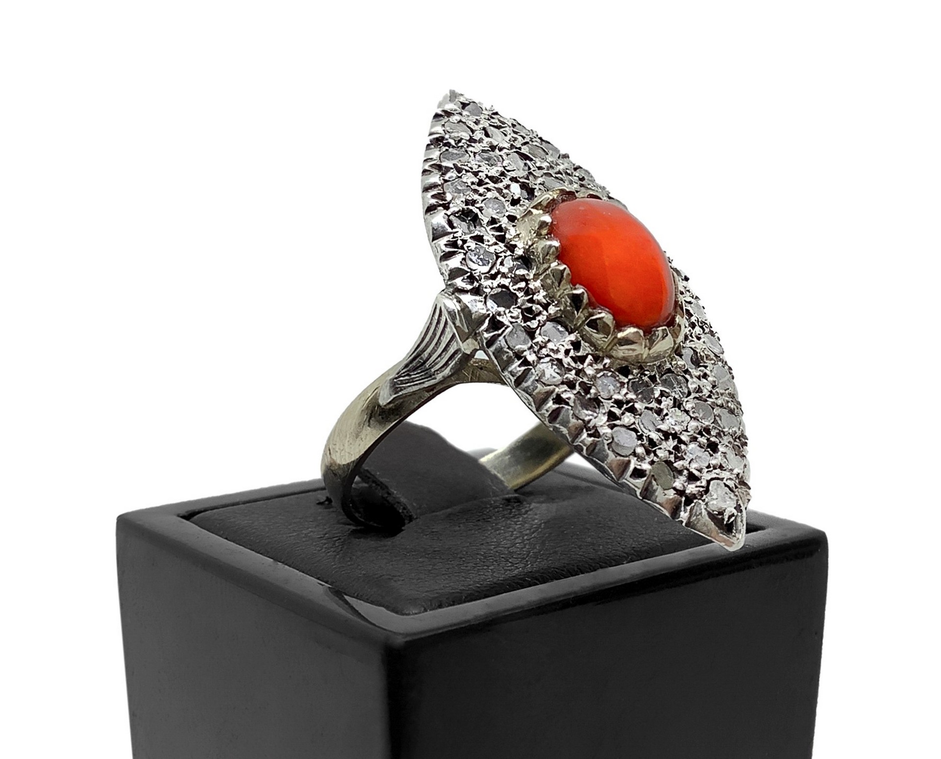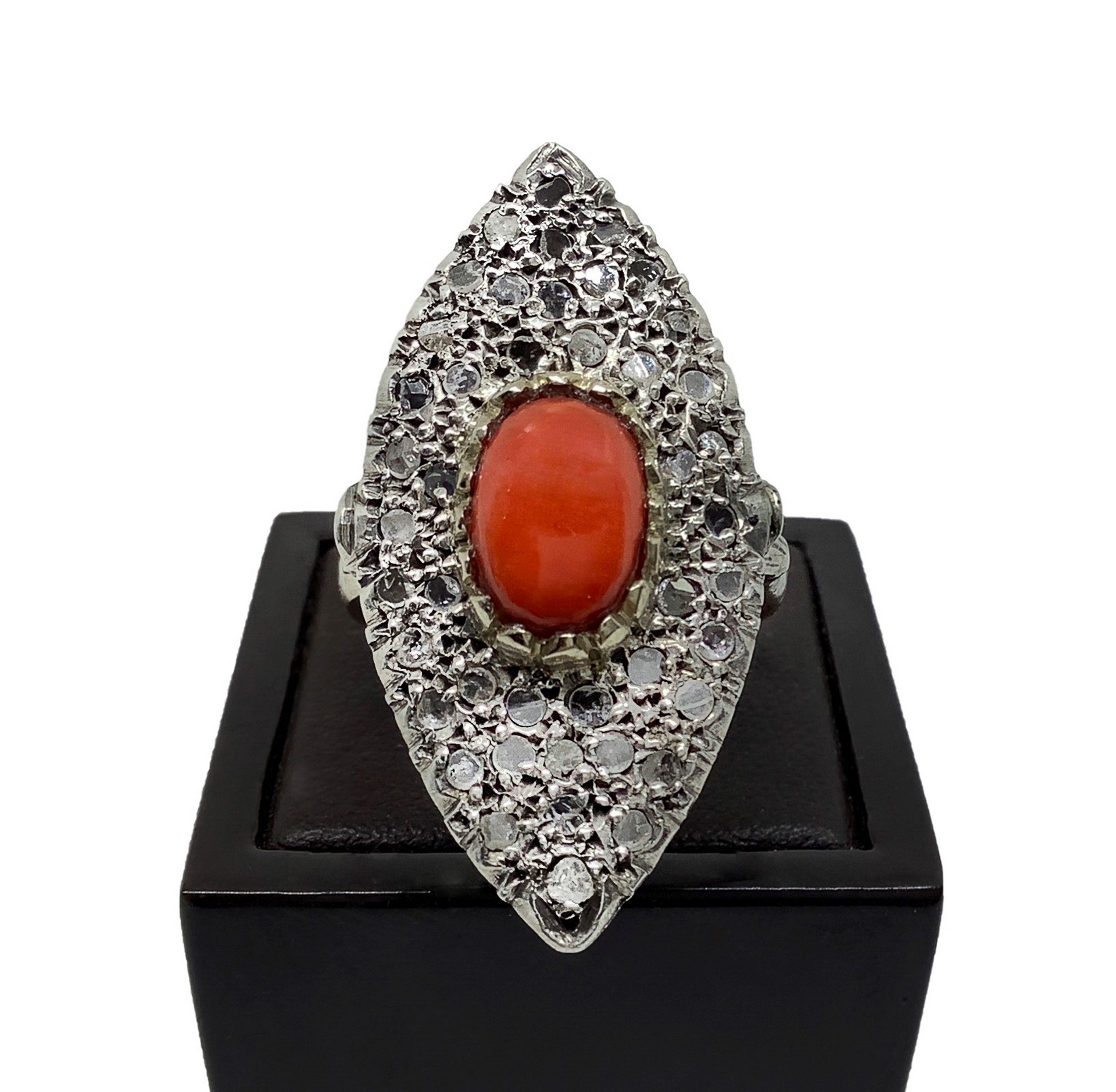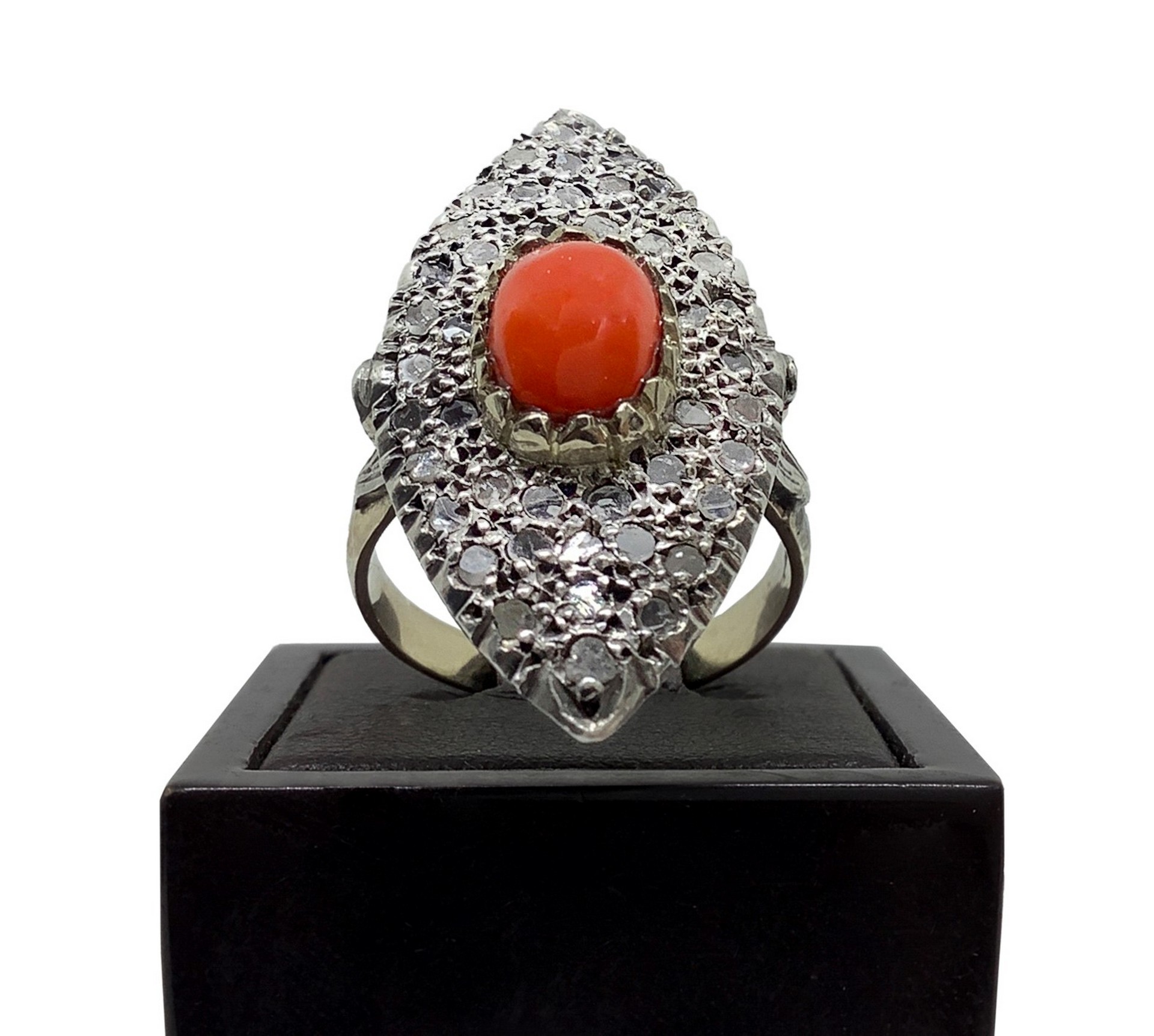 Anello spoletta in oro basso titolo 9 carati, diamanti e corallo misura 18, 7,4 gr.