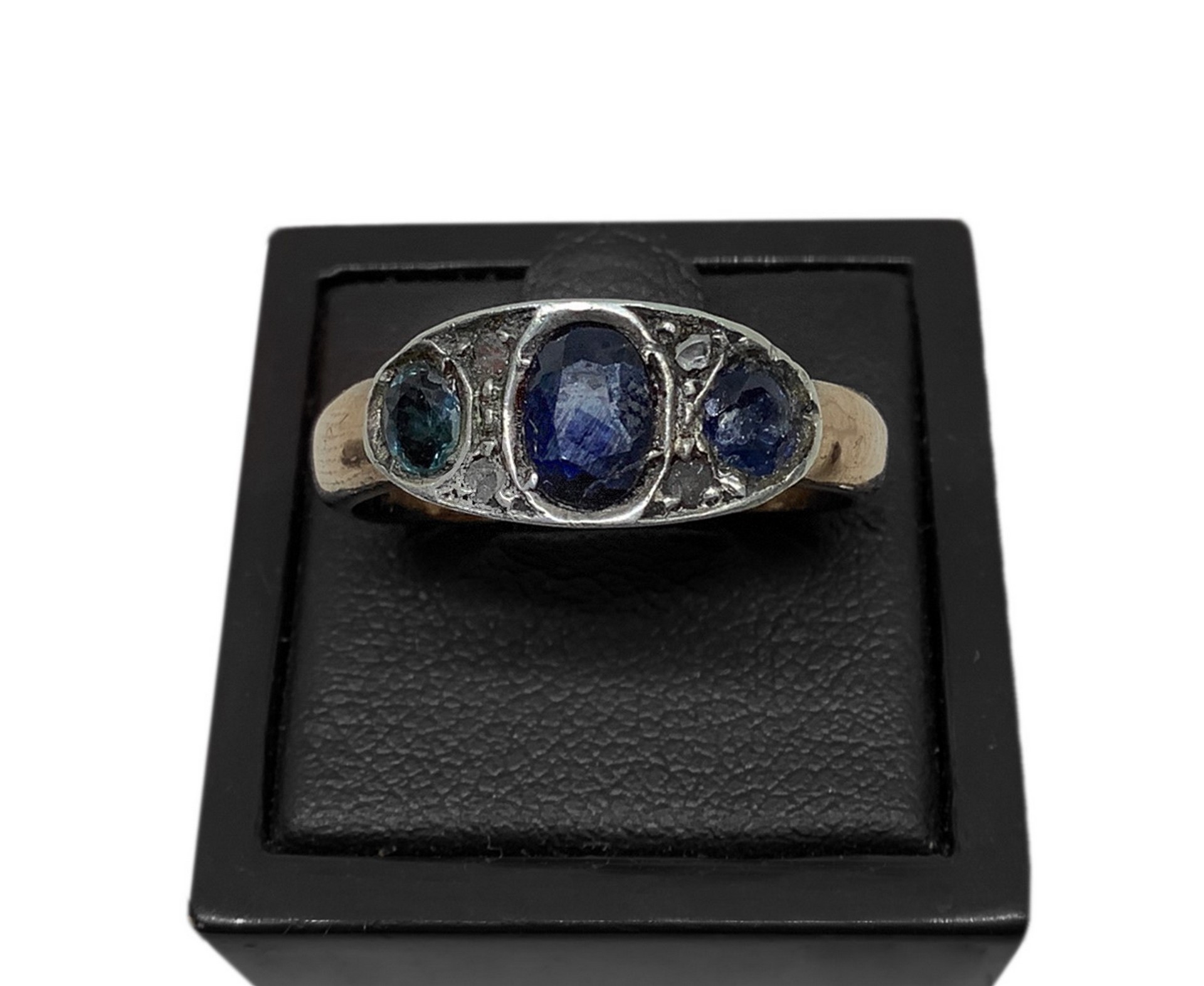 Anello con tre zaffiri in oro basso titolo misura 18, gr. 4.4
