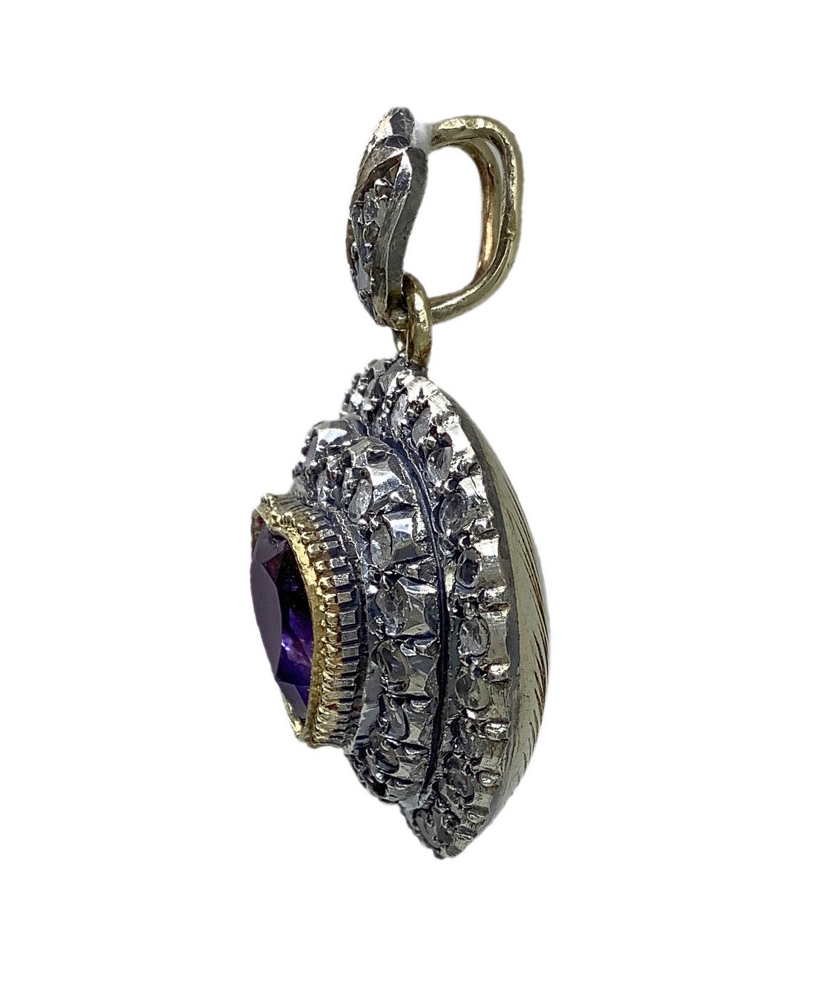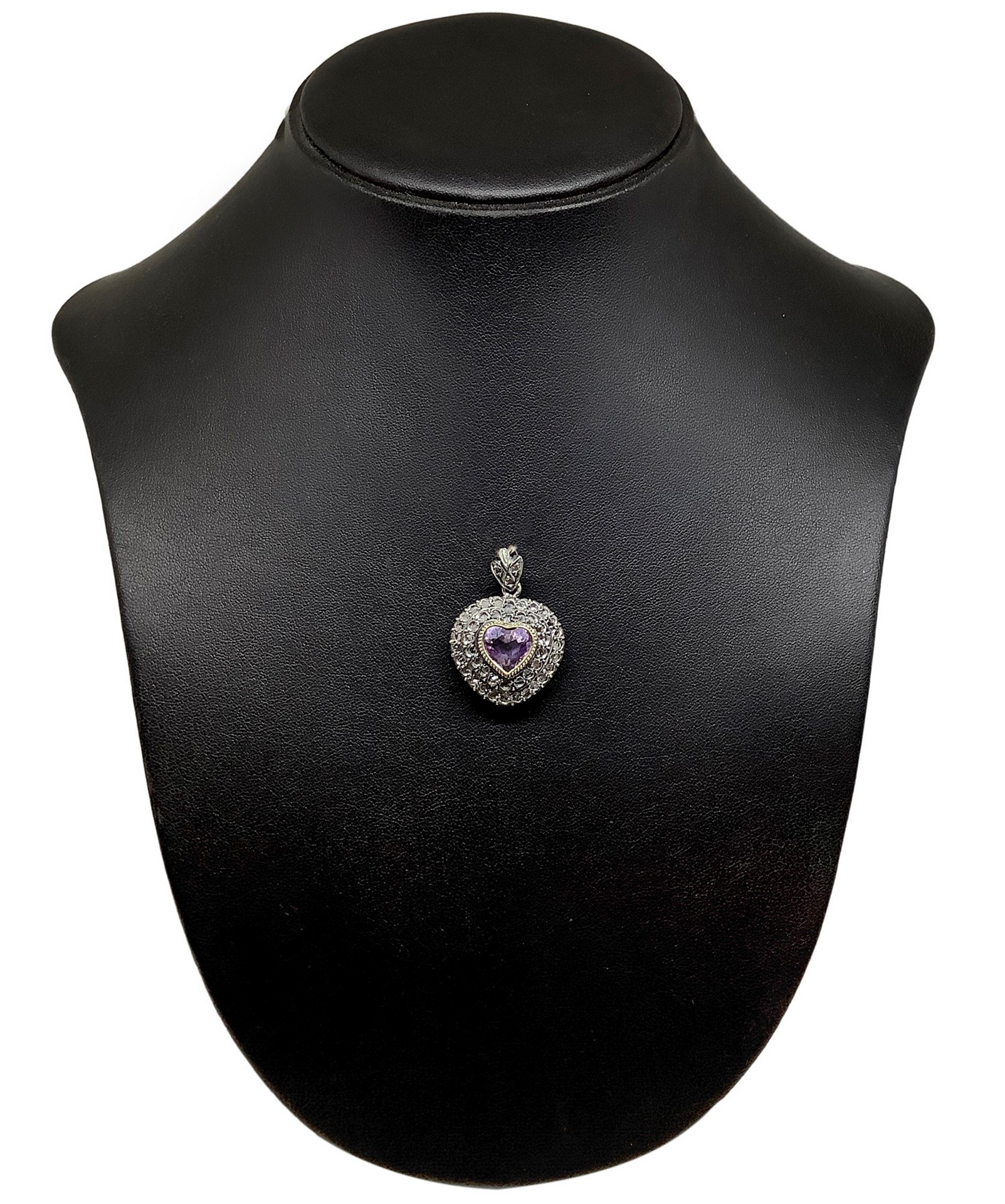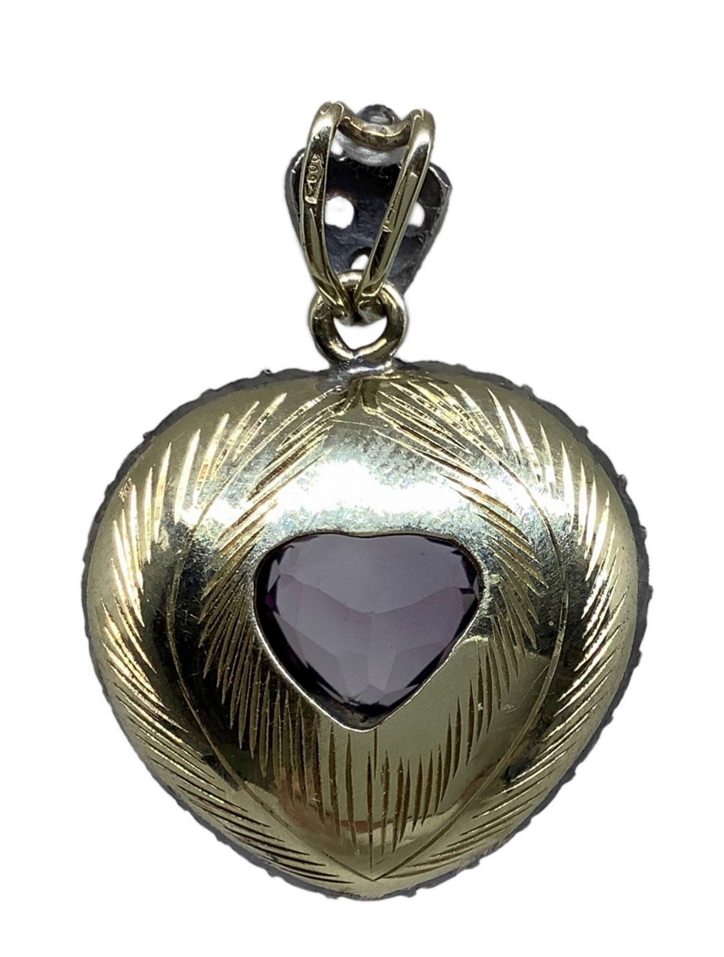 Lotto 24 | Ciondolo con ametista a forma di cuore in oro basso titolo e argento, doppio giro di diamanti