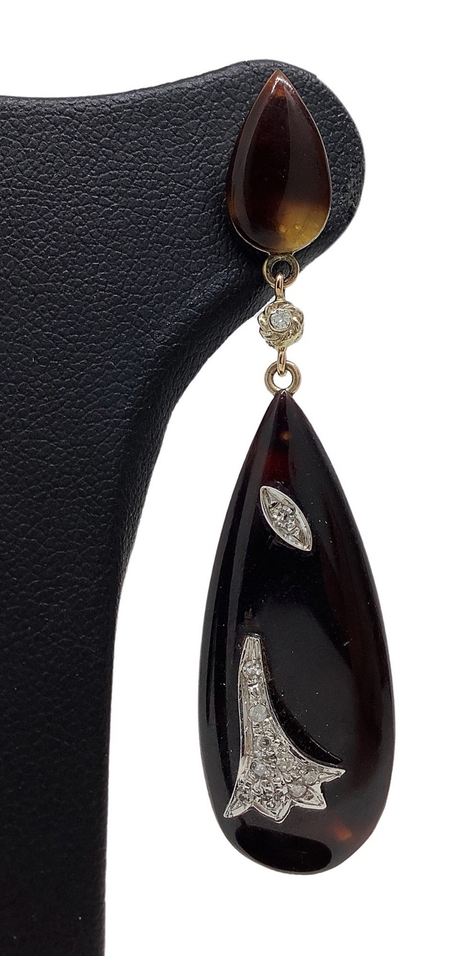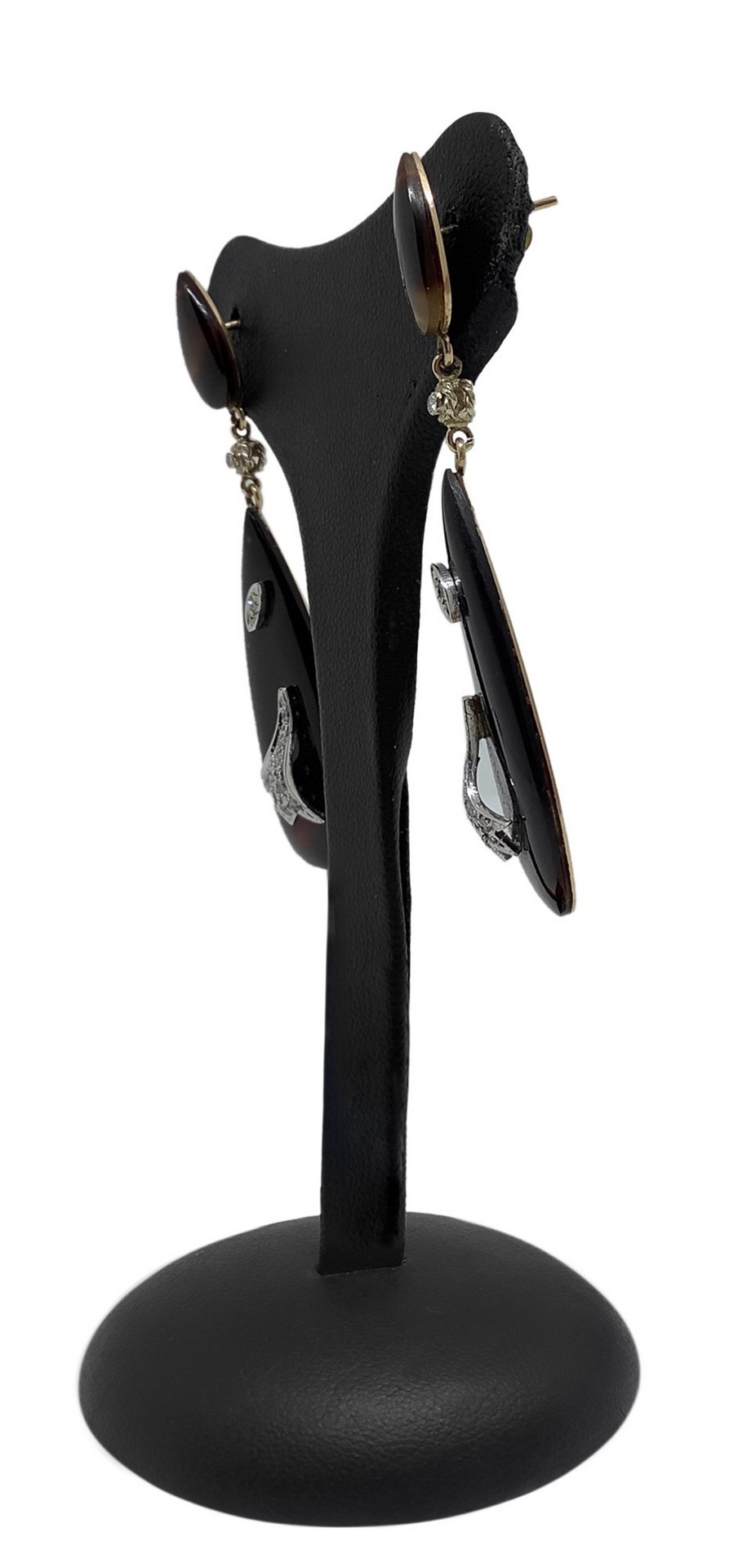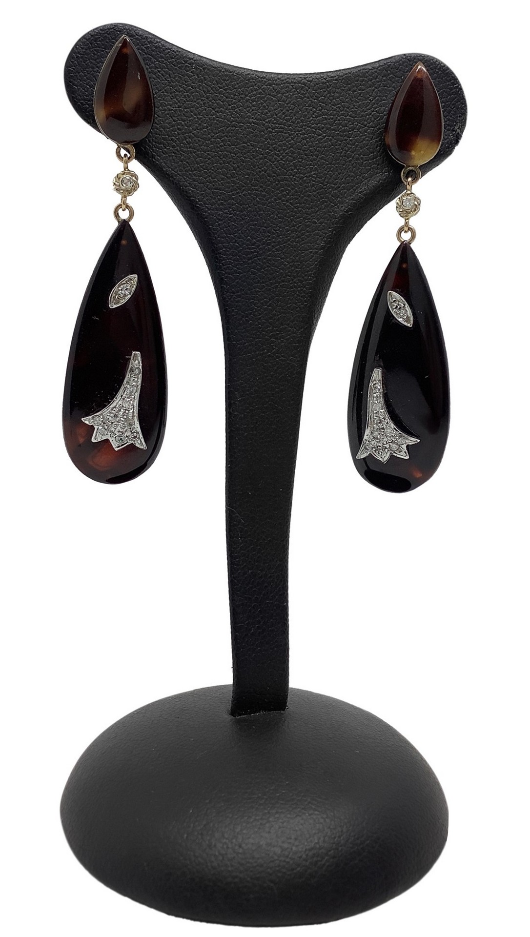 Orecchini pendenti in oro 9 carati in tartaruga e brillanti gr. 8,5, lunghezza 6 cm