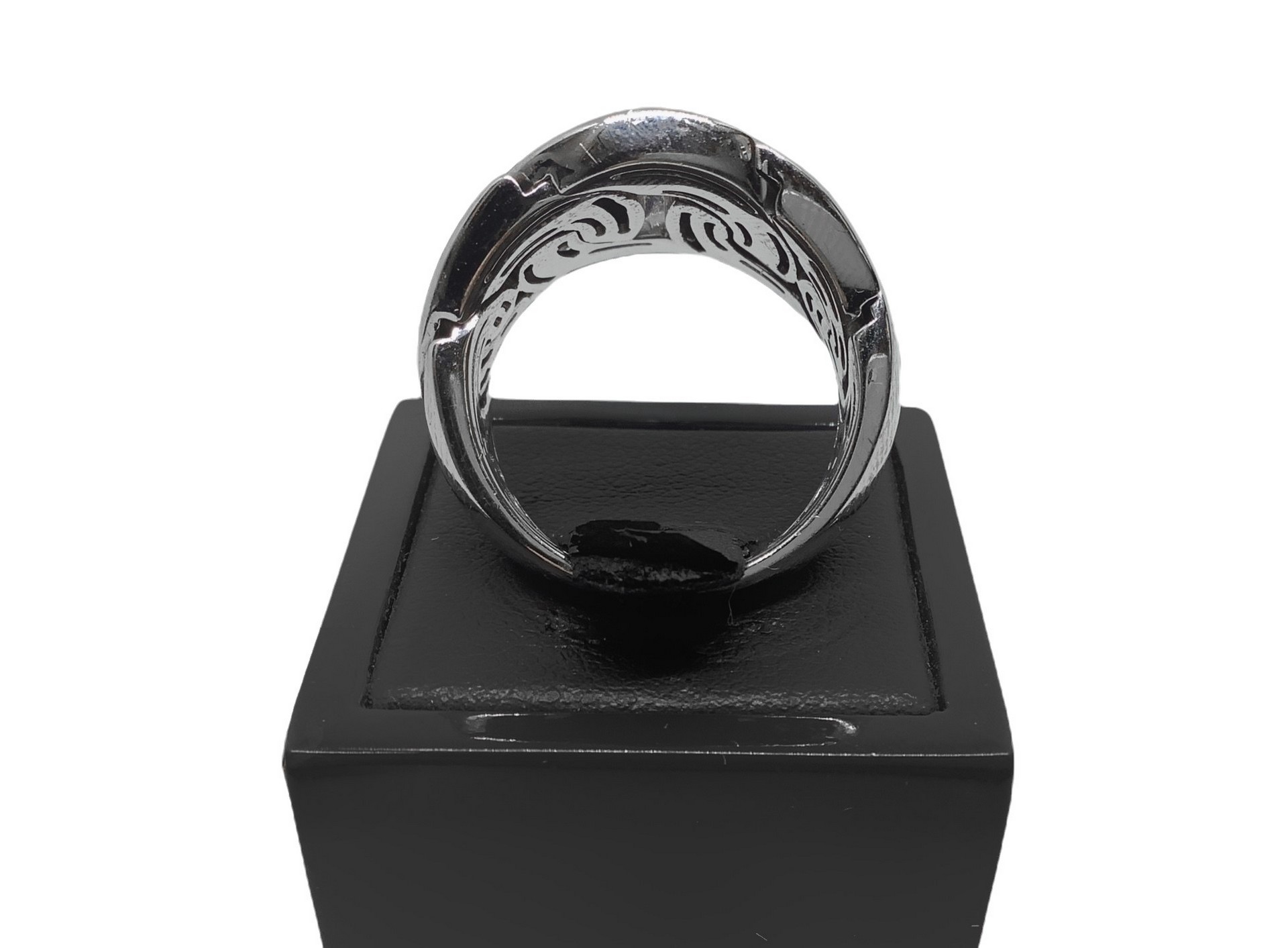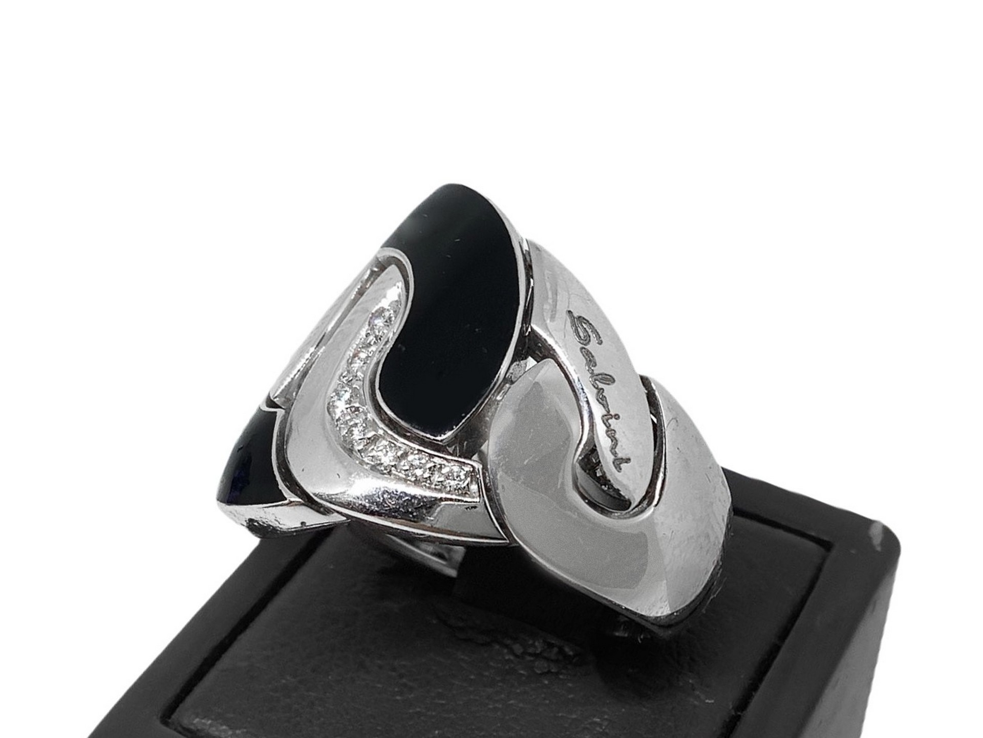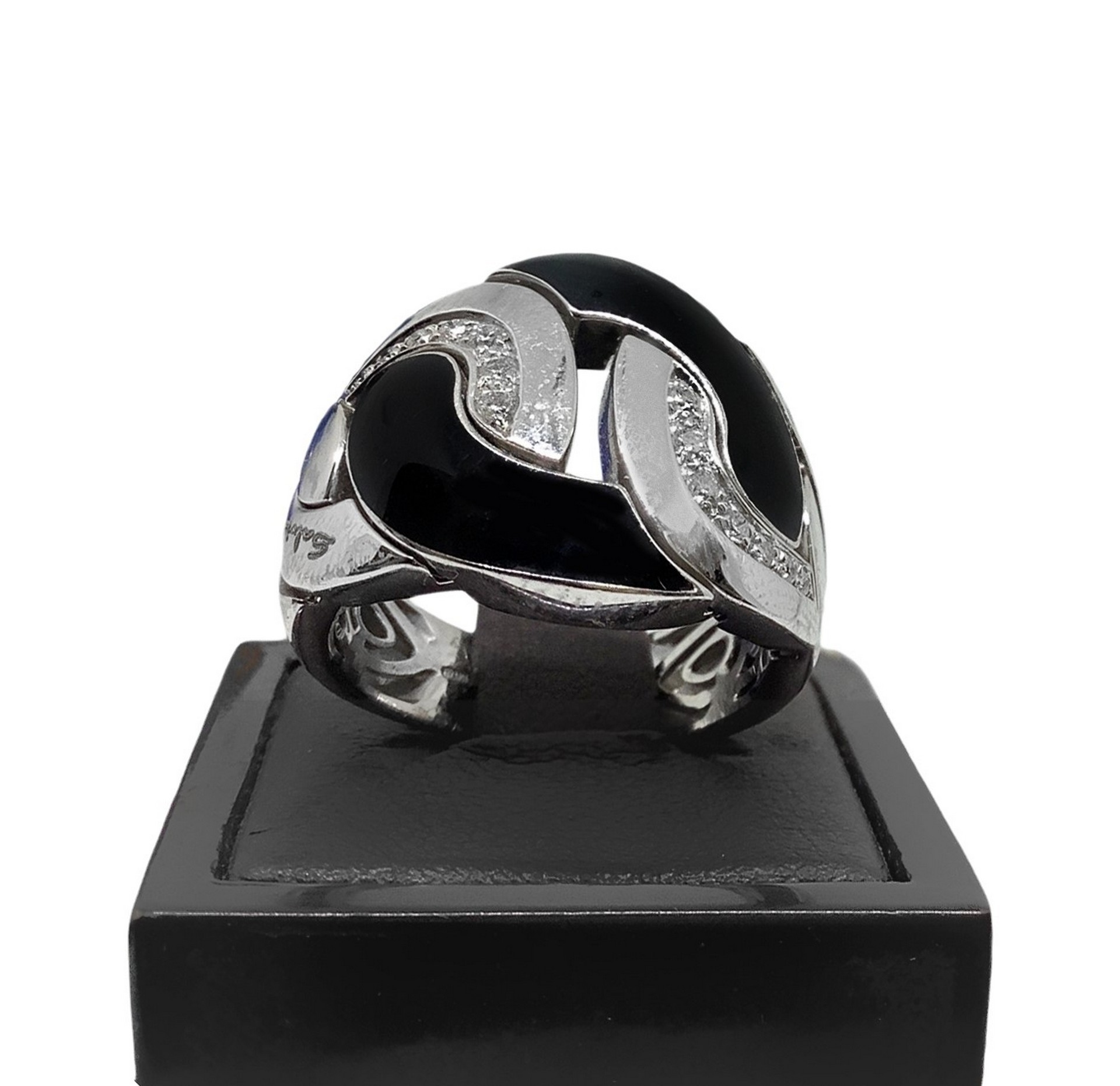 In oro bianco 18kt con diamanti taglio brillante e onice nero. Diamanti 0.17 G COLOR VS. Firmato in alto a destra.