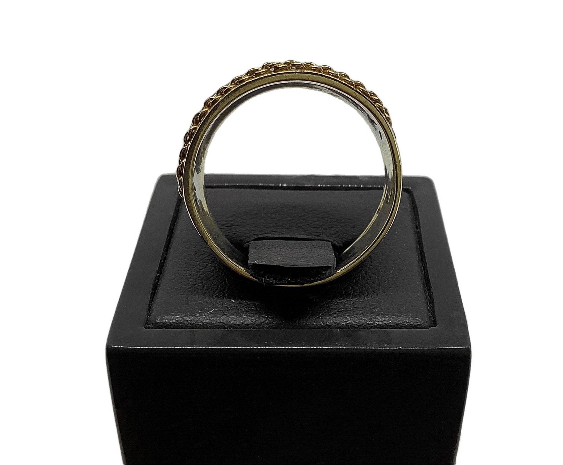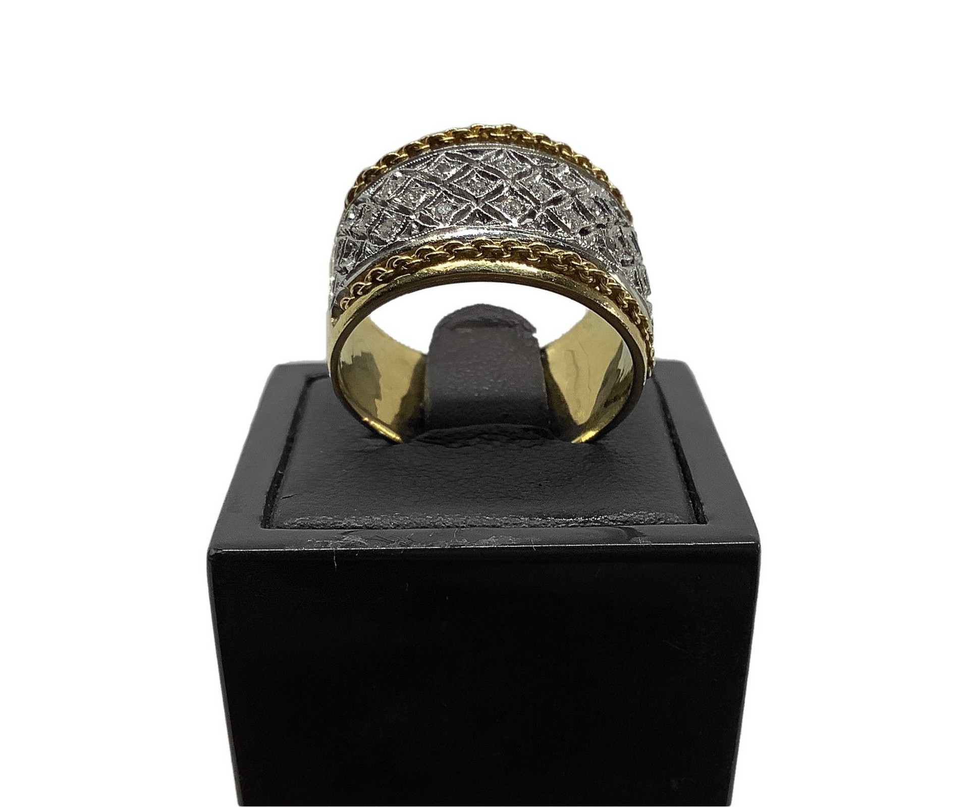 Anello in oro a fascia, 20° secolo 8 gr, misura 15 Anello a fascia in oro giallo, parte centrale in oro bianco con lavorazione a nido d'ape con brillanti.