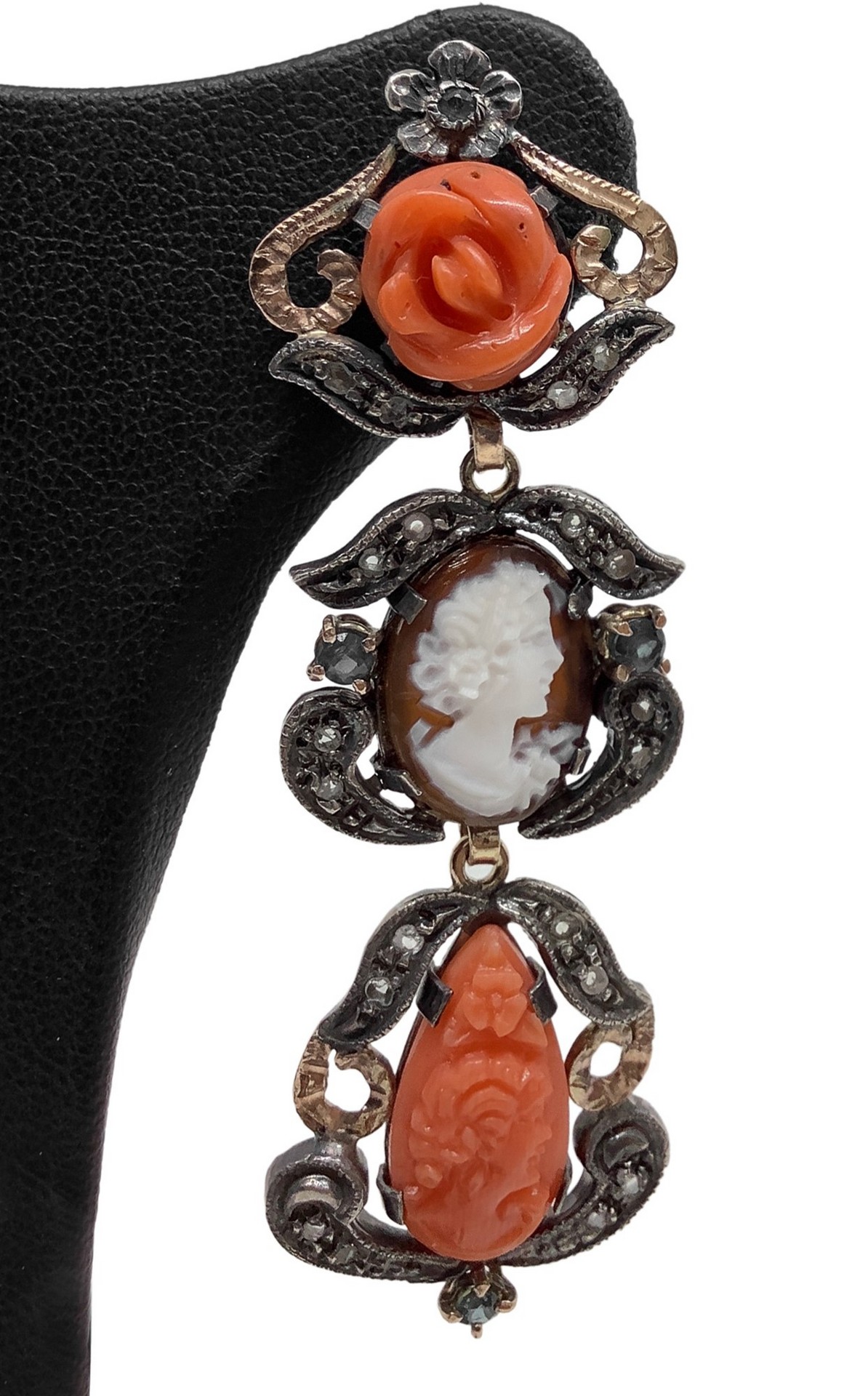 Orecchini pendenti con due cammei incisi, rose di corallo e due cammei a goccia di corallo gr. 20 Oro 9 carati, argento diamanti e zaffari