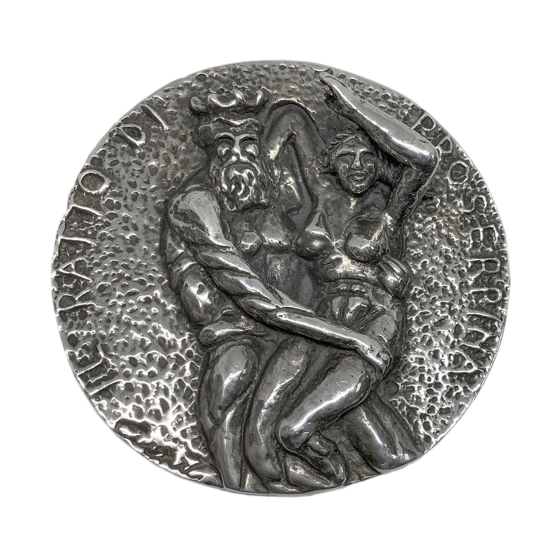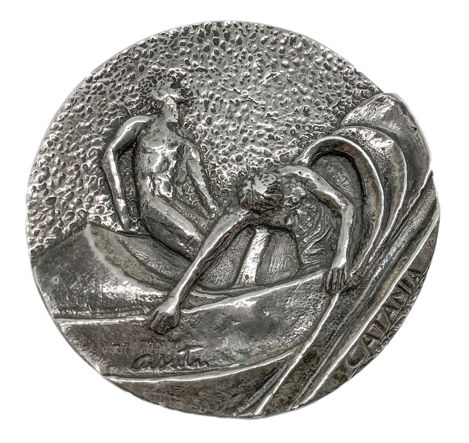 Quattro medaglioni in argento 925 raffiguranti un simbolo di Catania d 6 cm, gr. 389 (Elefante, Porta Uzeta, Ratto di Proserpina e i Malavoglia). Provenienza Fecarotta Catania.