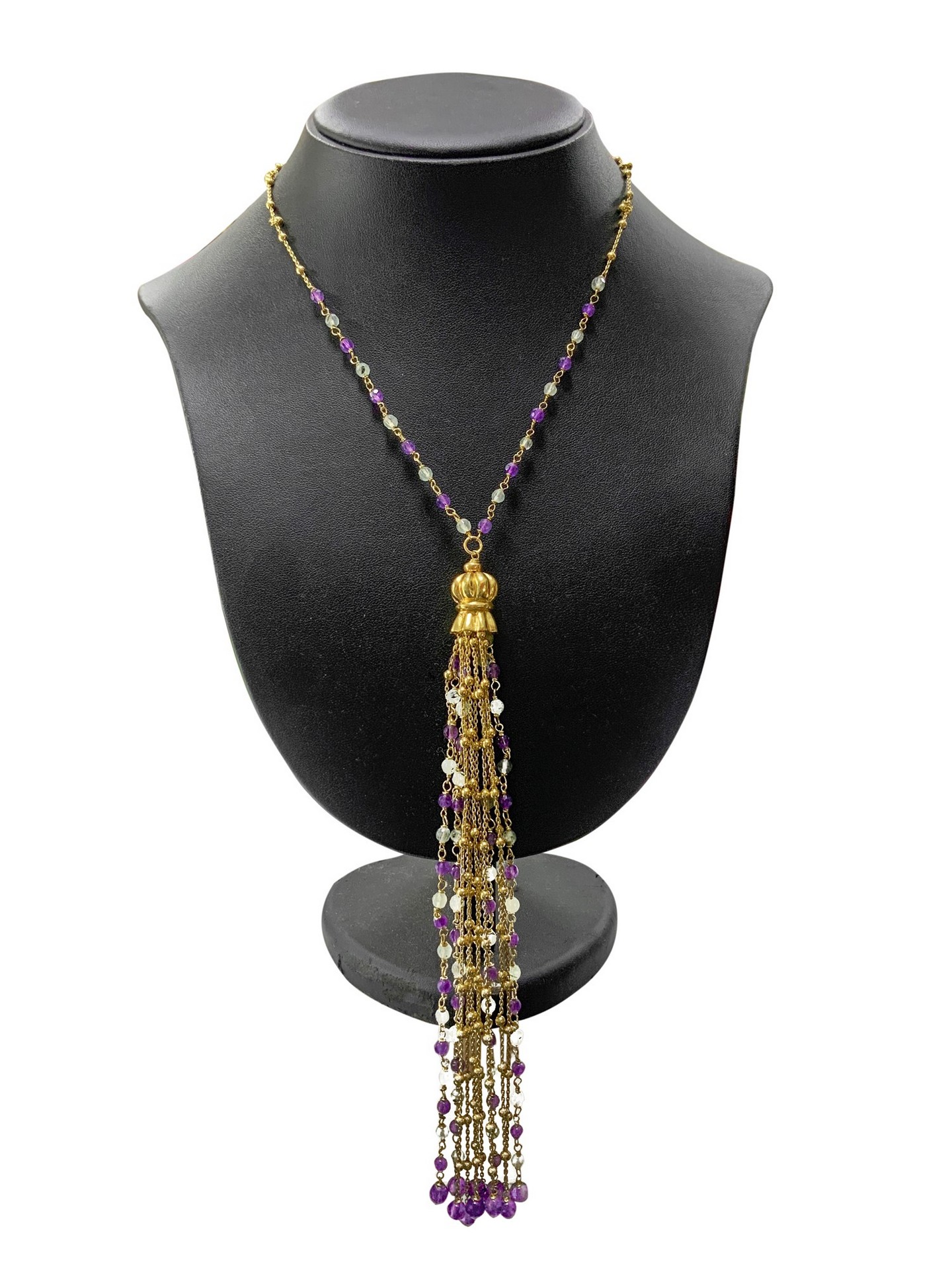 Collana in oro rosso con pietre, 20° secolo Gr. 48,8 Girocollo con bella lavorazione a catena e puntine in oro con parte finale a pendentif in oro, ametista e acquamarina.