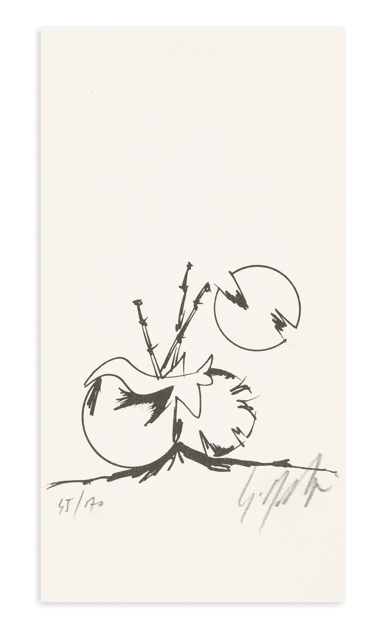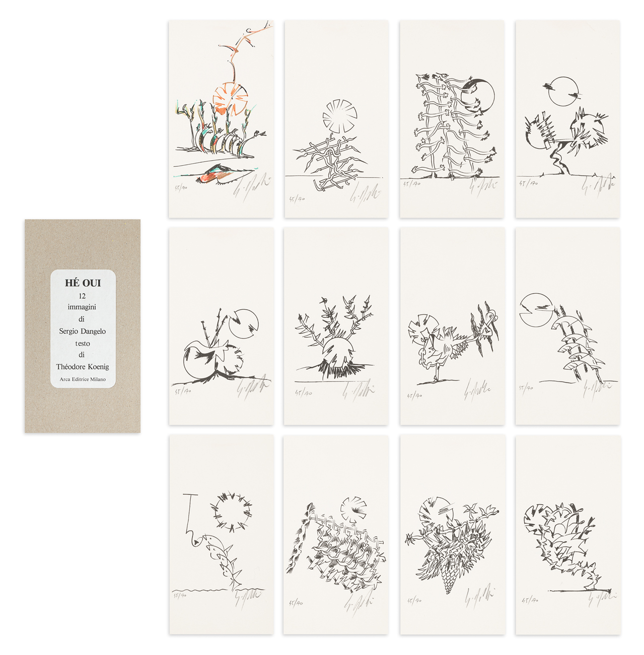 Piccola cartella contenente testo di Théodore Koenig e 12 litografie di Sergio Dangelo, ciascuna recante firma e numerazione (Esemplari 45/70) a matita al fronte
