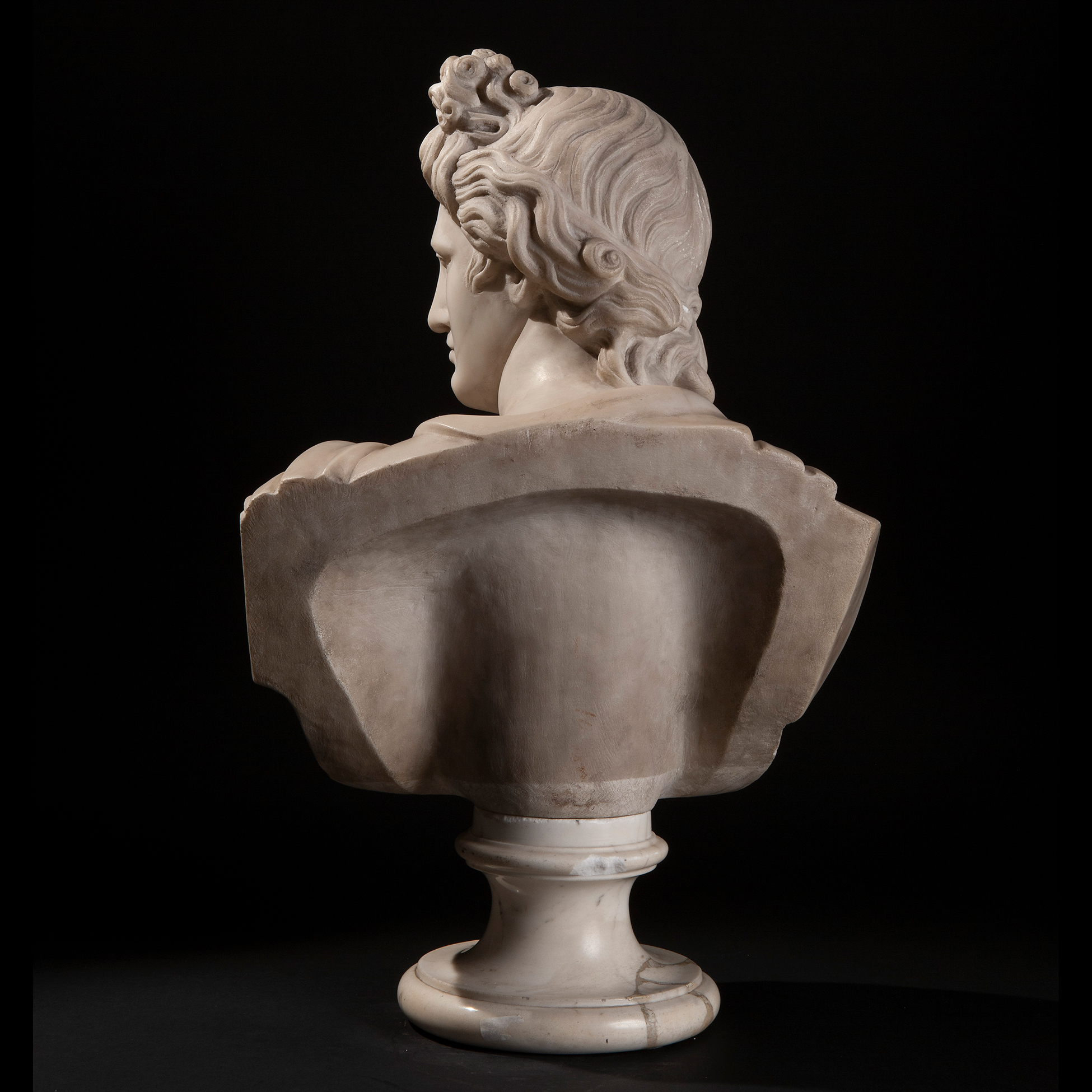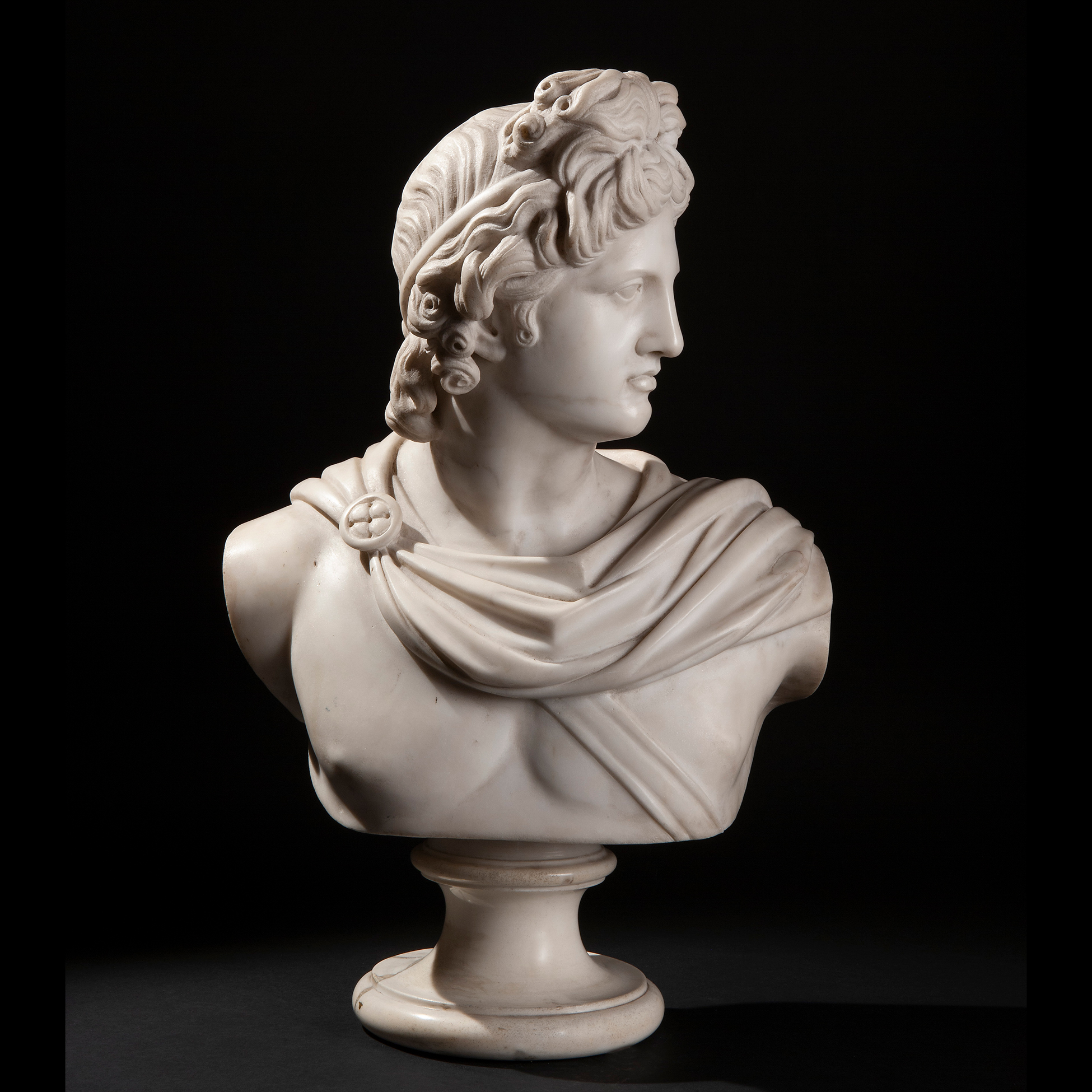 Busto di Apollo, XIX secolo Realizzato in marmo di Carrara su modello dell'Apollo del Belvedere conservato ai Musei Vaticani. Dimensioni 55,5 cm.