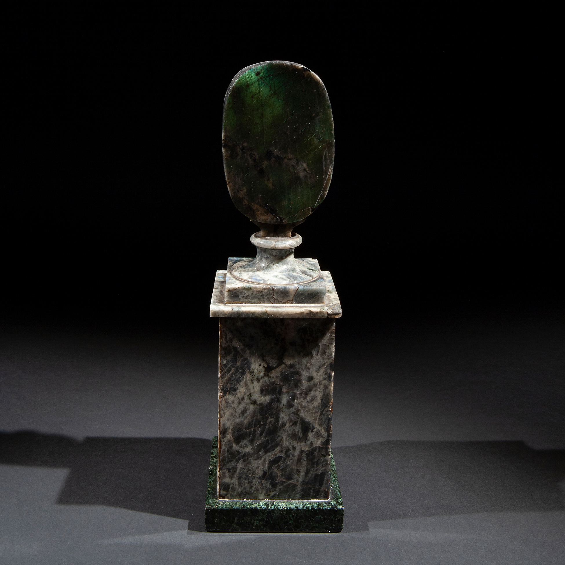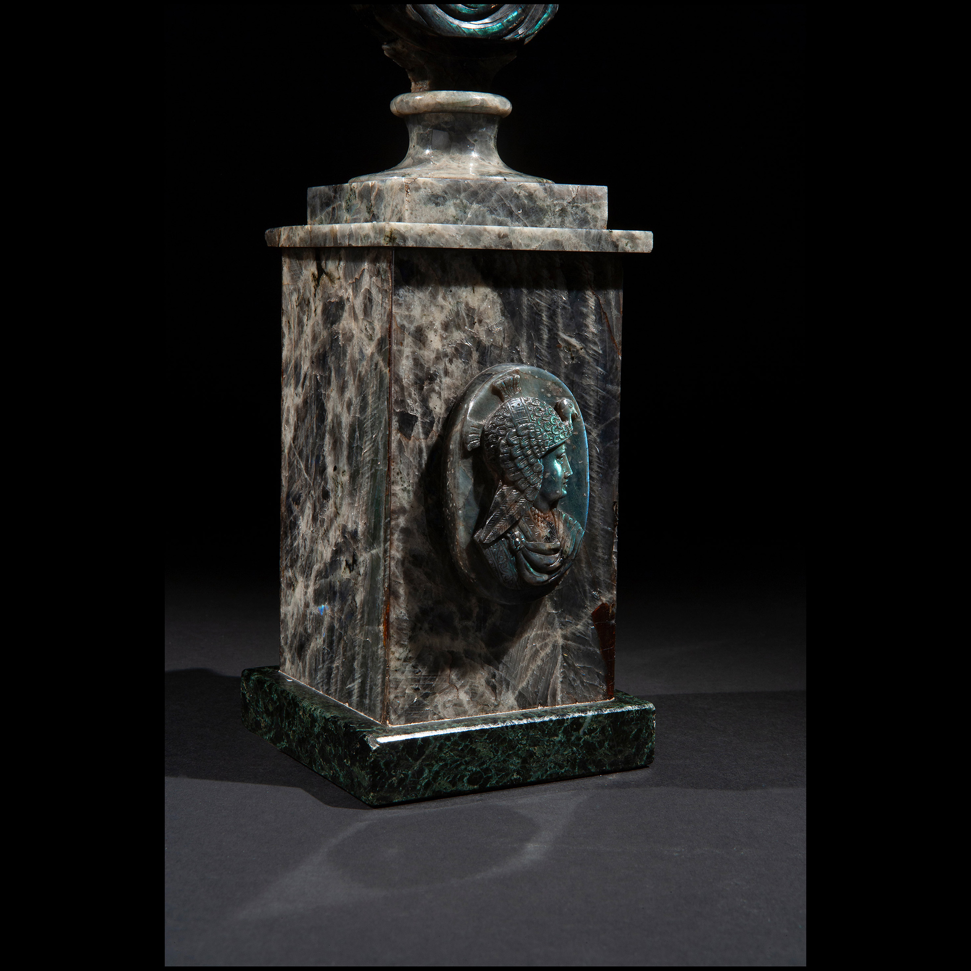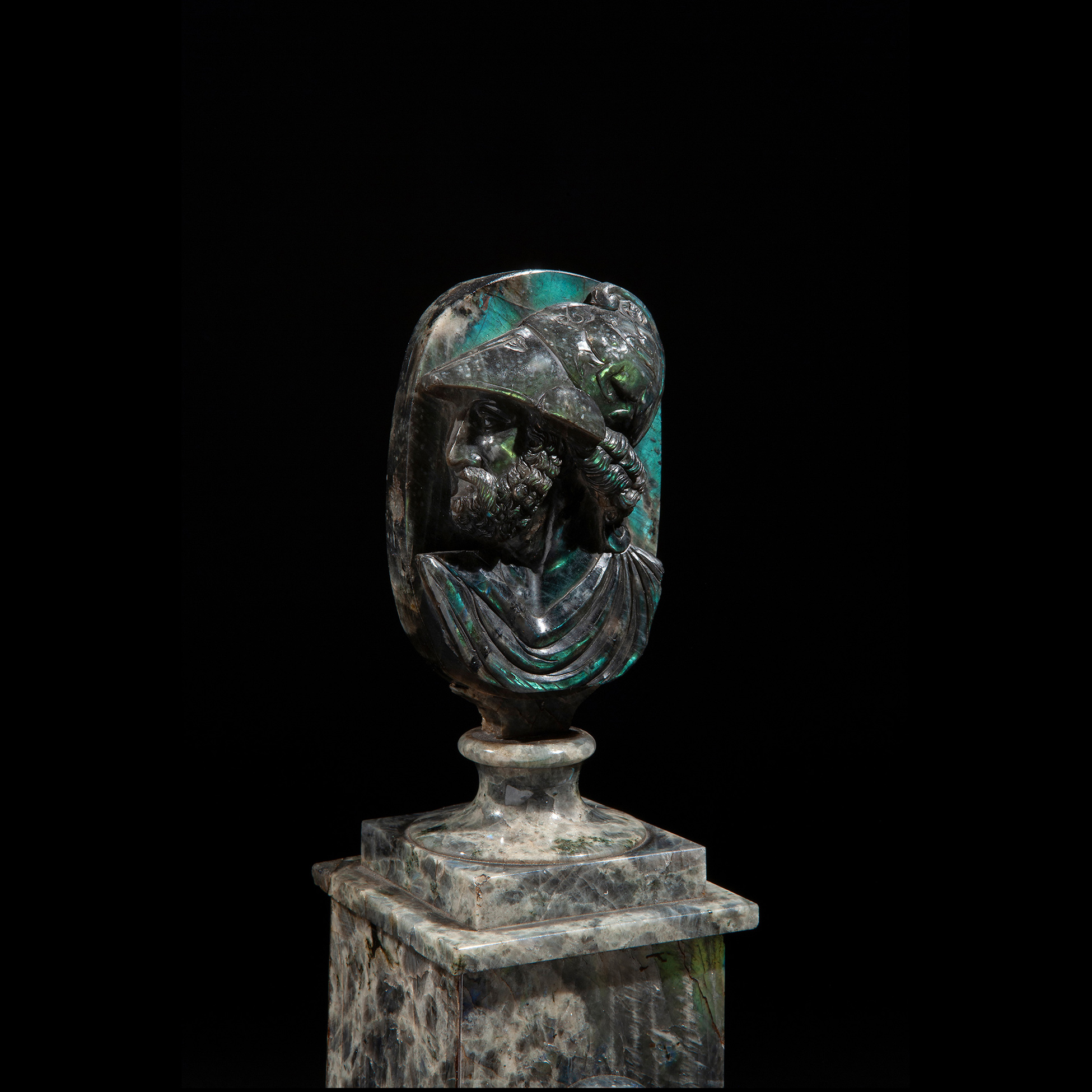 Scultura con effigi di Menelao e Cleopatra, Italia o Francia, fine XIX inizi del XX secolo Rilievi e base in Labradorite e marmo verde. Dimensioni 30x8x8 cm.