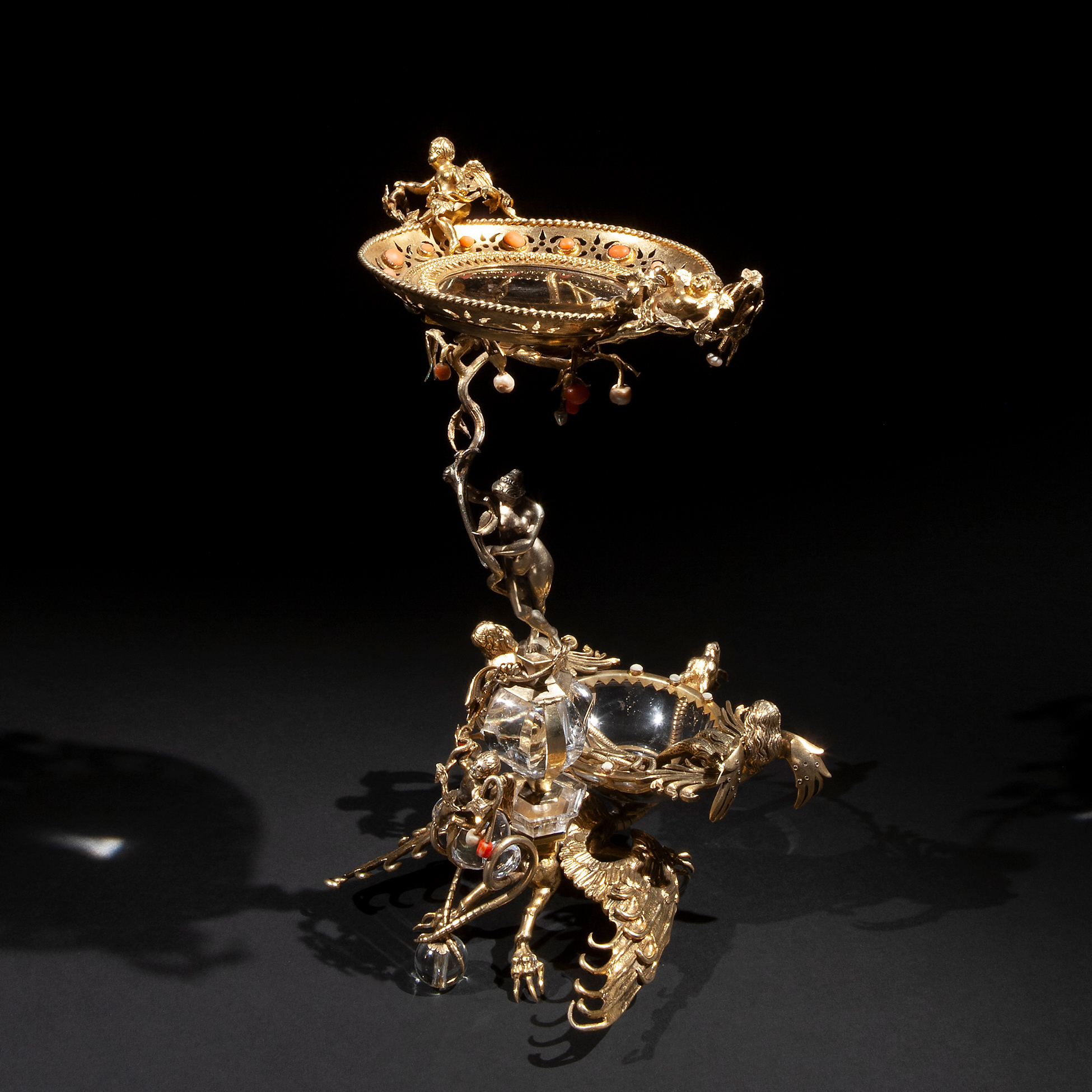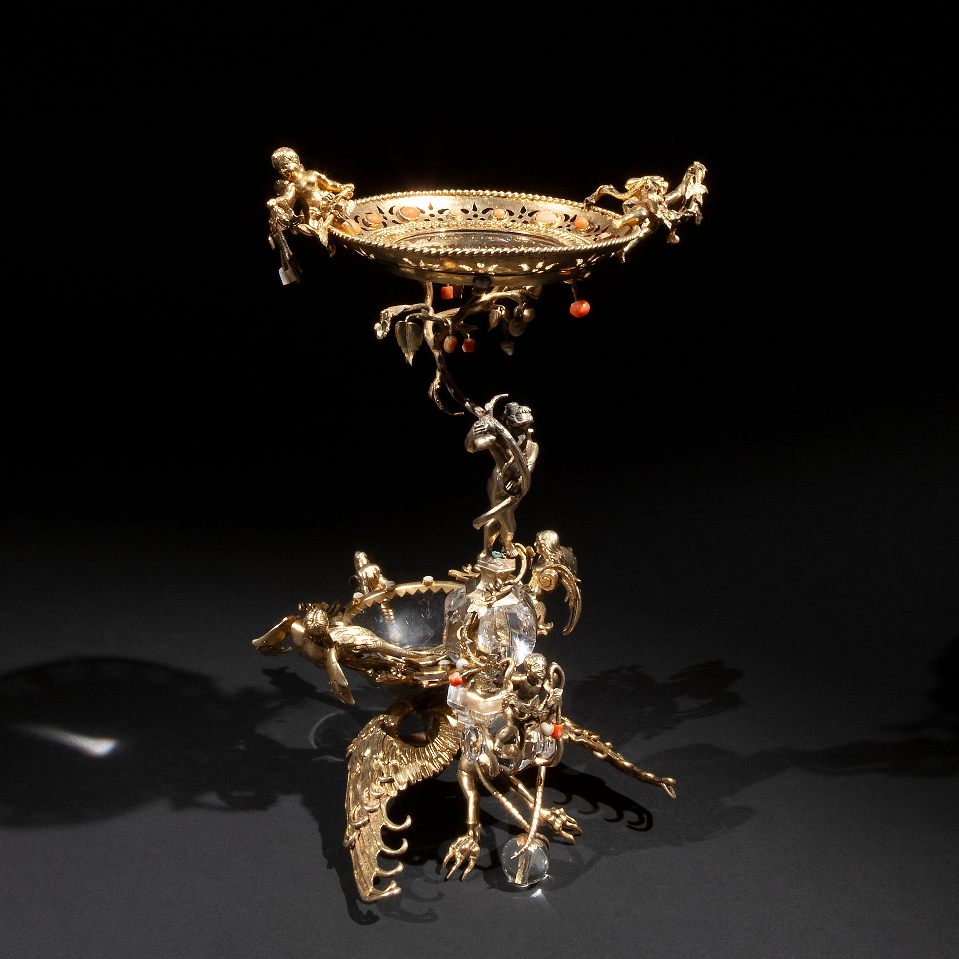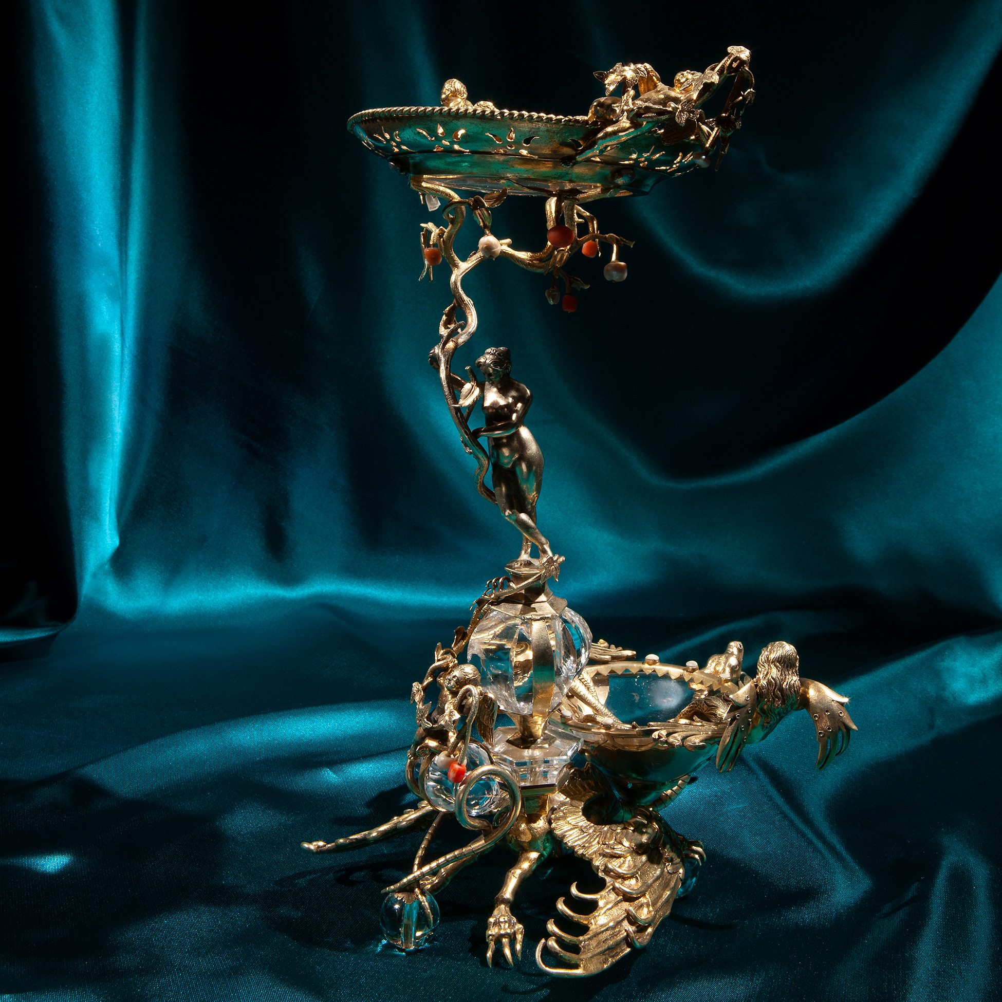 Alzata in cristallo, argento dorato e coralli, manifattura nordeuropea della fine del XIX secolo L'oggetto presenta una ricca decorazione di animali, putti e una Venere che regge il piatto centrale. Presenti lievi mancanze. Dimensioni 28x16,5x16,5 cm.