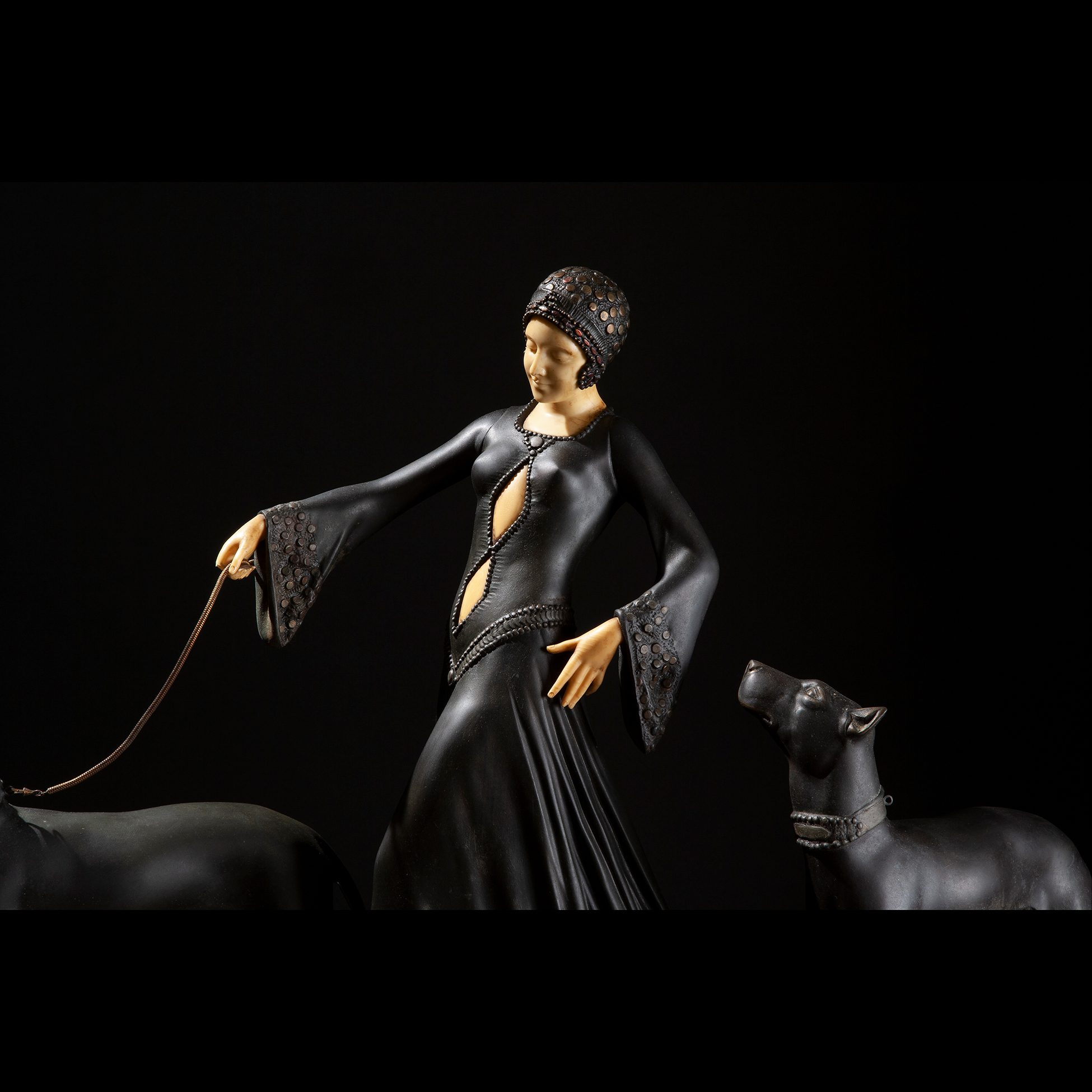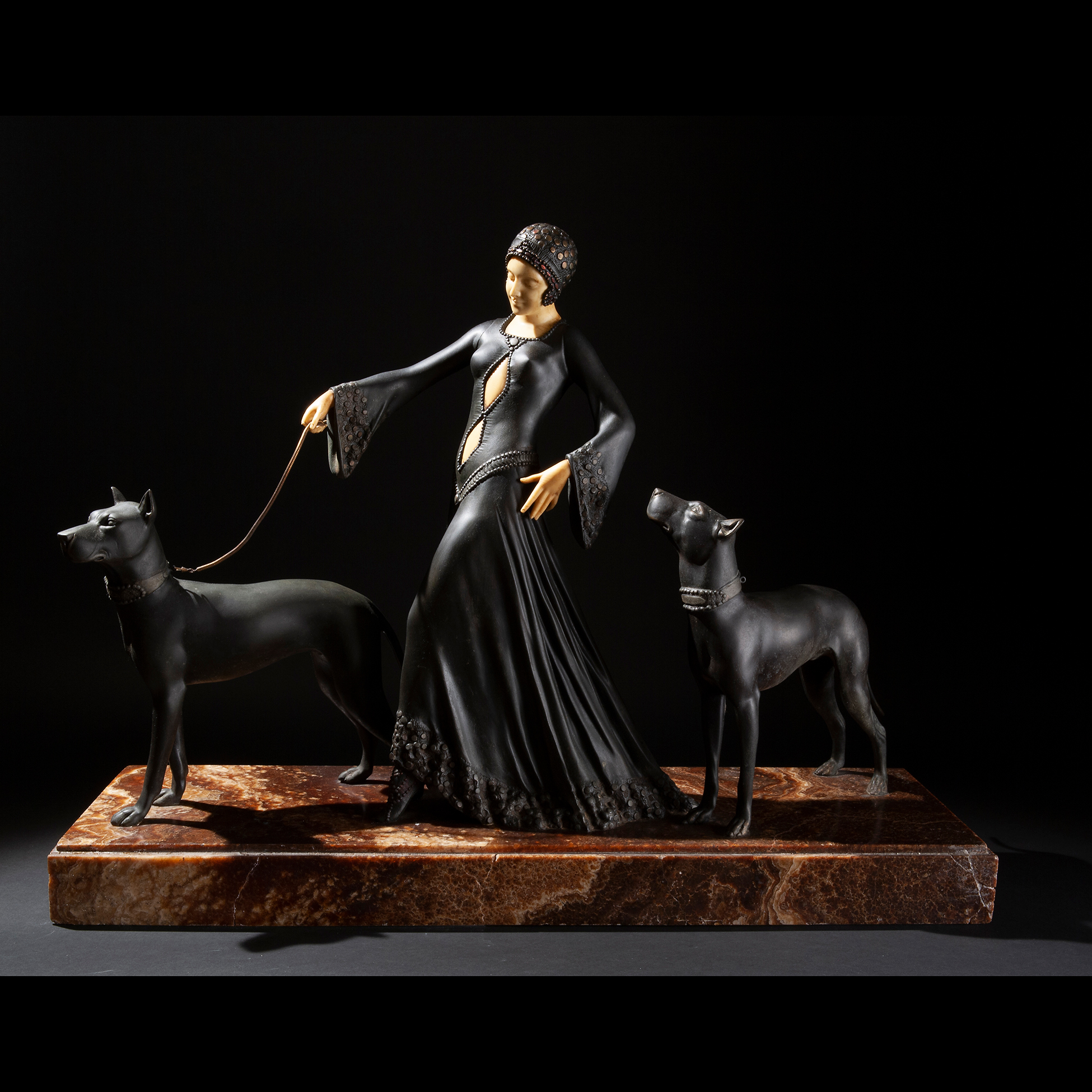 Scultura Liberty in bronzo e avorio, Francia XX secolo Scultura raffigurante una donna accompagnata da due cani. Dimensioni 53x71x21,5 cm.