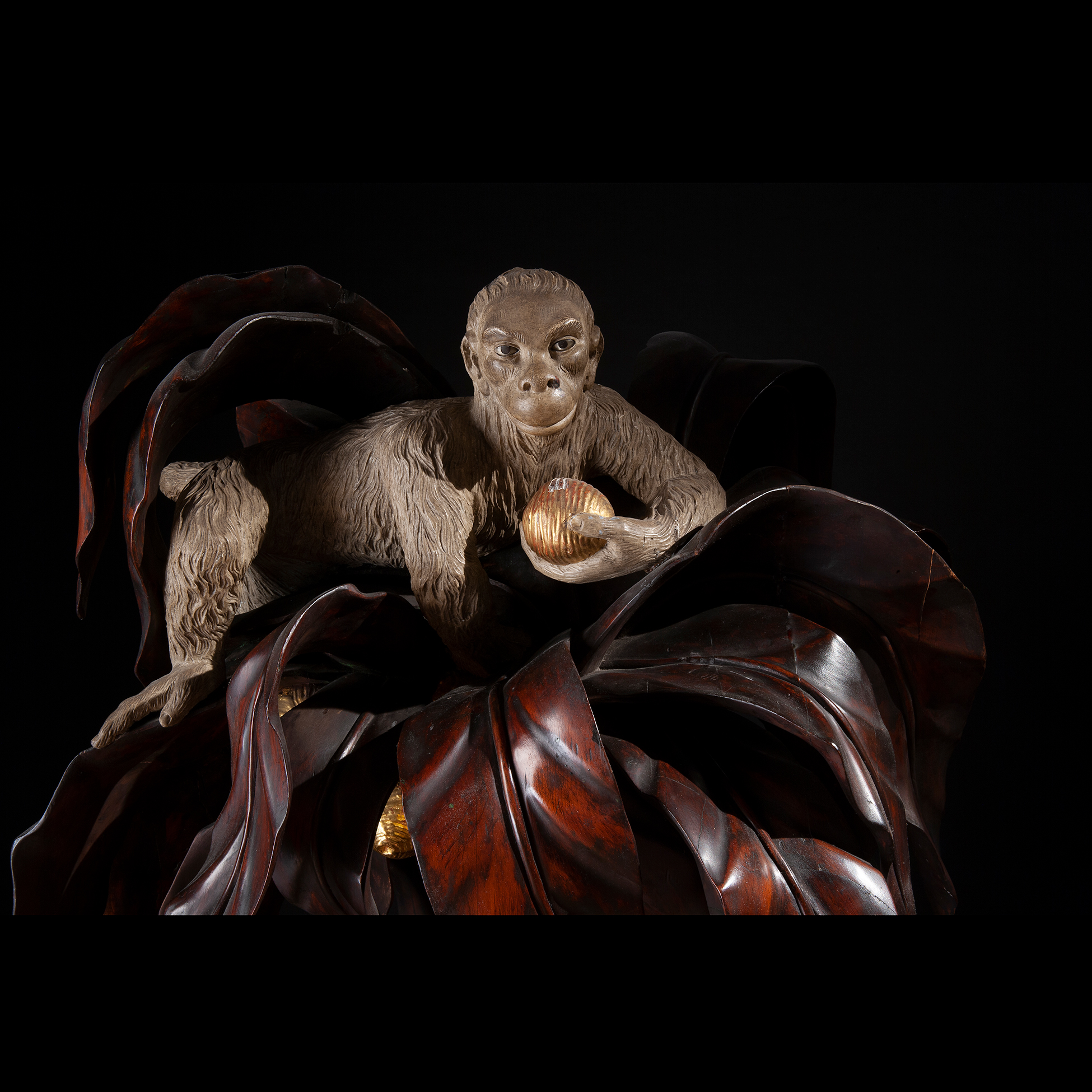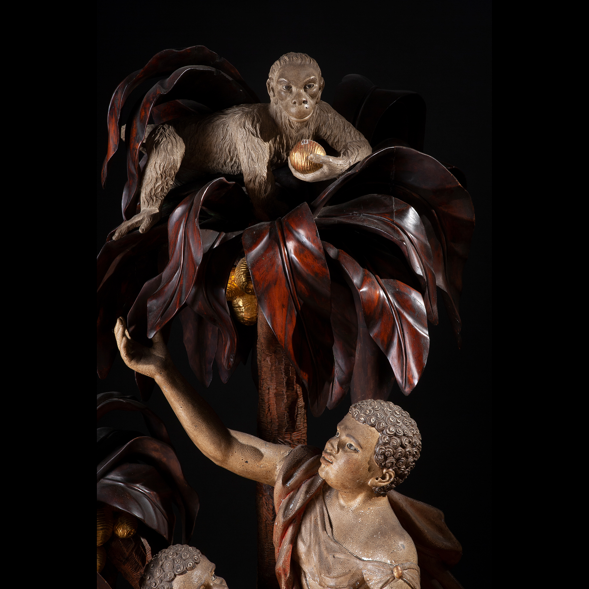 Importante scultura in legno policromo, Napoli XVIII secolo Probabilmente parte di un complesso presepe monumentale esposto nel Settecento presso la Reggia di Caserta, il soggetto rappresenta due moretti che raccolgono i frutti di una palma, su cui è ar