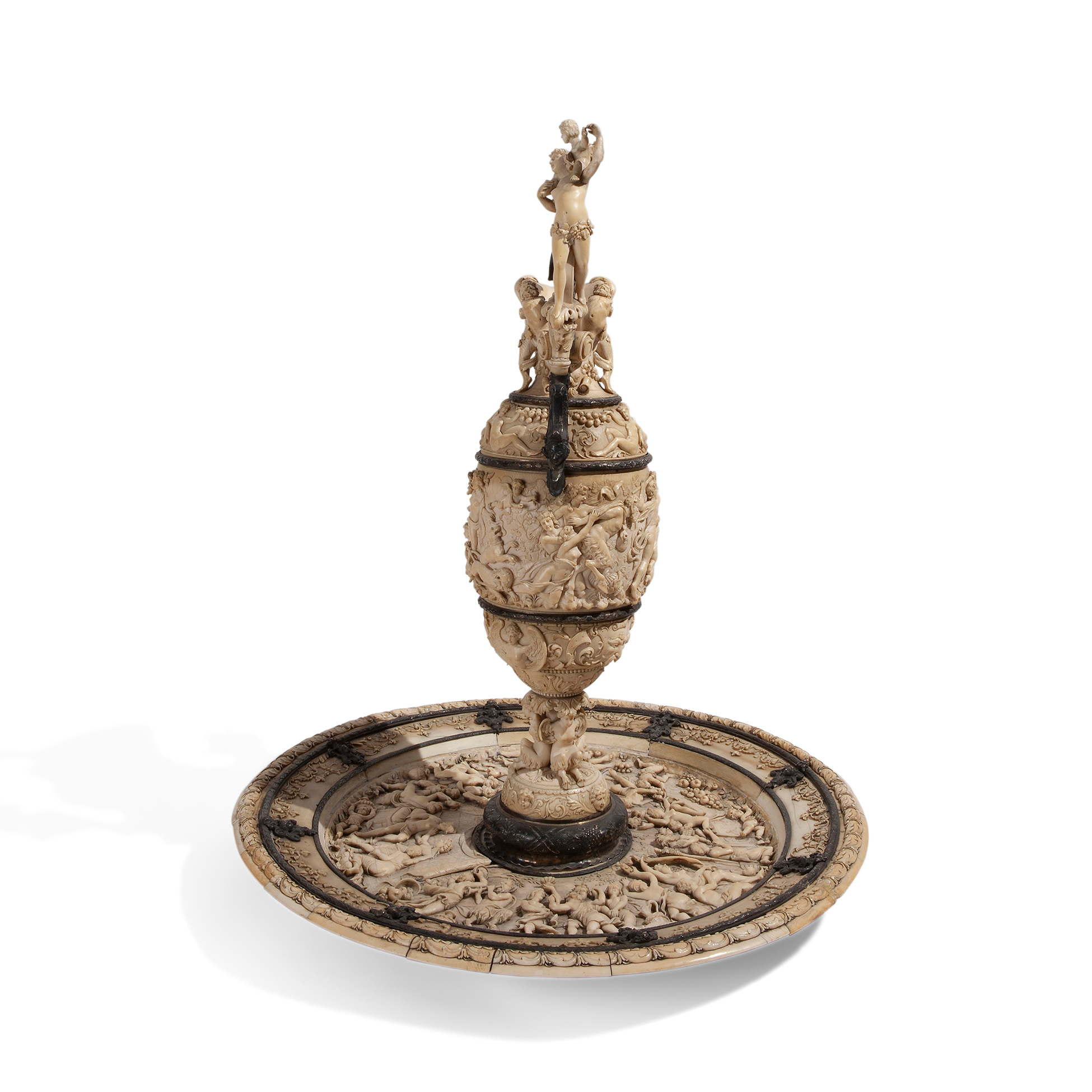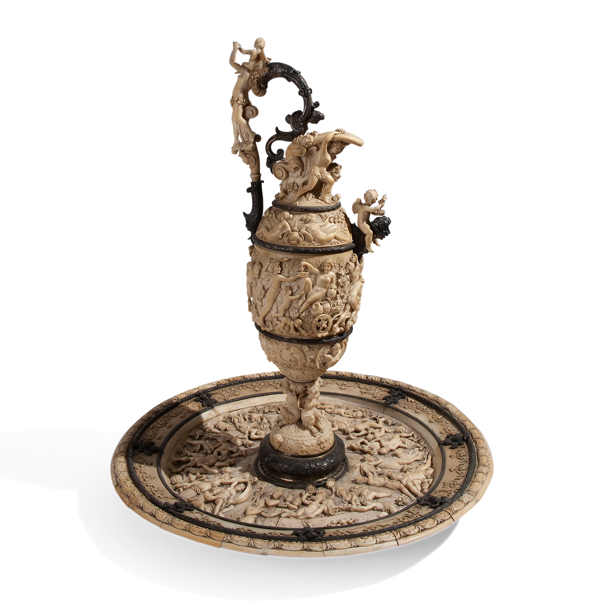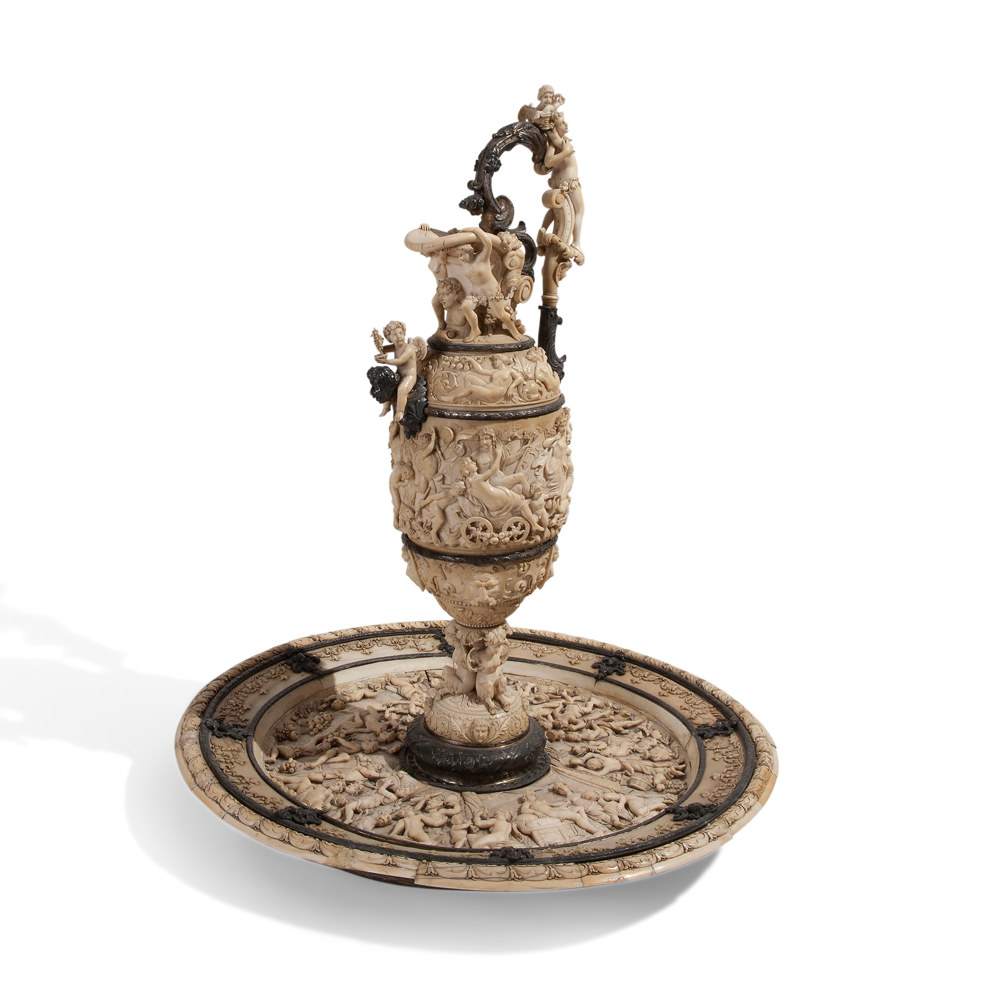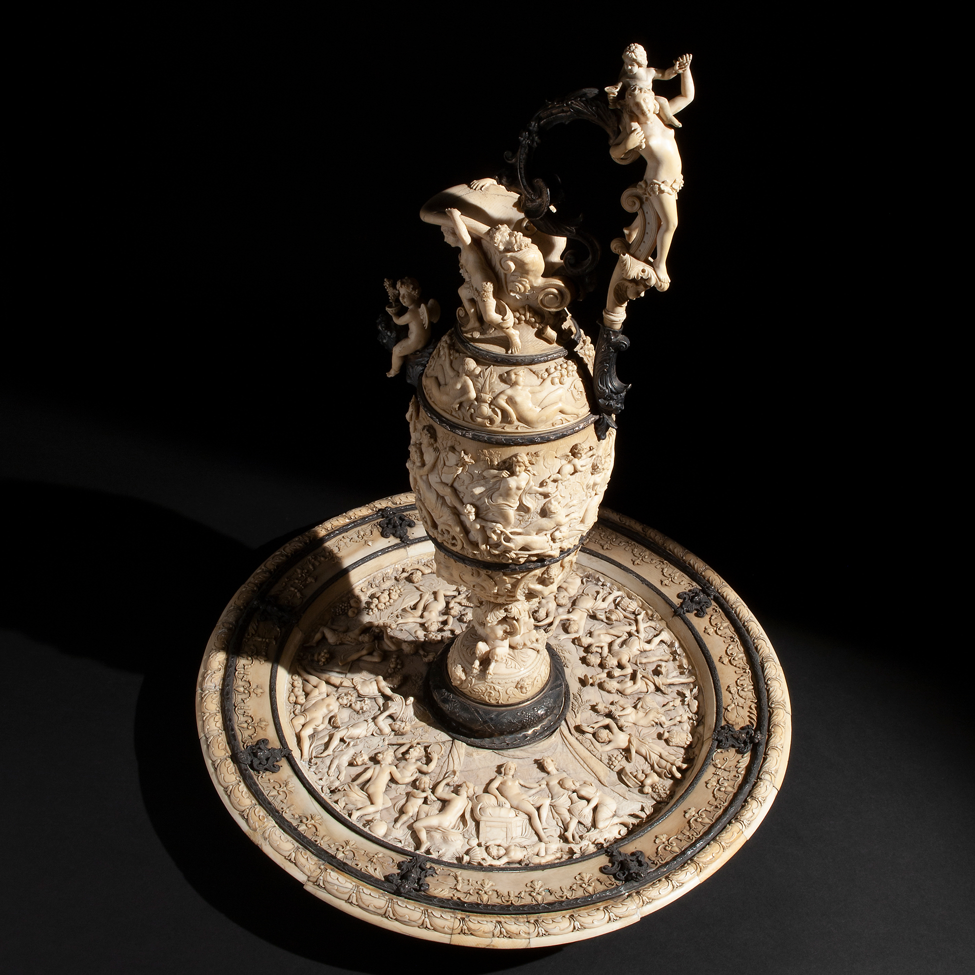 Importante piatto e versatoio avorio, Germania prima metà del XIX secolo Il bassorilievo centrale del piatto ospita Venere e Amore, mentre nella parte circostante è raffigurato un ricco baccanale. Il versatoio è decorato a motivi classici e allegorici,