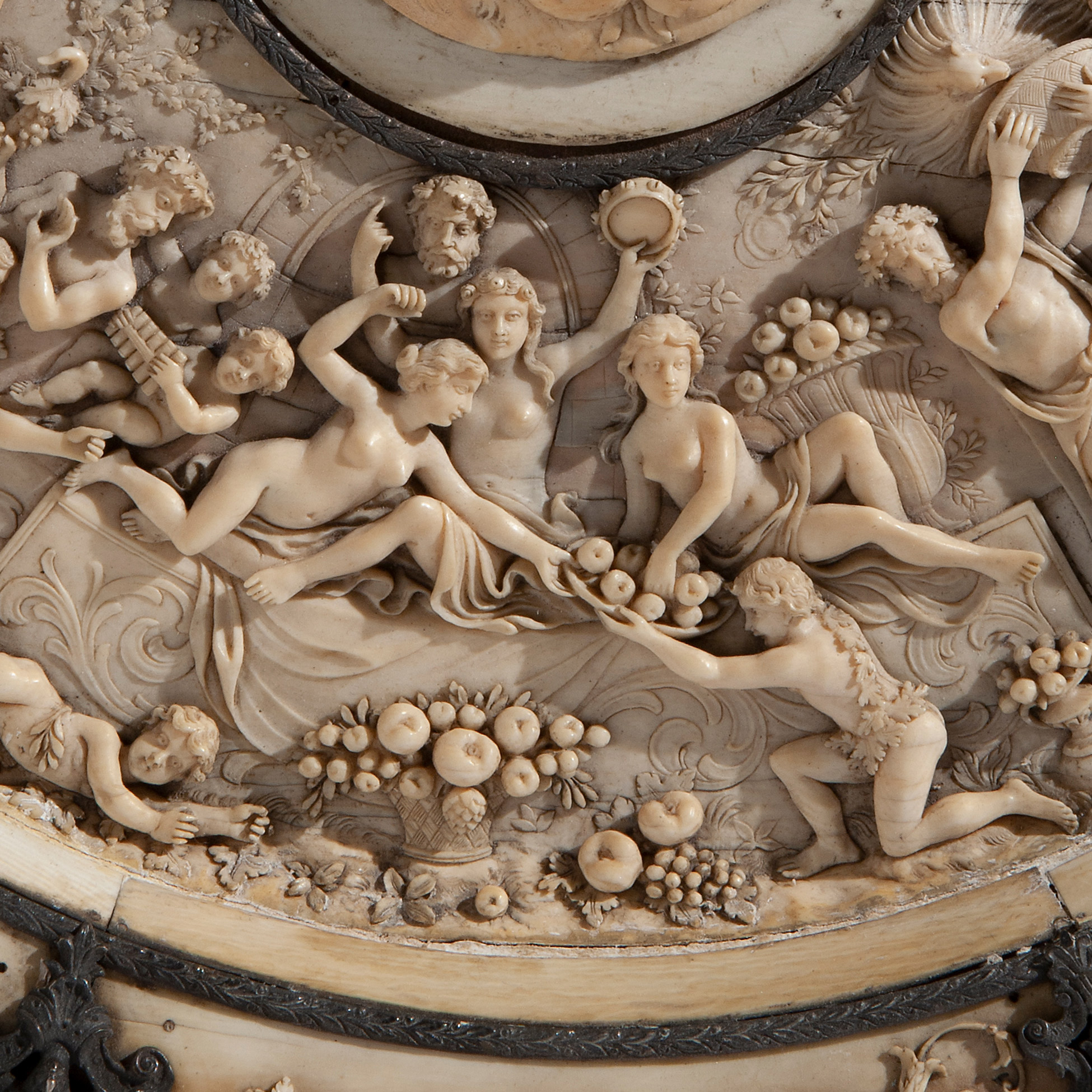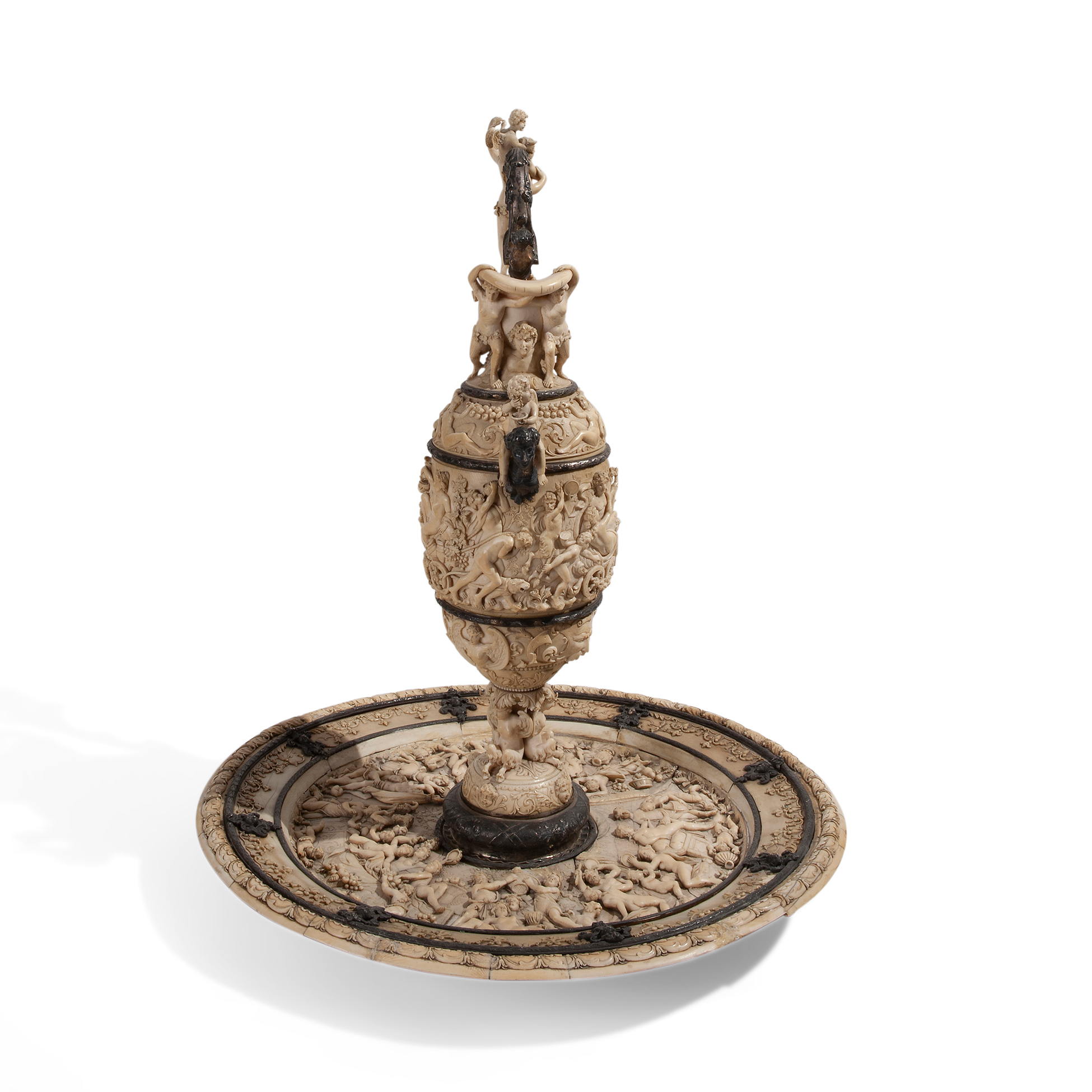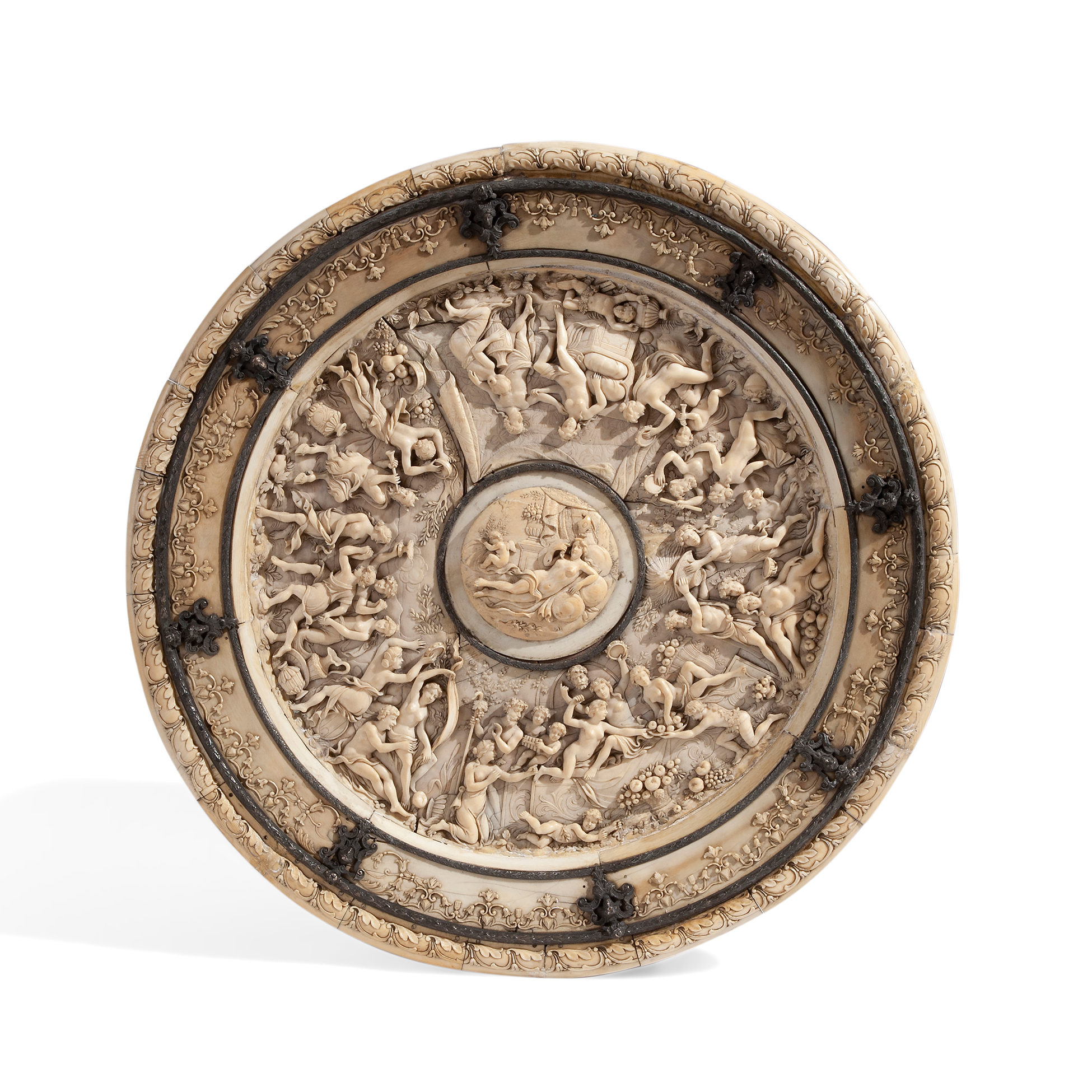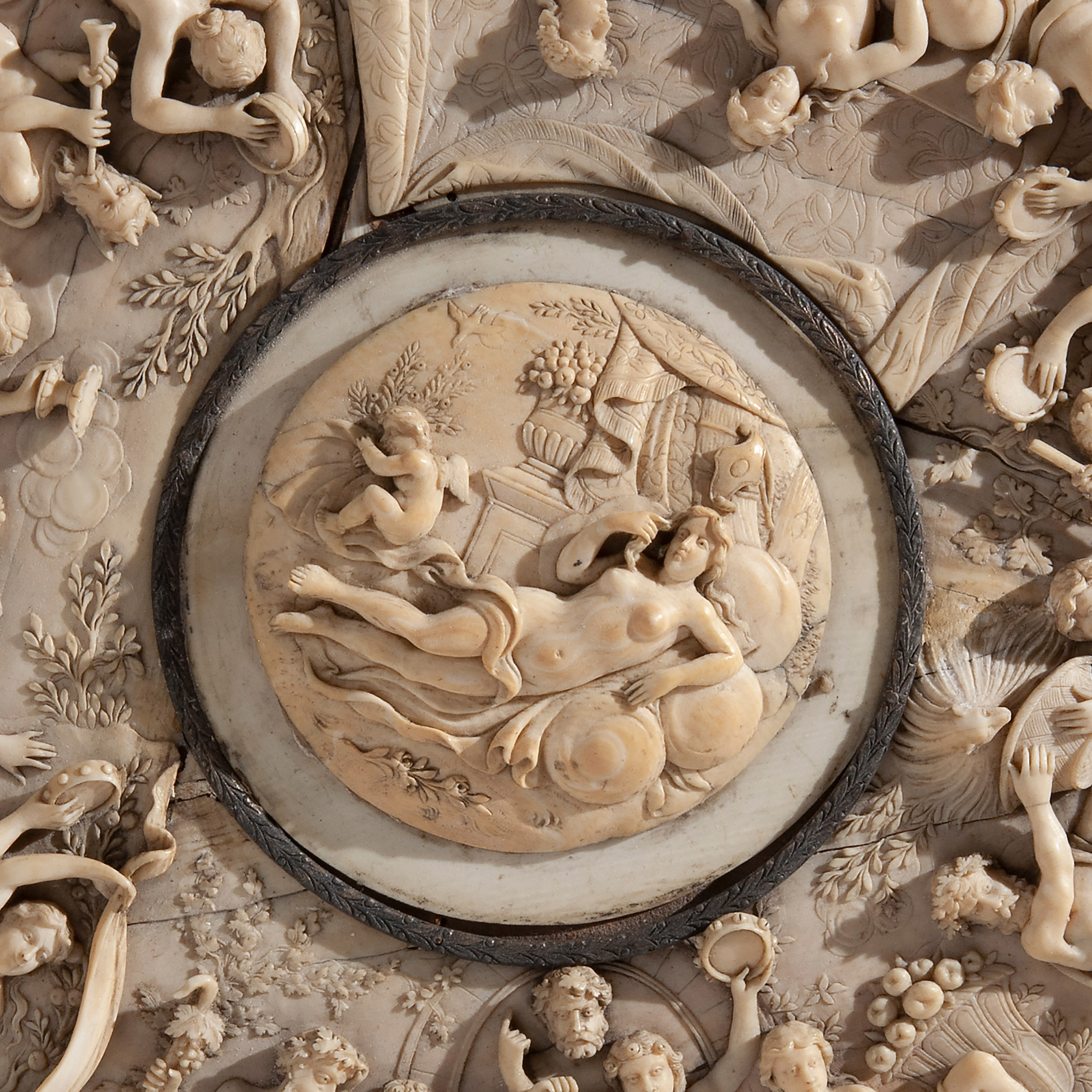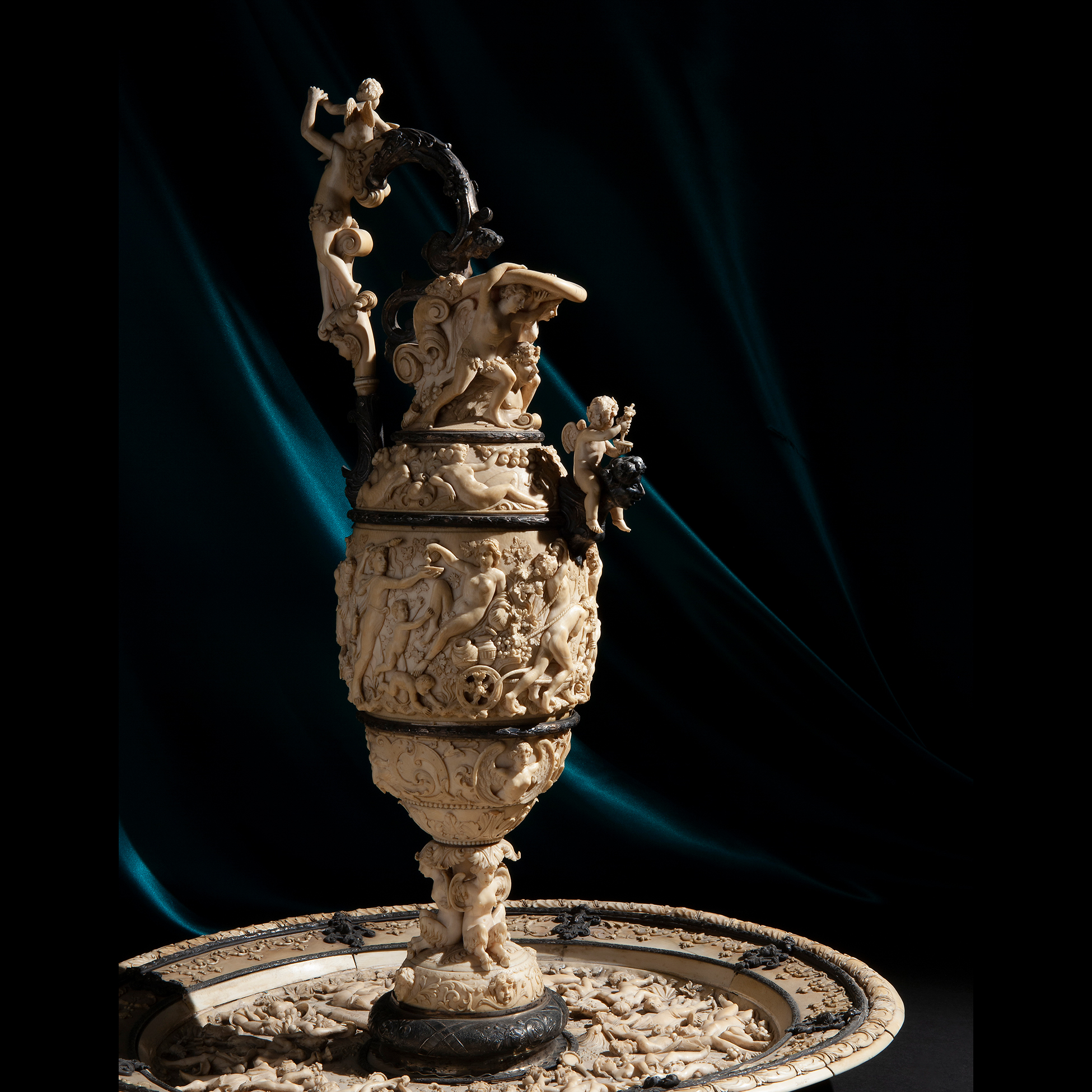 Importante piatto e versatoio avorio, Germania prima metà del XIX secolo Il bassorilievo centrale del piatto ospita Venere e Amore, mentre nella parte circostante è raffigurato un ricco baccanale. Il versatoio è decorato a motivi classici e allegorici,