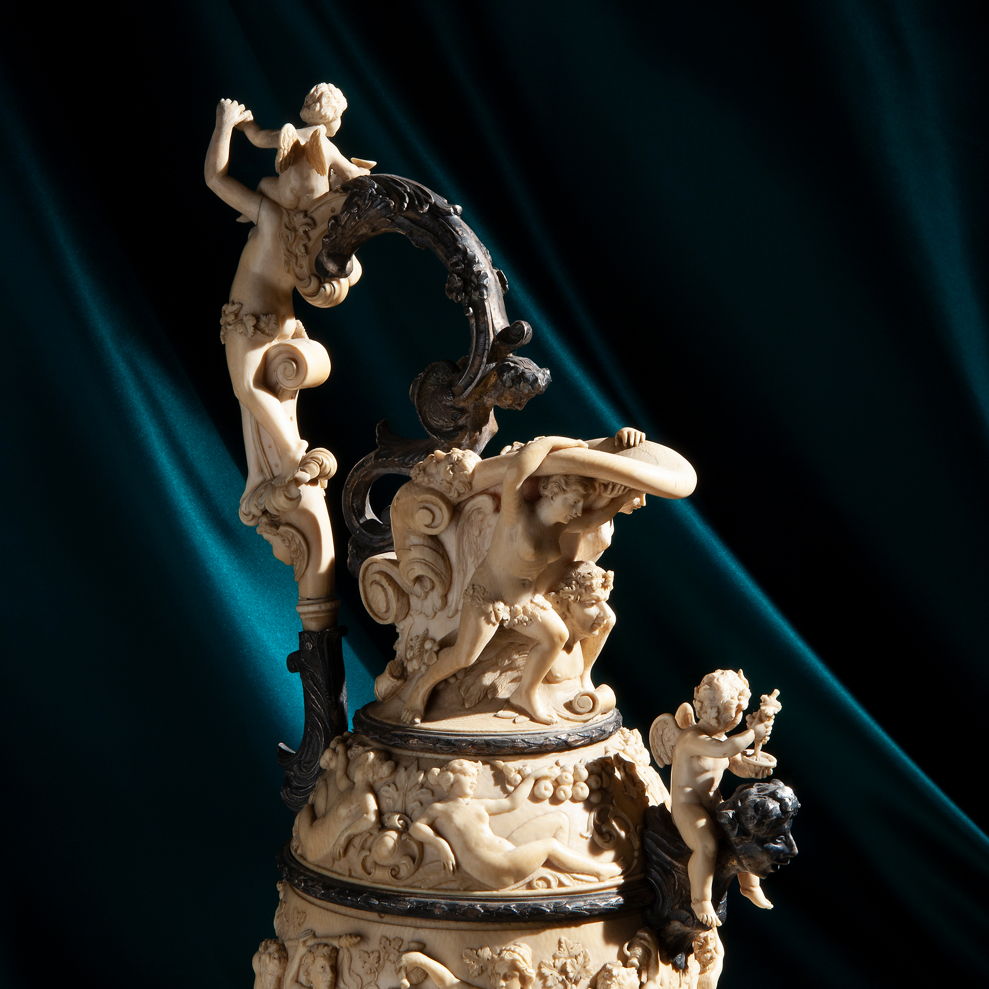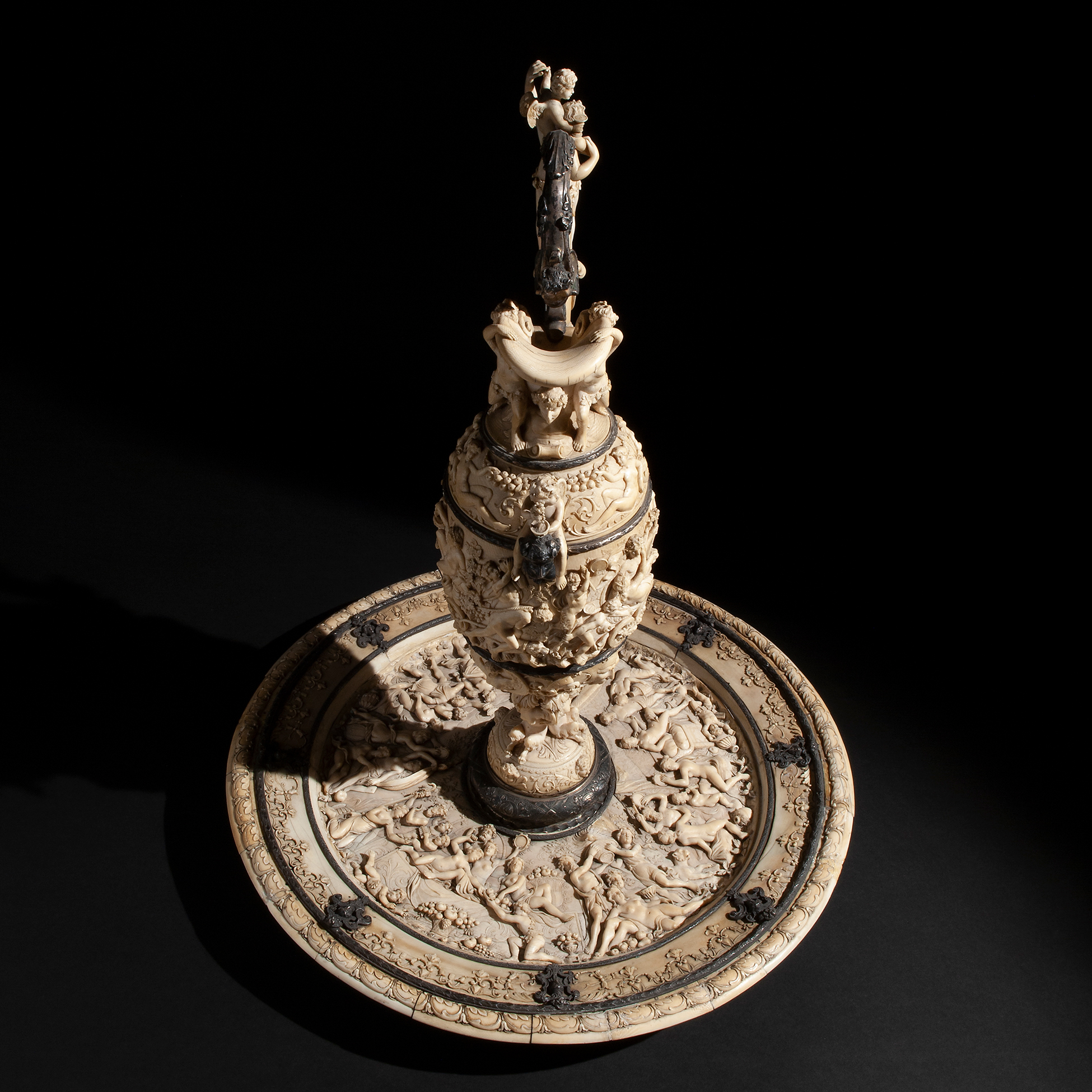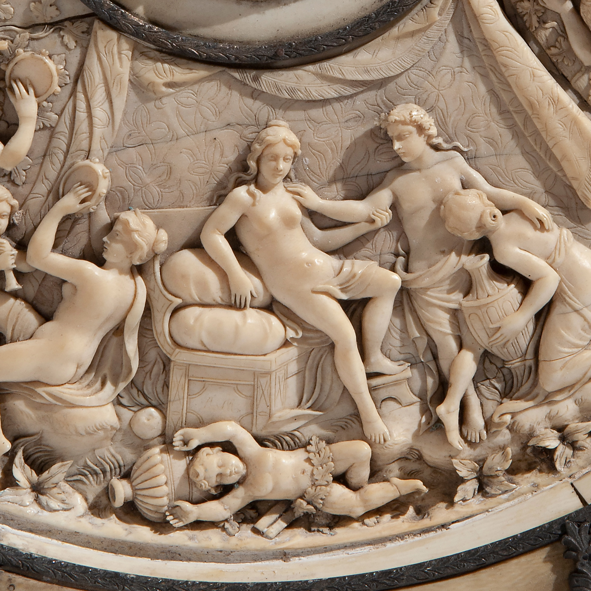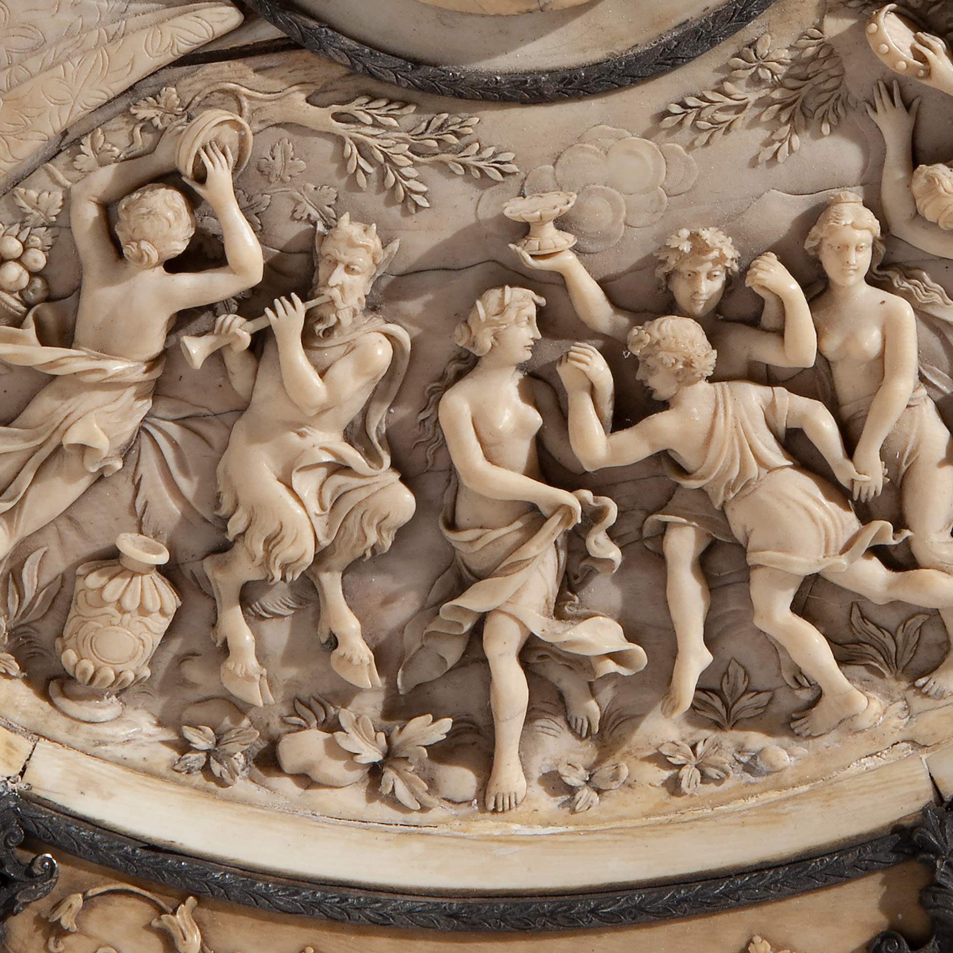 Importante piatto e versatoio avorio, Germania prima metà del XIX secolo Il bassorilievo centrale del piatto ospita Venere e Amore, mentre nella parte circostante è raffigurato un ricco baccanale. Il versatoio è decorato a motivi classici e allegorici,