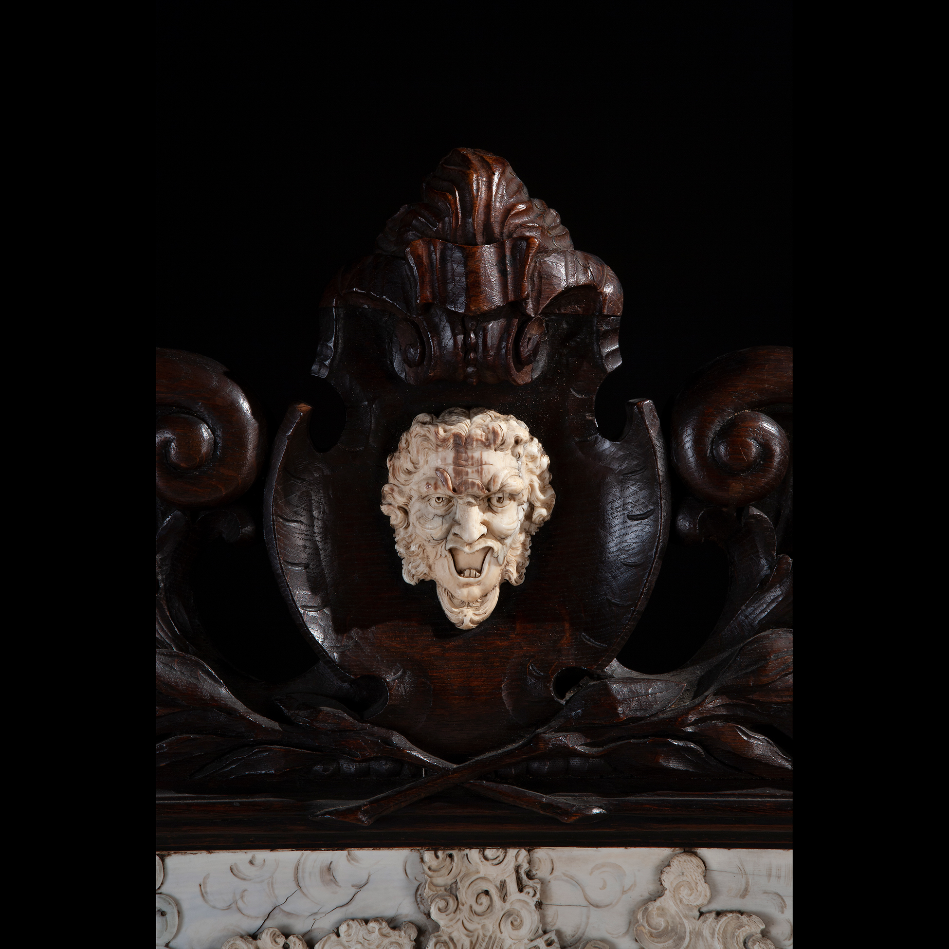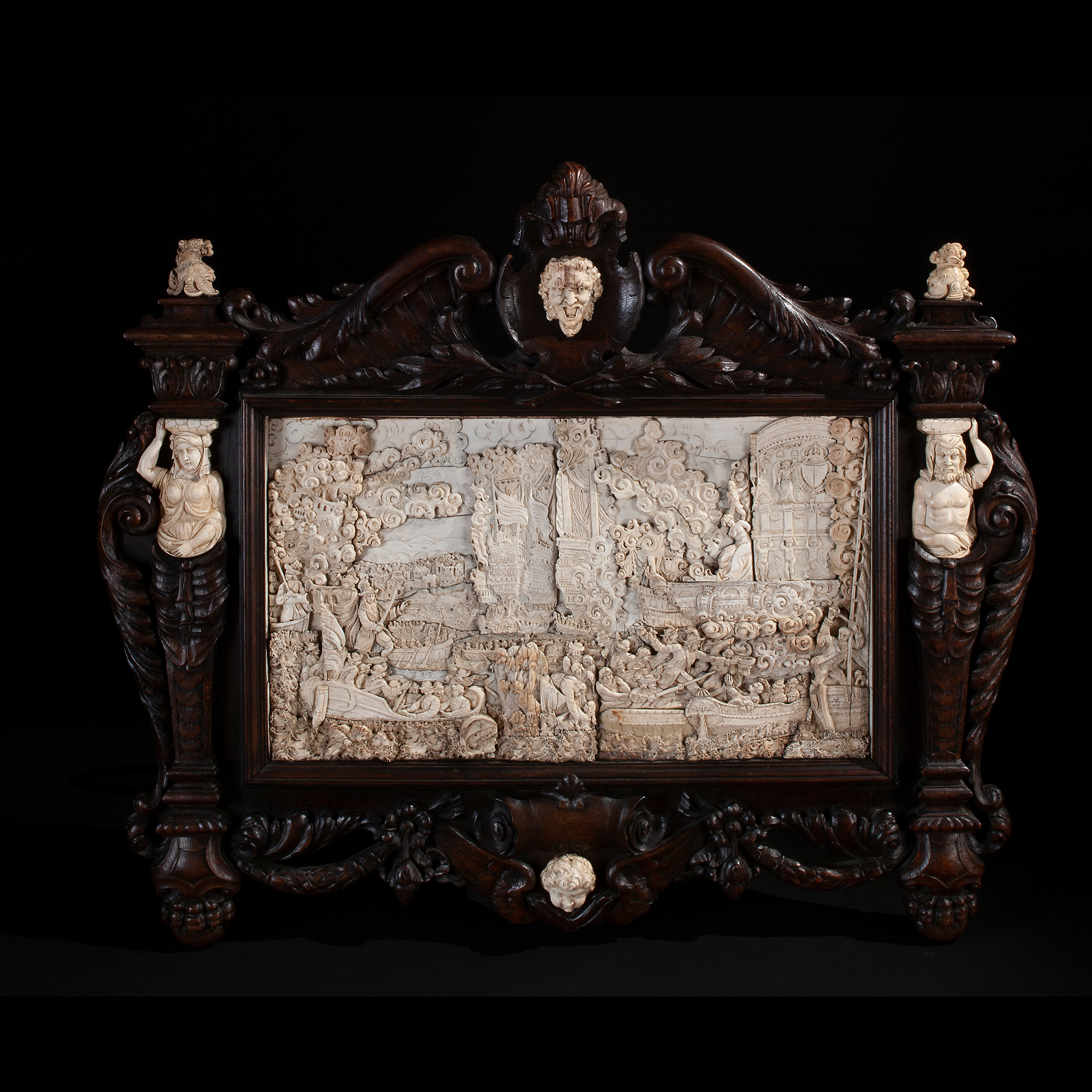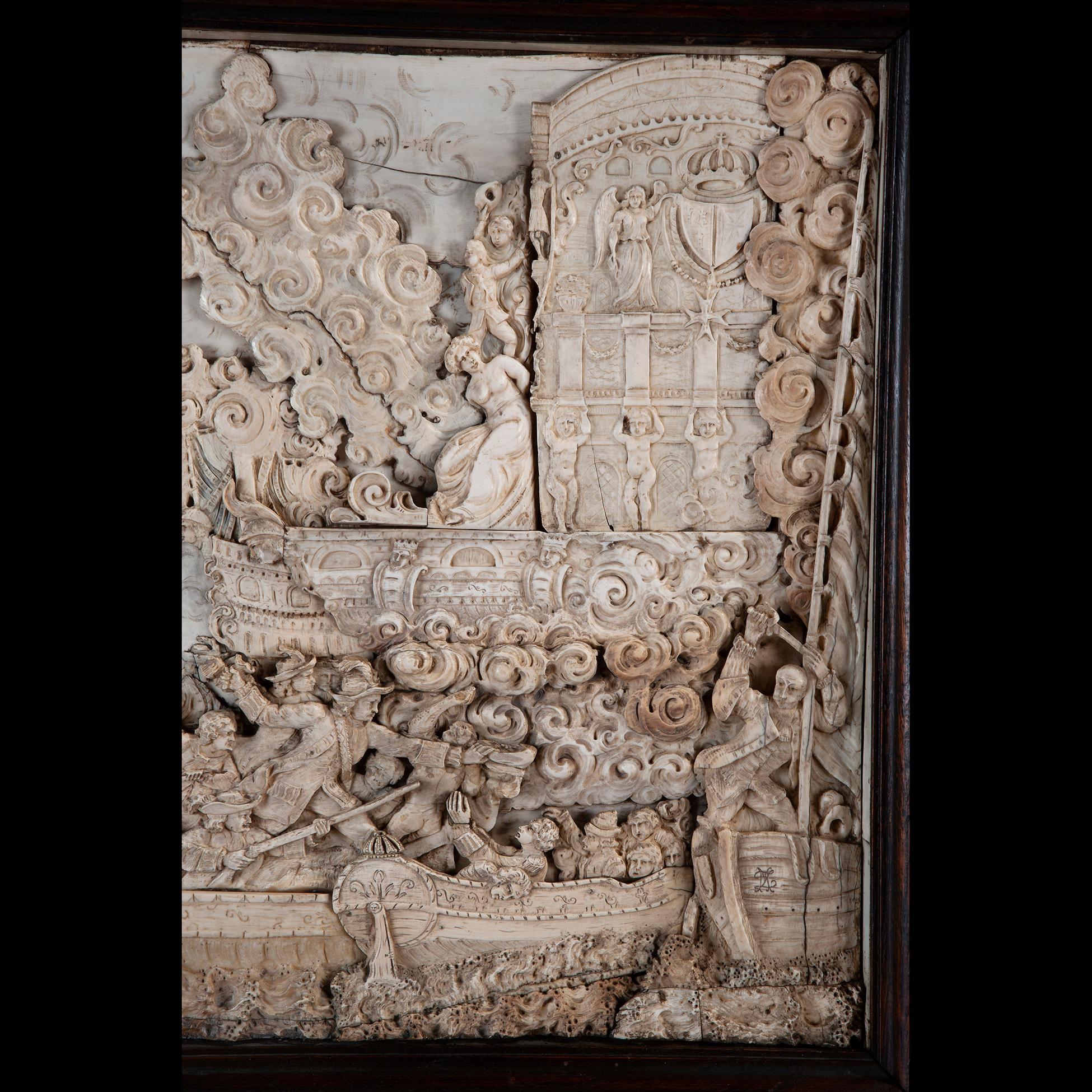 Grande rilievo in avorio, manifattura del Nord Europa della prima metà del XVIII secolo Complessa scena raffigurante una battaglia navale, dotata di una cornice in legno con riporti in avorio. Presente monogramma 'MZ' identificante probabilmente l'autor