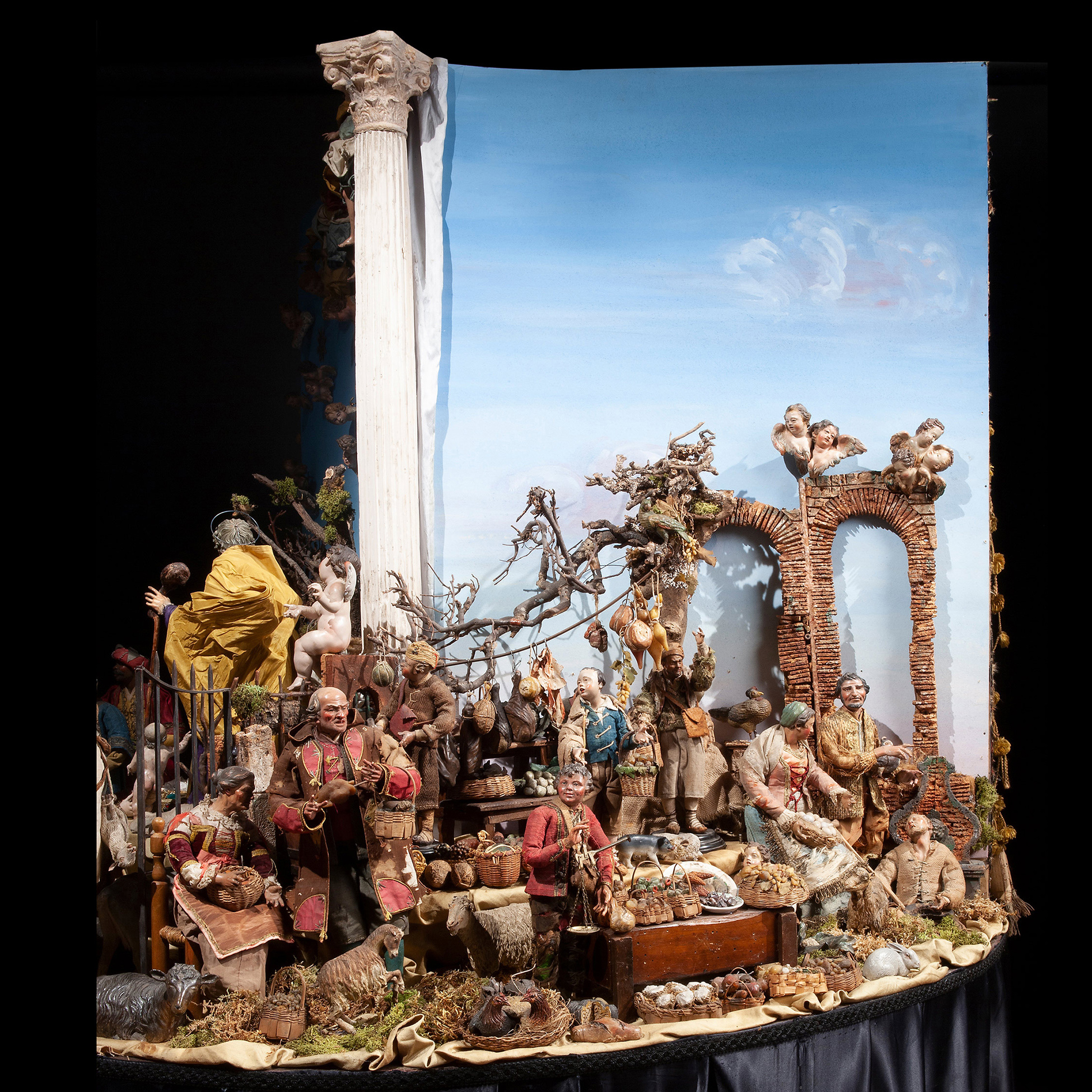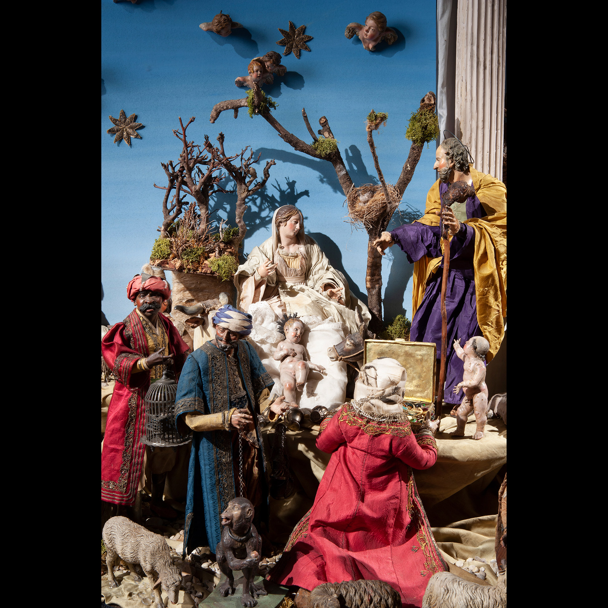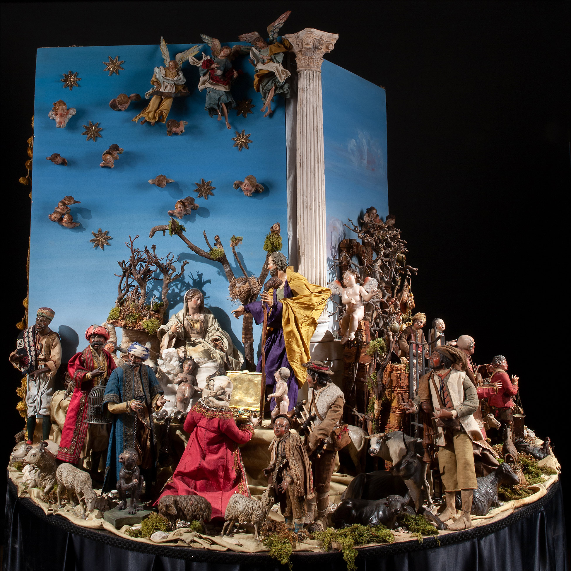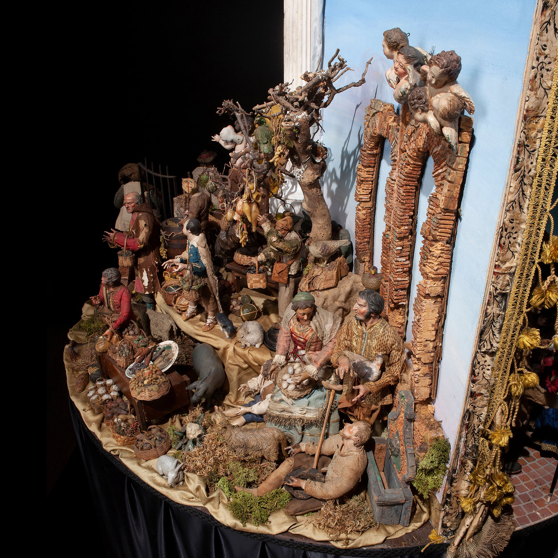 Raro e prezioso presepe napoletano del Settecento Il complesso è composto da tre scene: la natività composta da dodici figure, tredici angeli, diciotto animali e sette oggetti. La scena di taverna è composta da undici figure, quattro animali, quarantatr