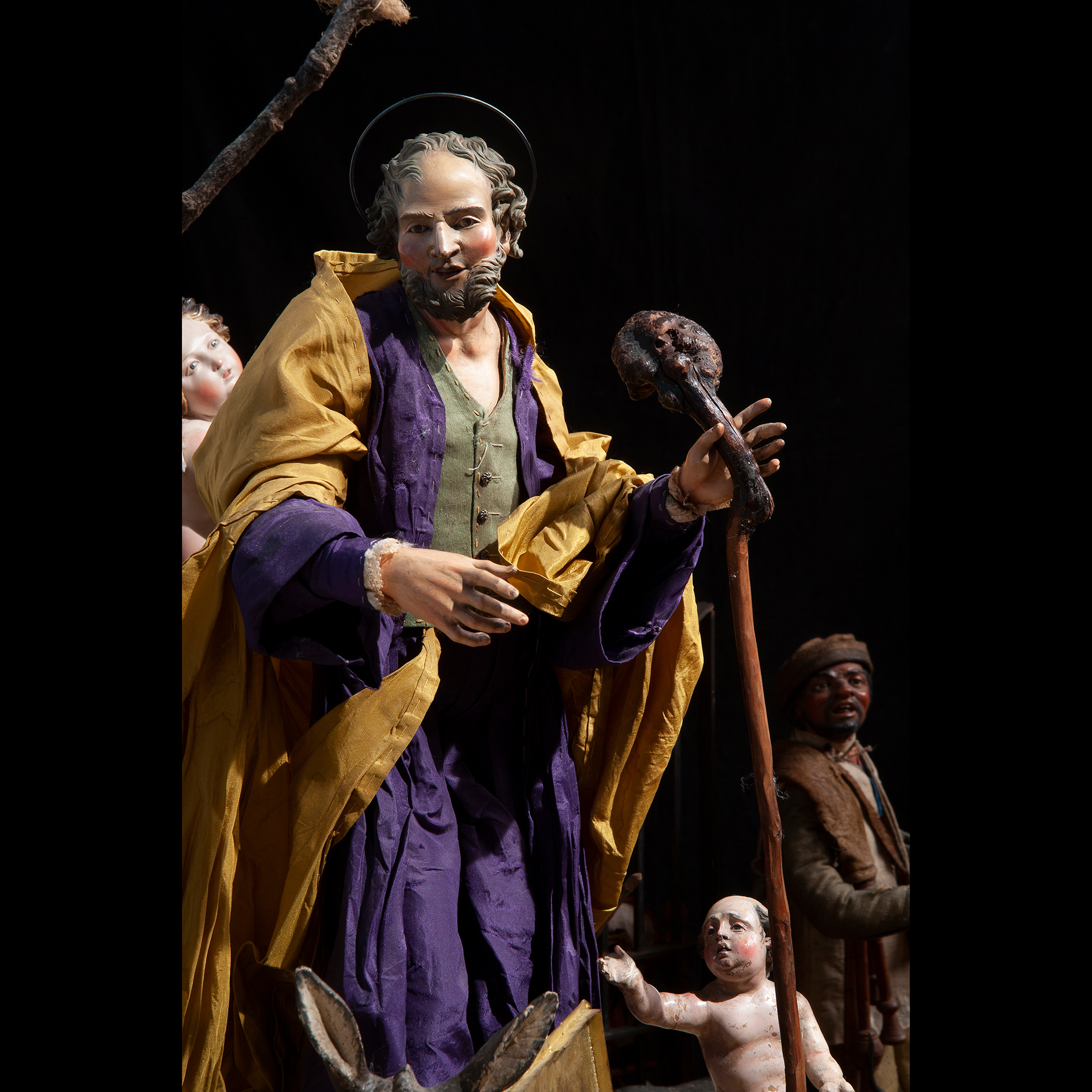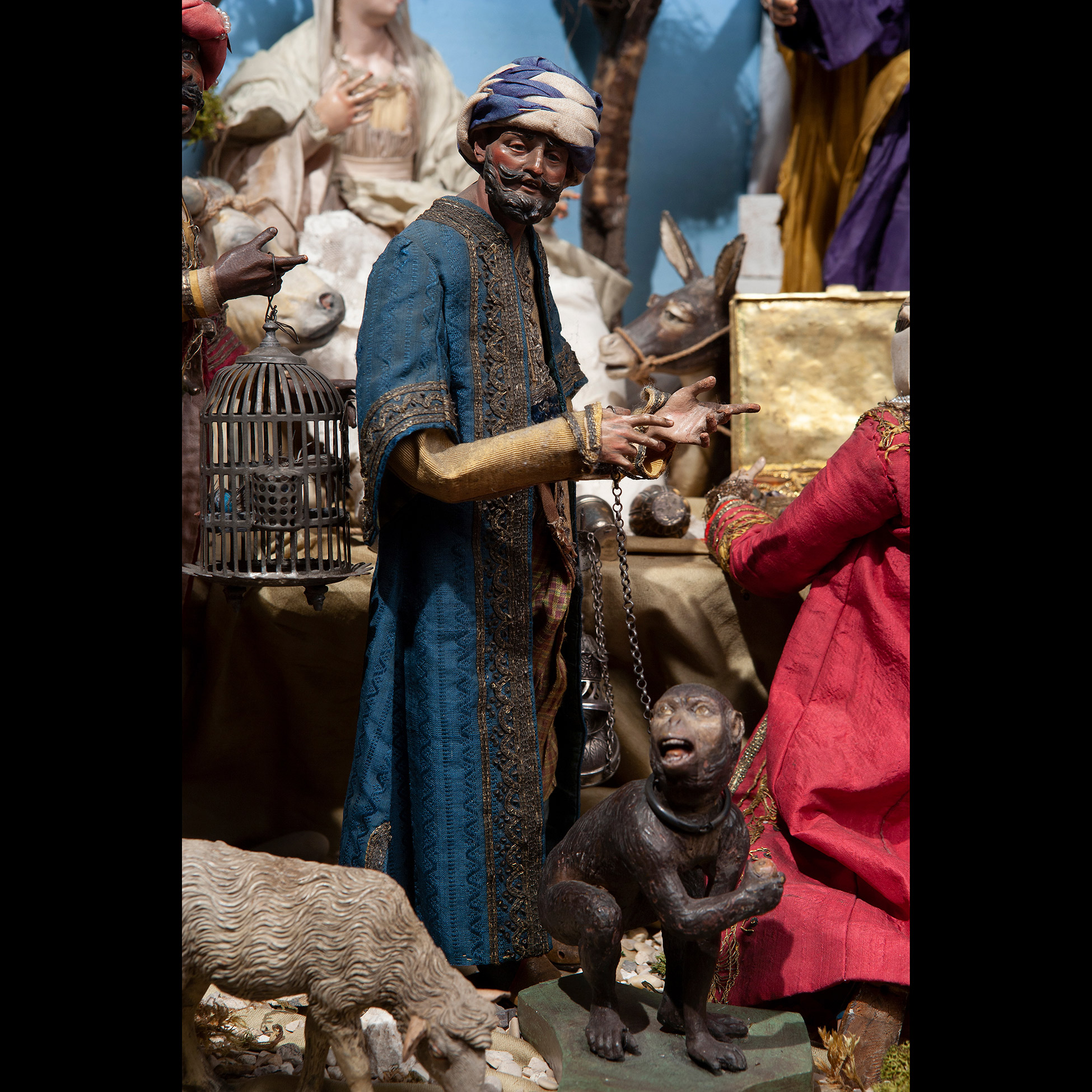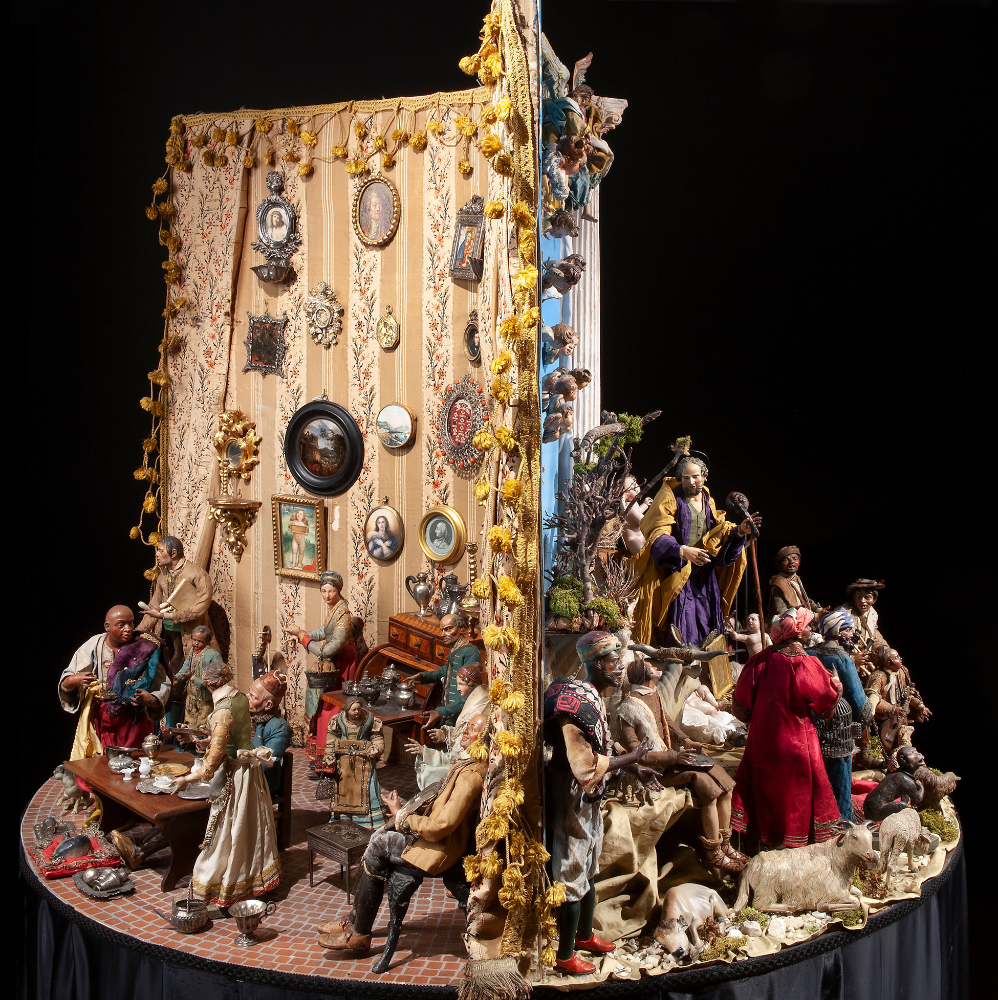 Raro e prezioso presepe napoletano del Settecento Il complesso è composto da tre scene: la natività composta da dodici figure, tredici angeli, diciotto animali e sette oggetti. La scena di taverna è composta da undici figure, quattro animali, quarantatr