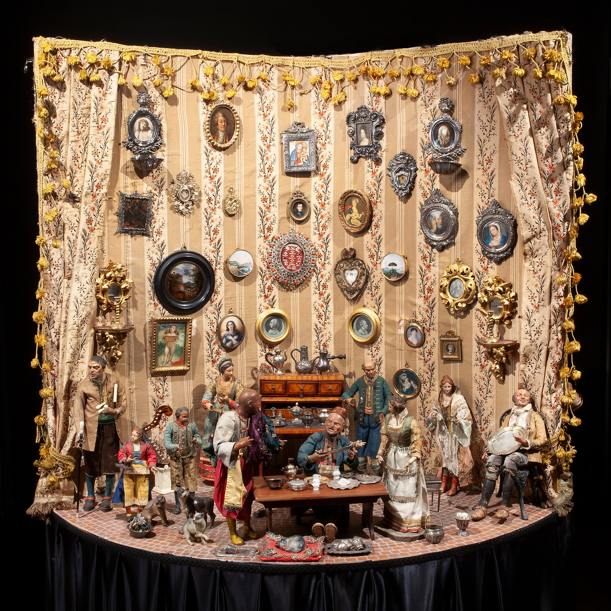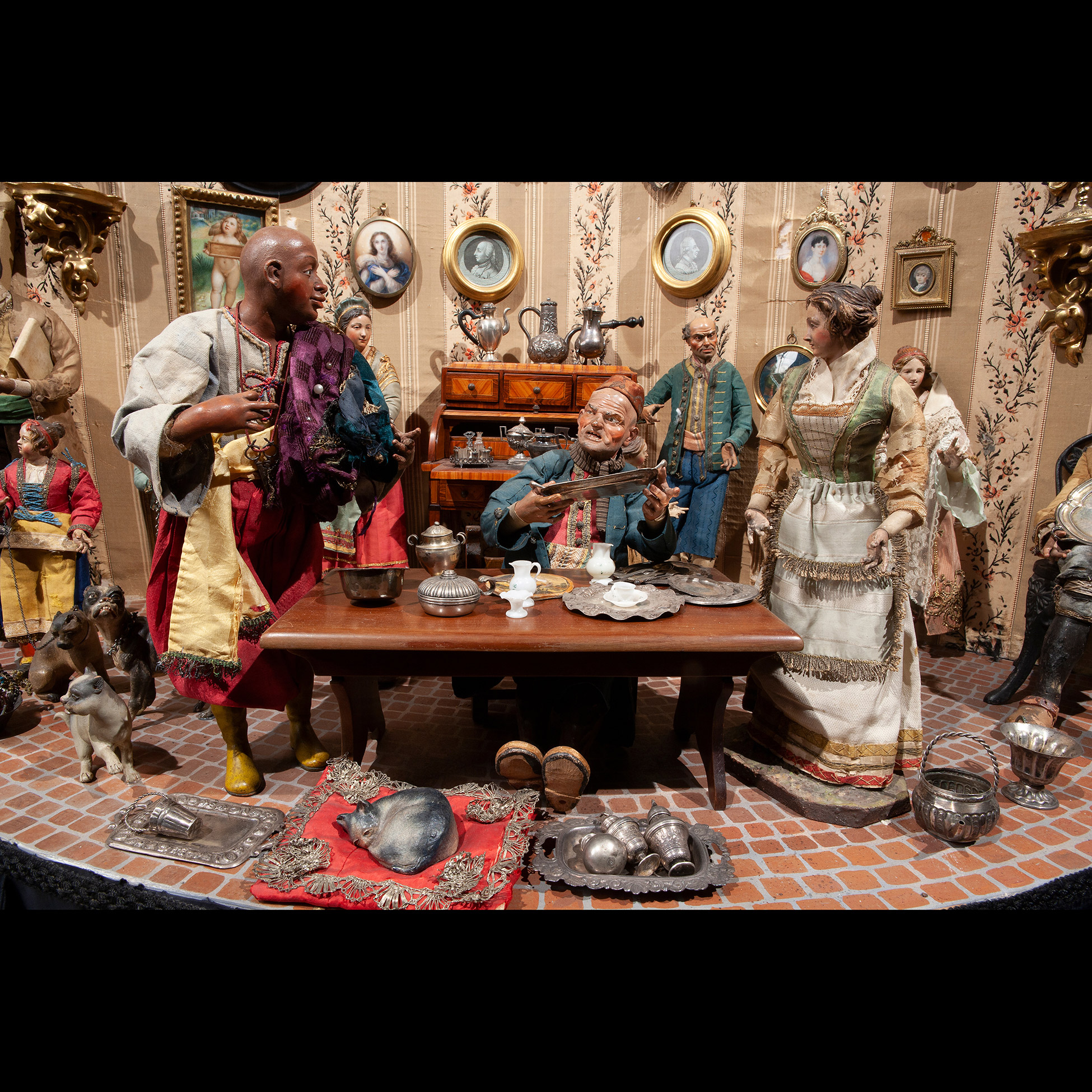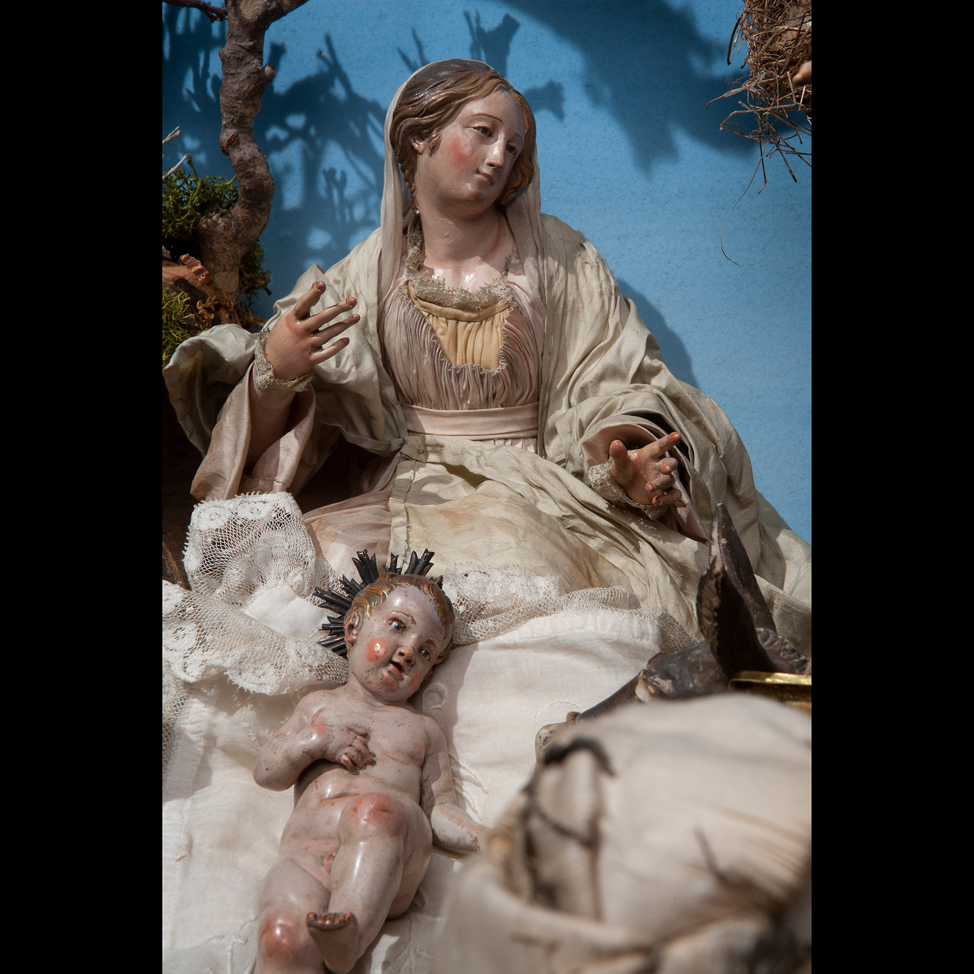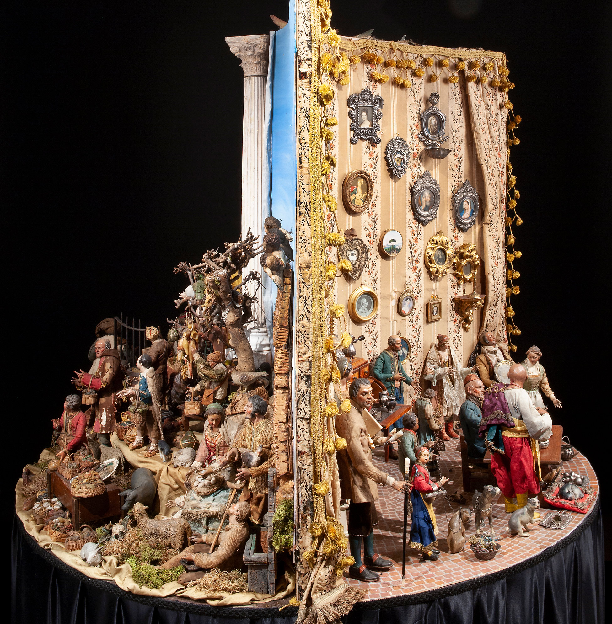 Raro e prezioso presepe napoletano del Settecento Il complesso è composto da tre scene: la natività composta da dodici figure, tredici angeli, diciotto animali e sette oggetti. La scena di taverna è composta da undici figure, quattro animali, quarantatr