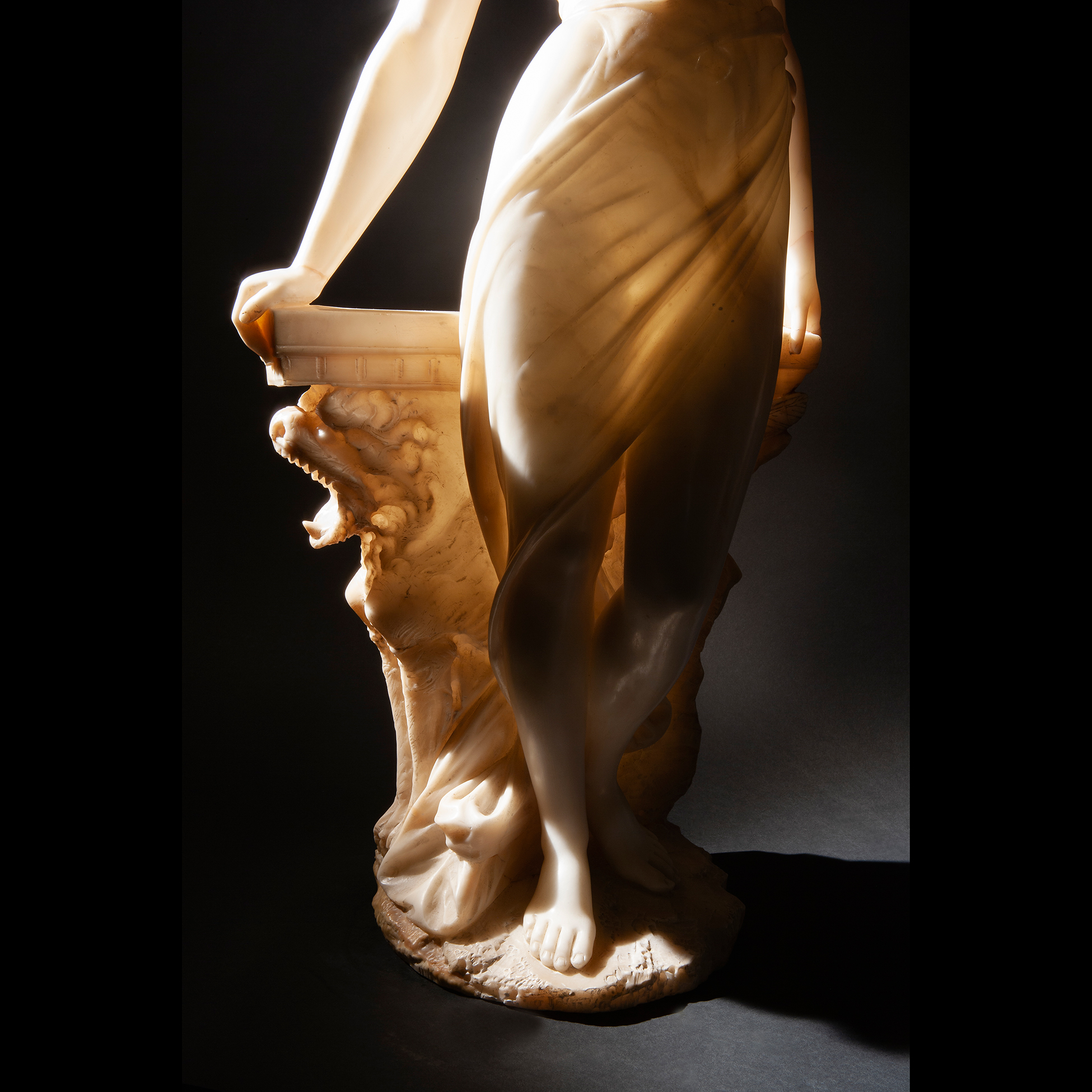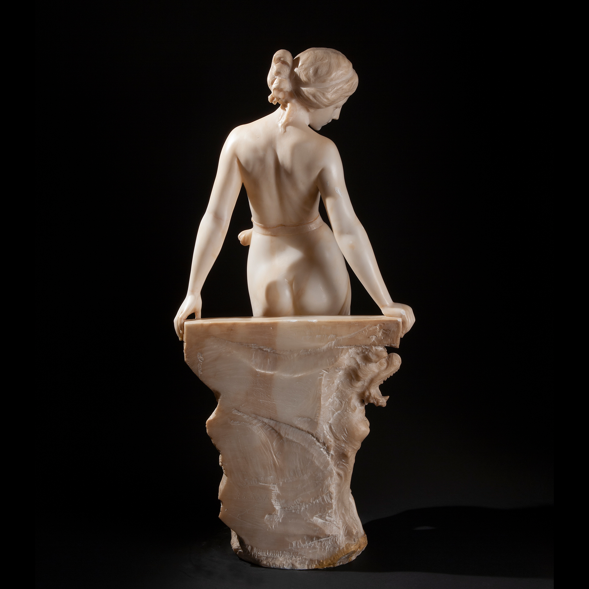 Importante scultura di ninfa, XIX secolo Realizzata interamente in alabastro, reca sul retro l'incisione 'Estudios Florentinos Callao 350.' Dimensioni 86 cm.