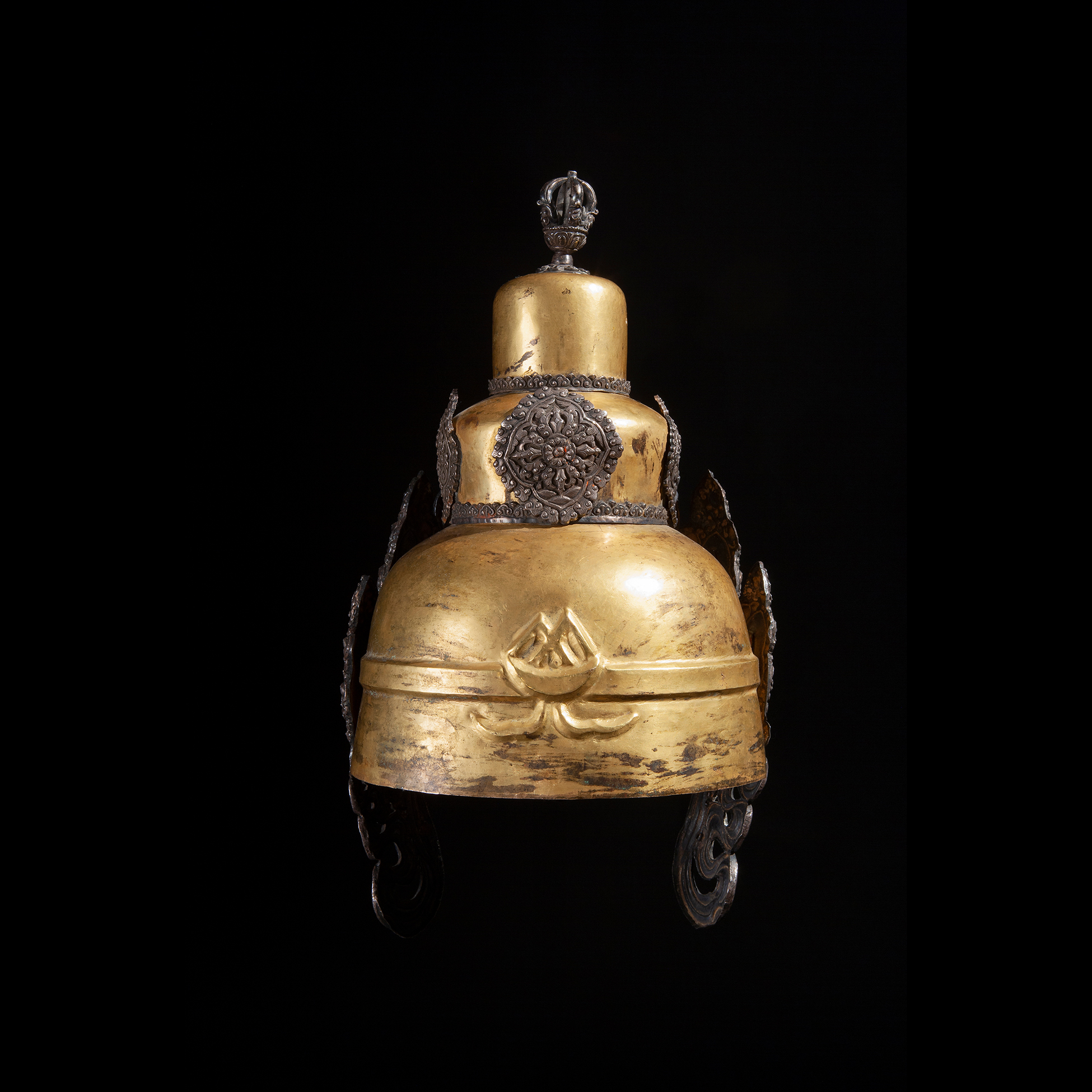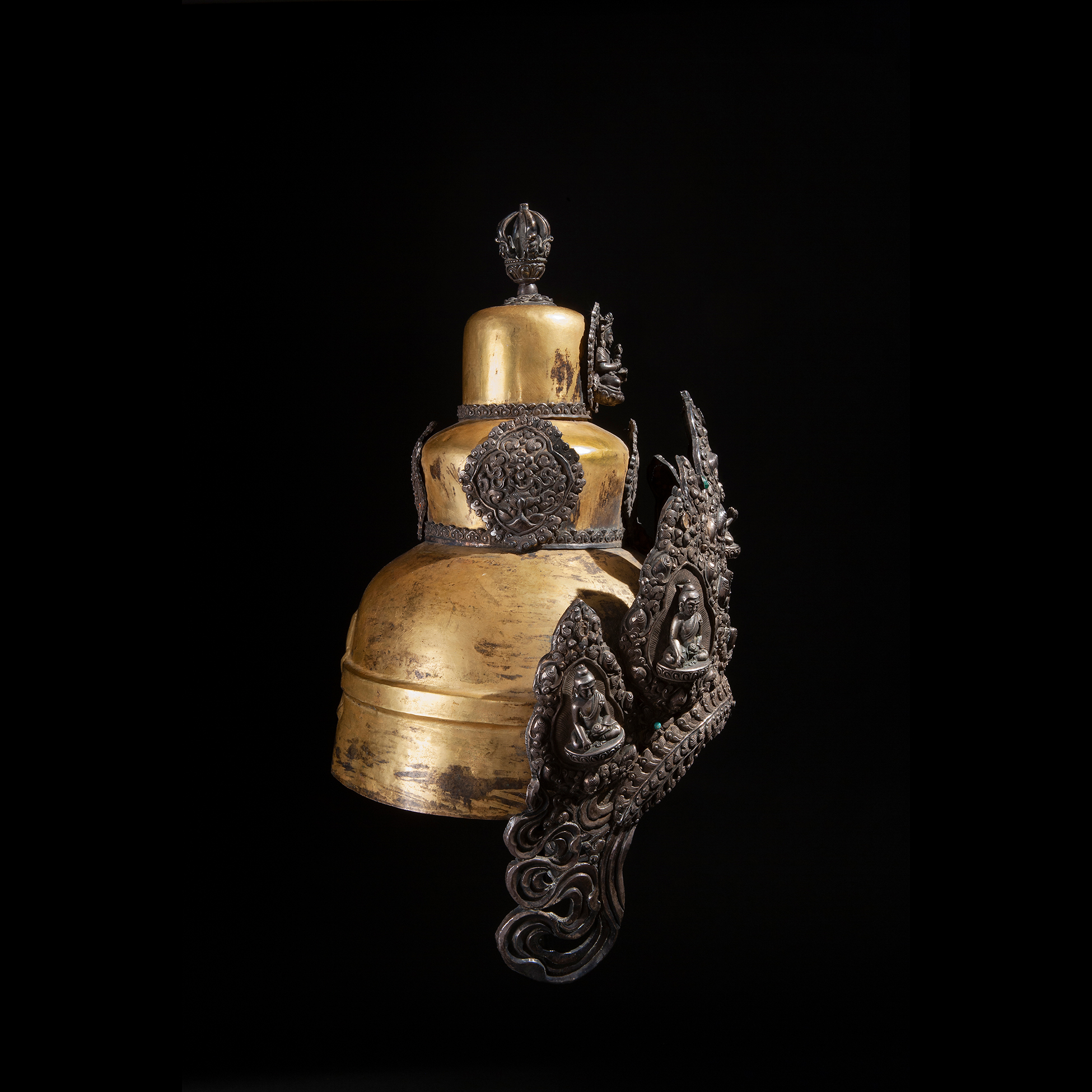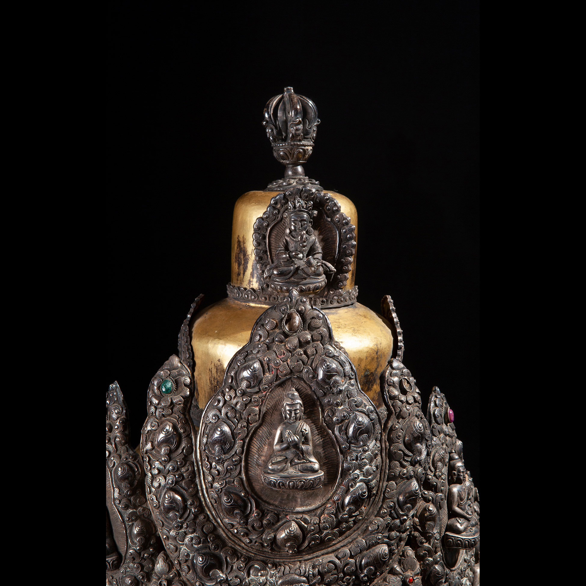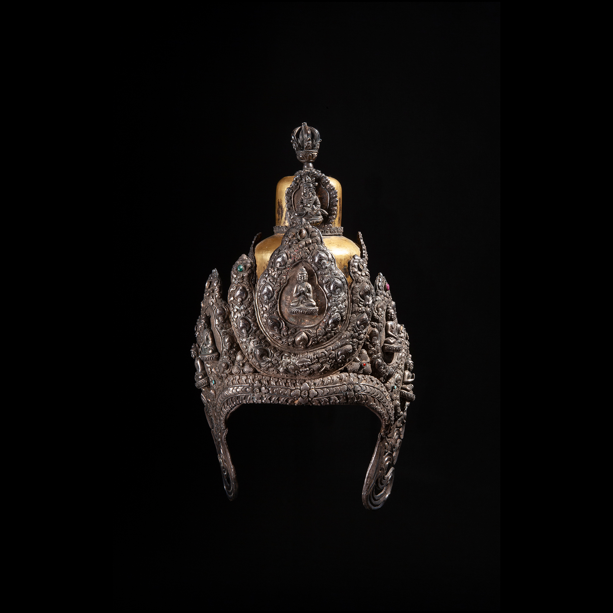 Vajracharya in rame dorato e argento, Tibet o Nepal XIX secolo Corona cerimoniale utilizzata dai sacerdoti buddisti per officiare cerimonie religiose, è decorata a sbalzo e con pietre preziose, a motivi astratti e vegetali. Il Buddha raffigurato sotto l