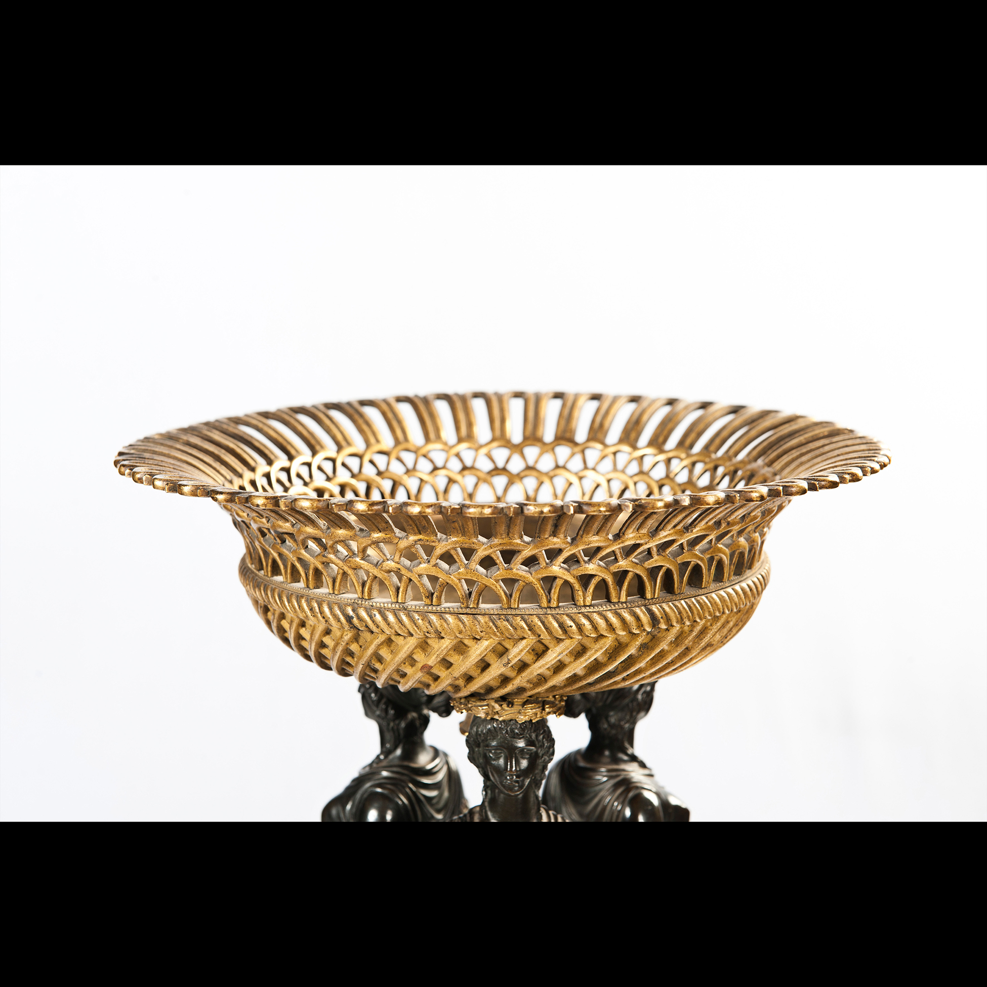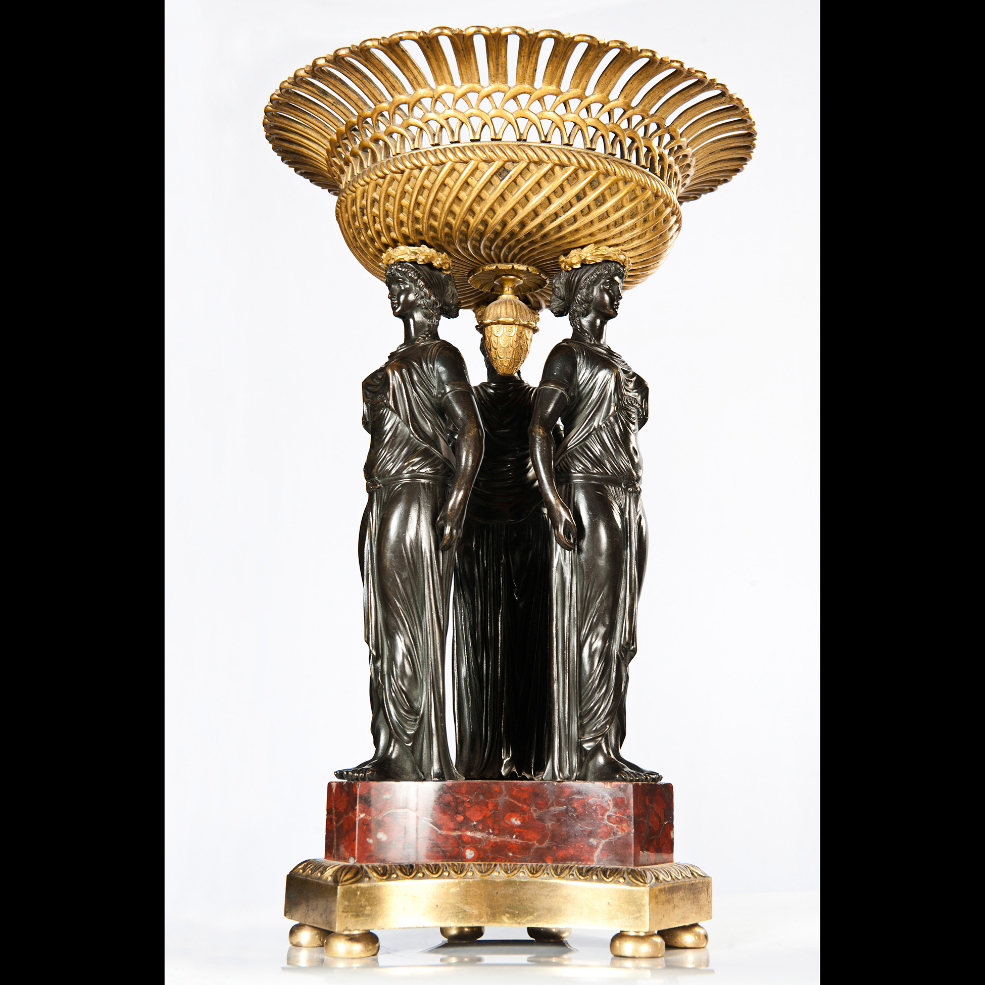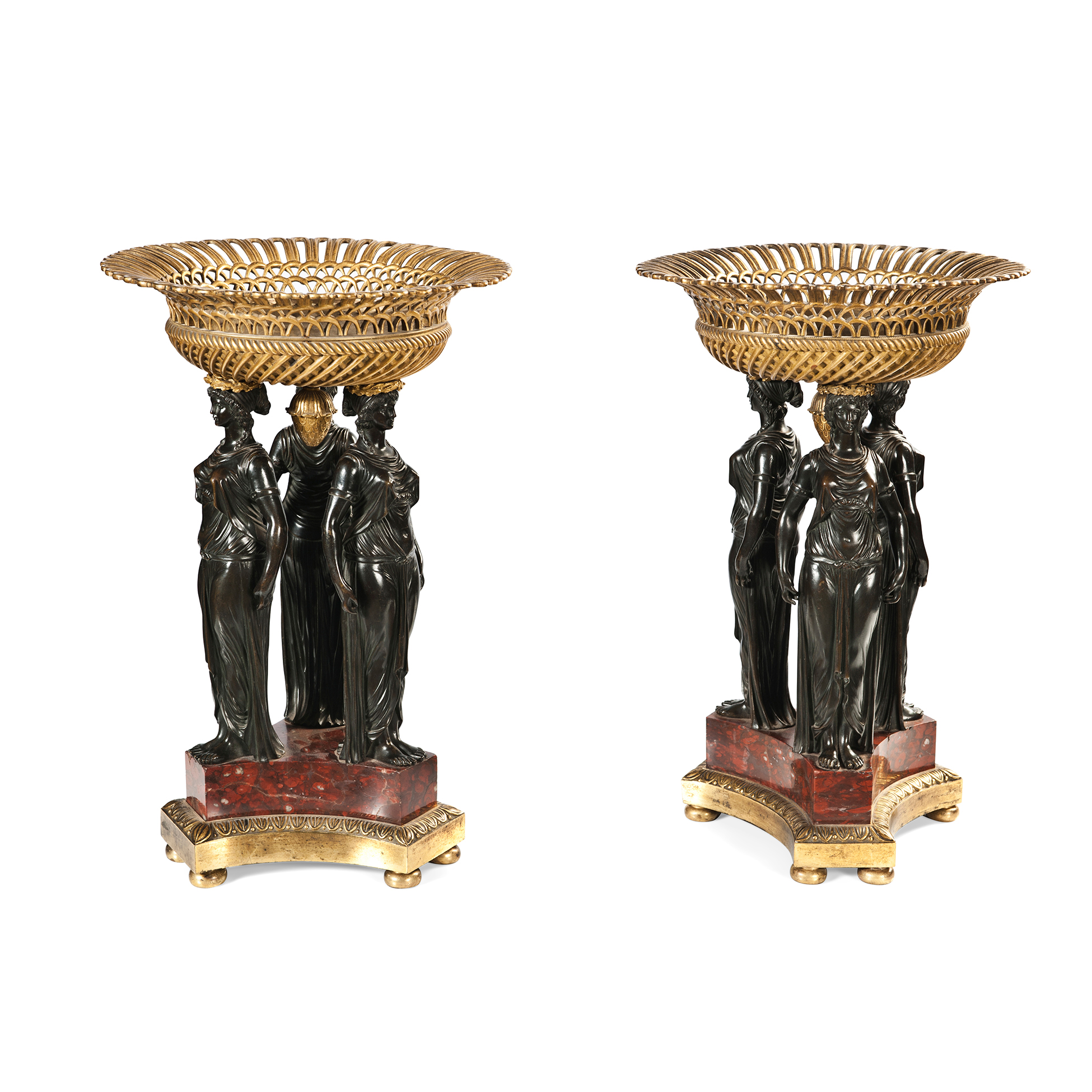 Coppia di centrotavola, Francia fine XVIII inizi XIX secolo Realizzati in bronzo, bronzo dorato e pietre dure. Dimensioni 41x20x25 cm.