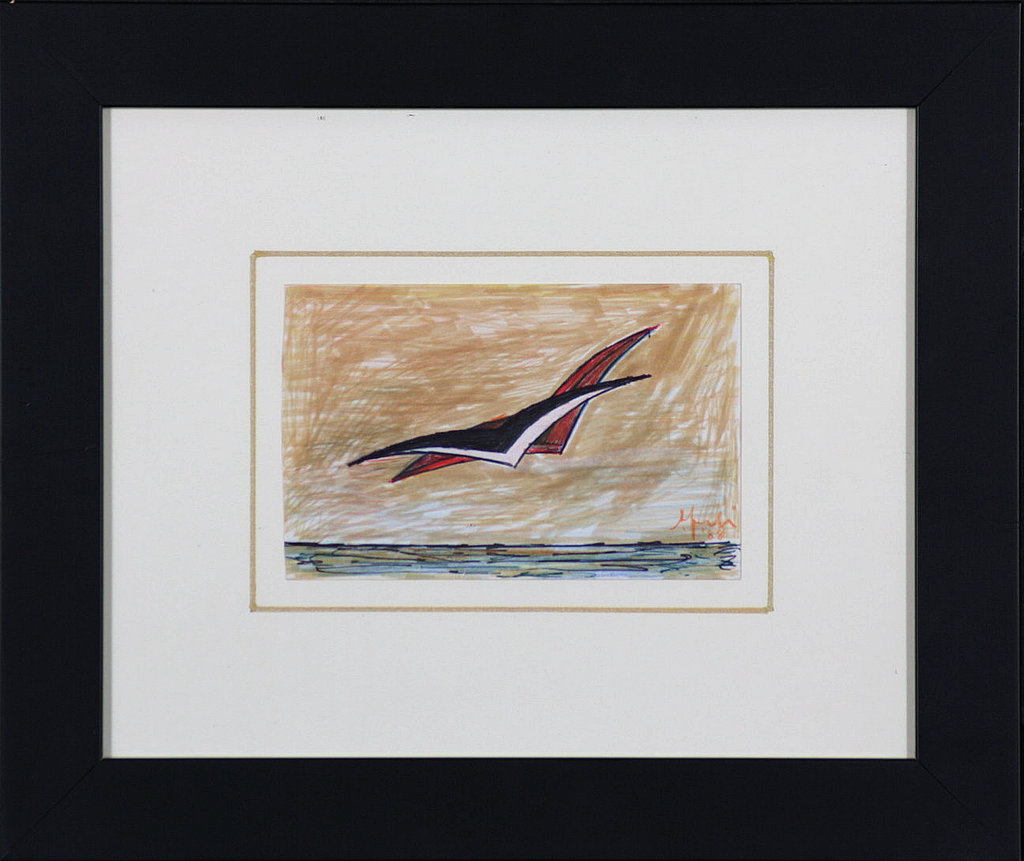 disegno 2 tec. mista su carta cm. 12,5 x 7 1973, dedica ad personam scritta sul vetro; incisione cm. 80x63