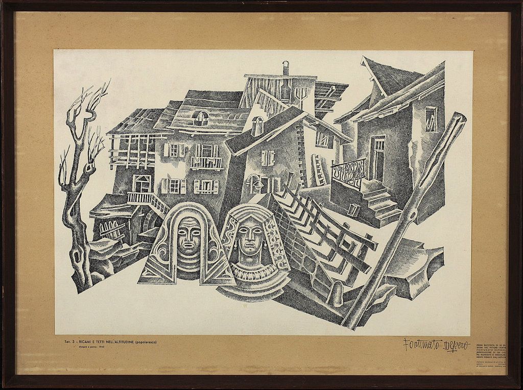 Lotto 446 | Fortunato Depero, Tav. 3, Ricami e tetti nell'altitudine (popolaresco), 1943