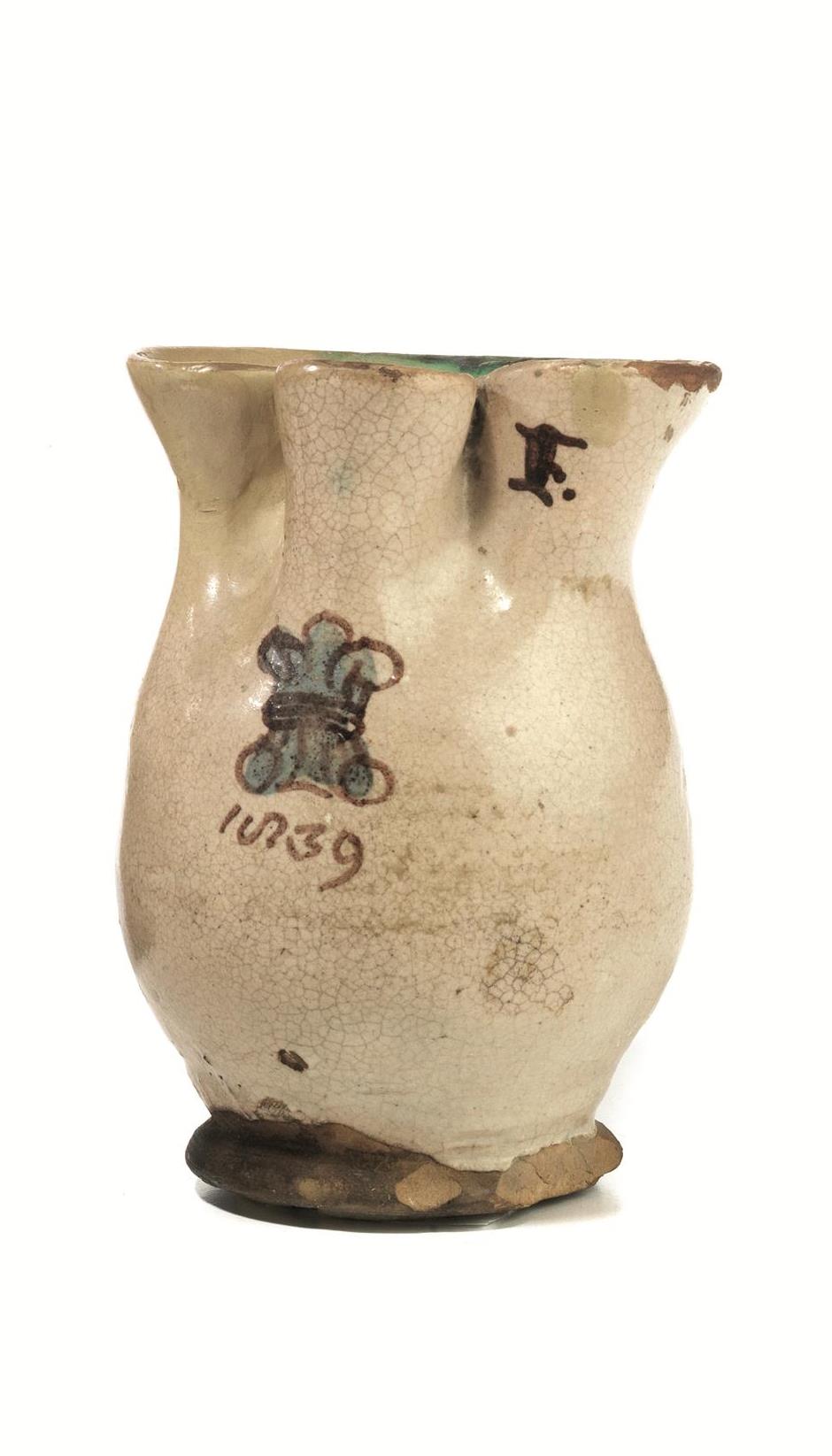 Brocca, Siena, sec. XVI, in maiolica, dipinta a monocromo beige, bocca trilobata, piccola ansa, lettera F e data 1539 apposte sul fronte, alt. cm 12,5, piccole mancanze