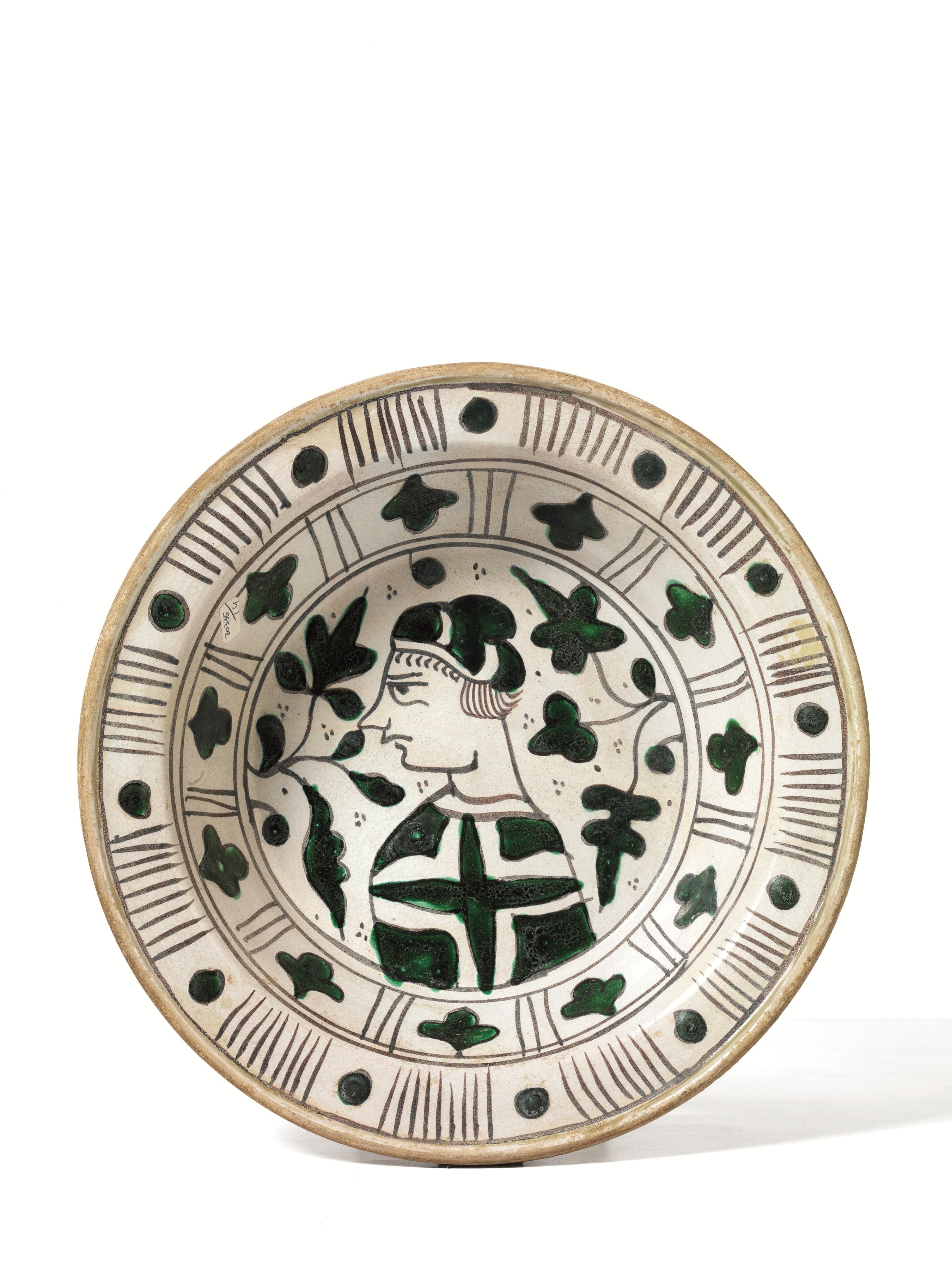 Piatto fondo, Viterbo, 1430 circa, in maiolica decorata a motivi vegetali e busto femminile nel cavetto a zaffera verde a rilievo e bruno, tesa a gruppi di righe intercalate da elementi circolari, diam. cm 33, restauri