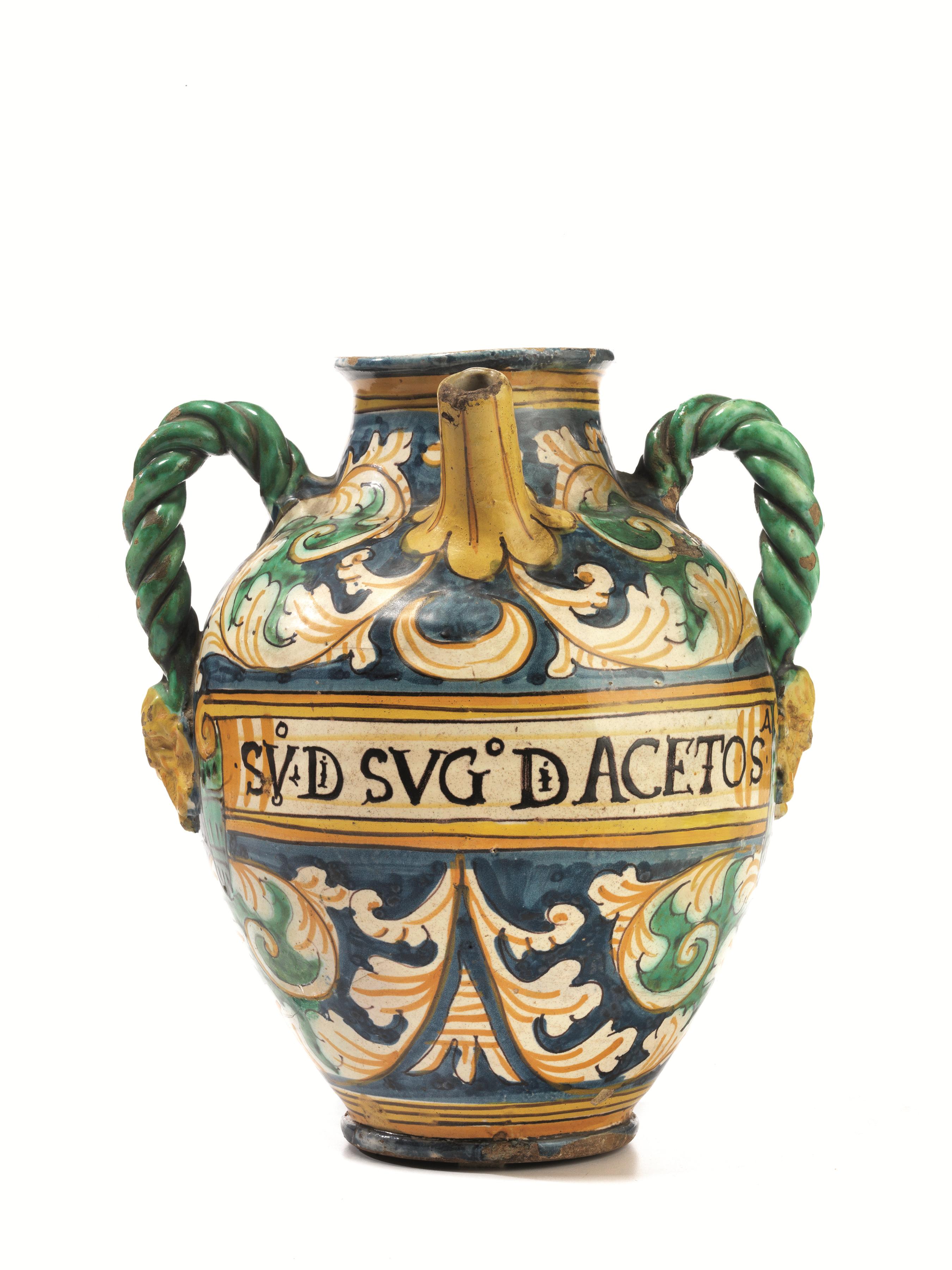 Versatoio, Montelupo, metà sec. XVI, in maiolica decorata con grandi girali fogliacei profilati in bruno con dettagli ocra, su fondo blu e verde, e cartiglio con iscrizione profilato in giallo, ocra e verde, due anse a cordone dipinte in verde con terminazioni figurate a mascheroni gialli, pippio decorato da petali gialli, alt. cm 29, alcuni restauri