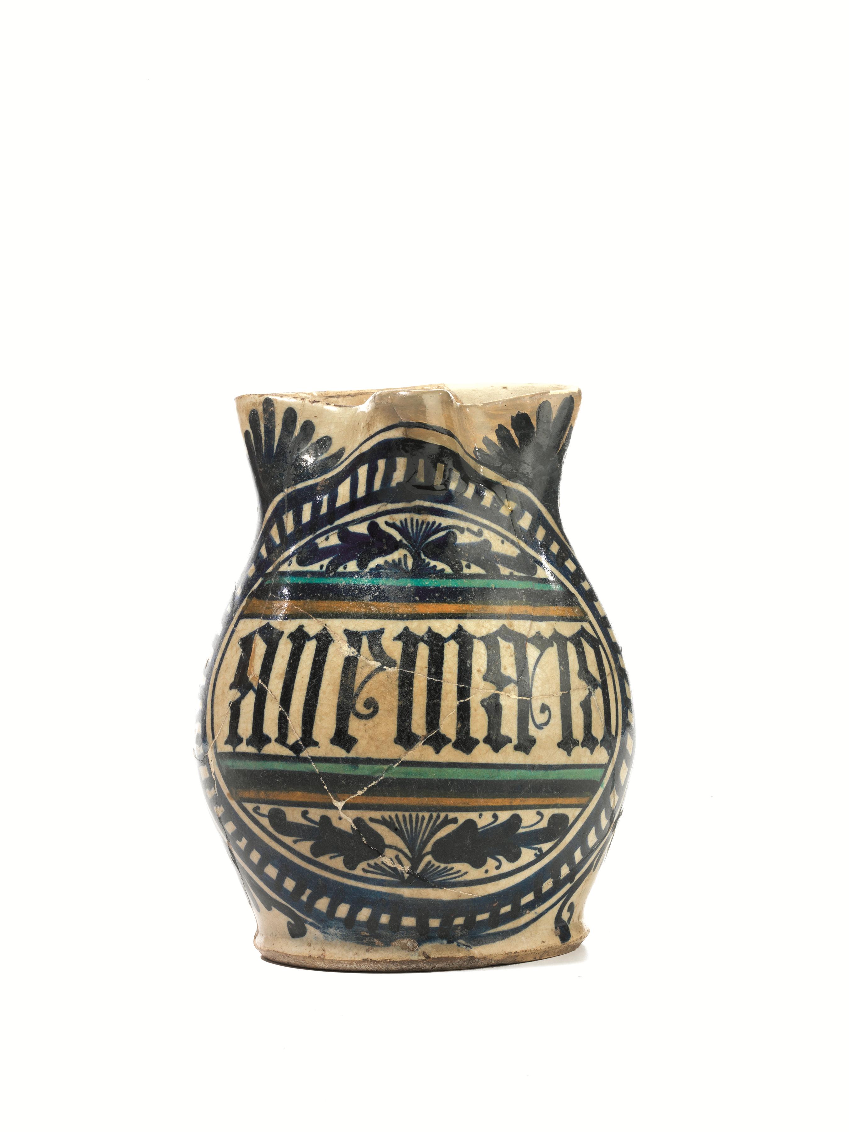 Boccale trilobato, Pesaro, seconda metà sec. XV, in maiolica decorata nei toni del blu con epigrafe in caratteri gotici entro ampio cartiglio, alt. cm 18, restauri