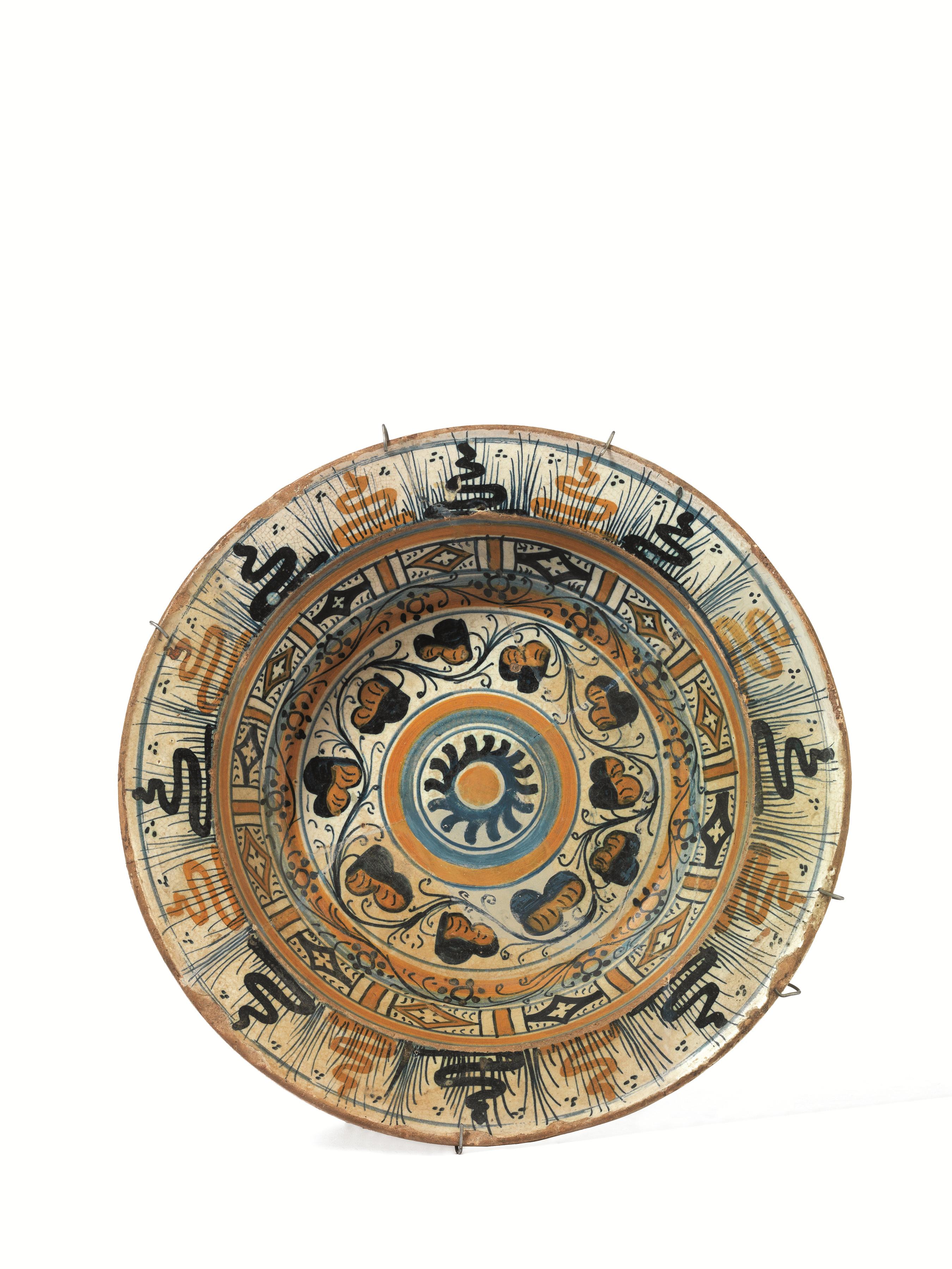 Lotto 129 | Piatto fondo, Orvieto o Gubbio, fine sec. XV, in maiolica decorata a fitto...