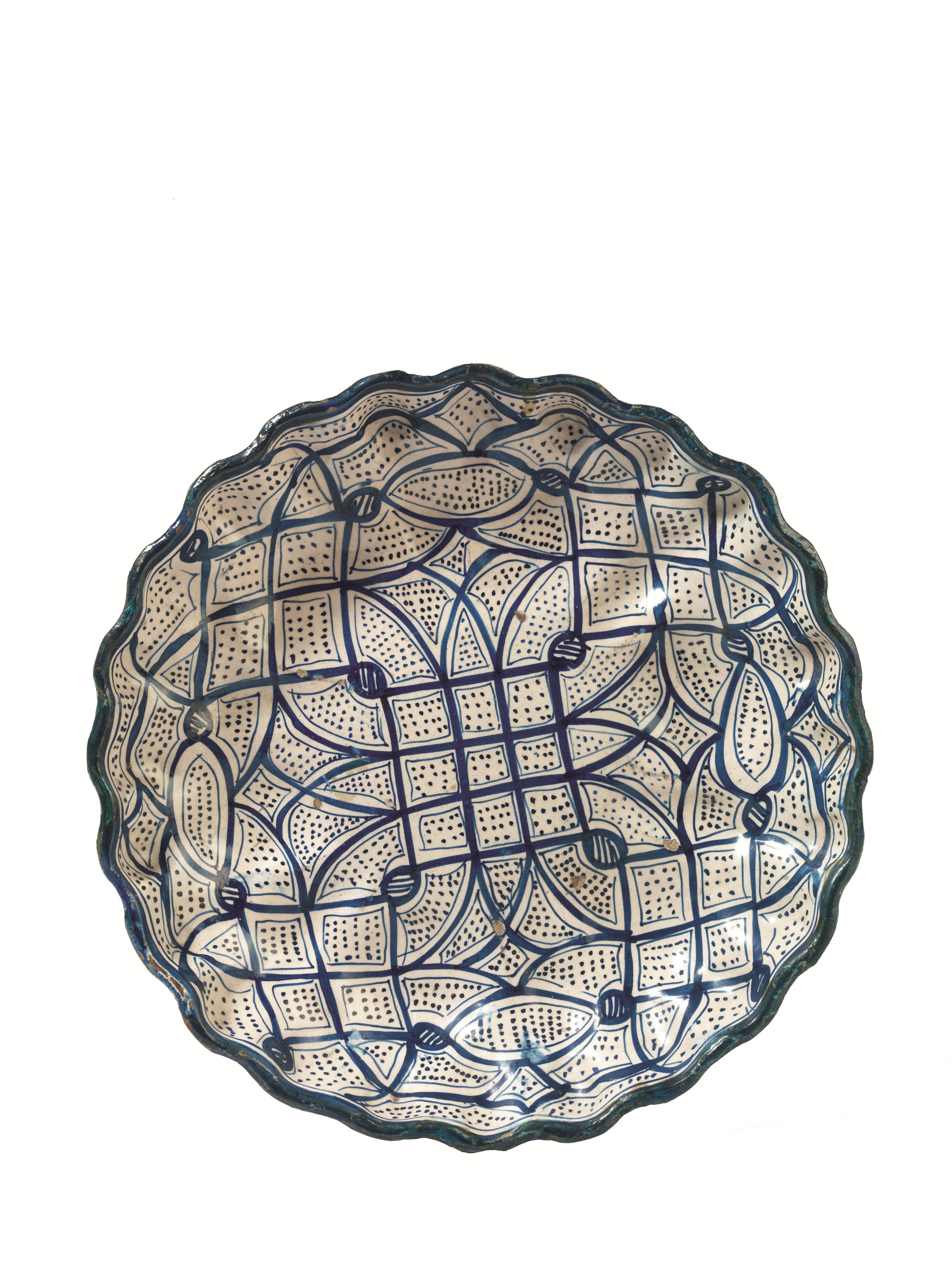 Crespina, Montelupo, fine sec. XV, in maiolica, incavo decorato con motivo a losanghe blu riempite da fitta puntinatura, tesa ondulata, verso decorato da righe orizzontali azzurre, diam. cm 28, alt. cm 7, restauri