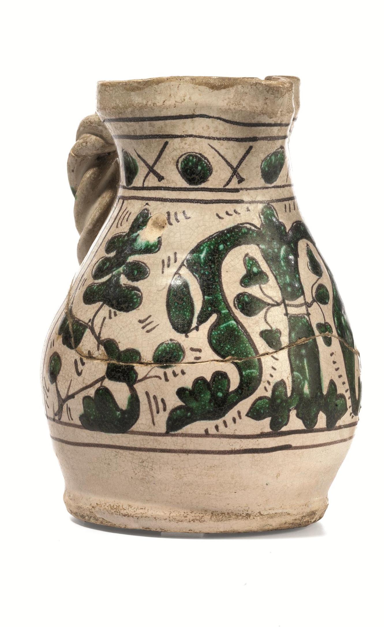 Boccale trilobato, Viterbo, metà sec. XV, in maiolica decorata da una lettera M in carattere gotico in zaffera verde a rilievo e foglie di quercia, manico a torciglione, alt. cm 20, danni e restauri