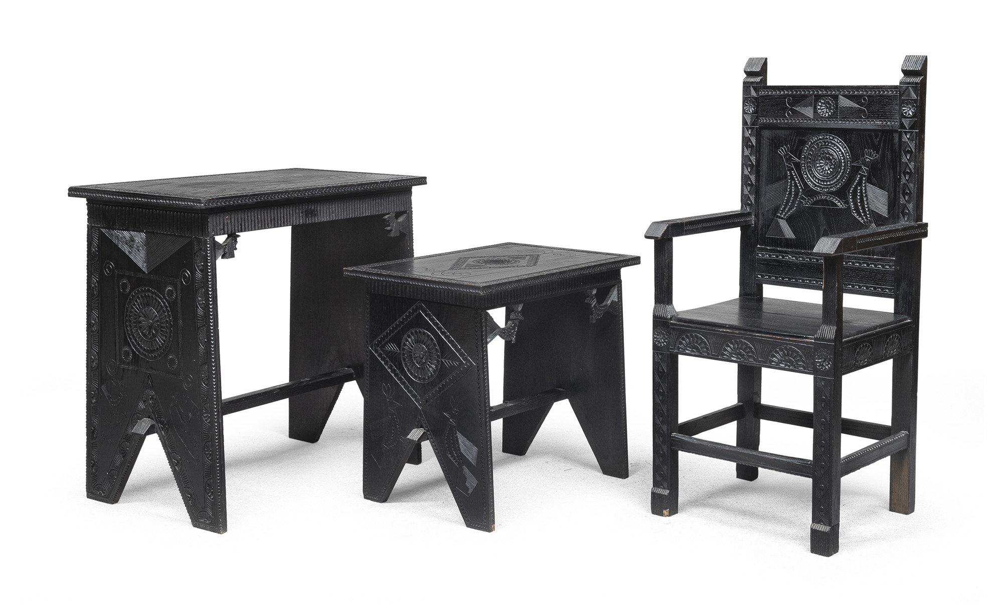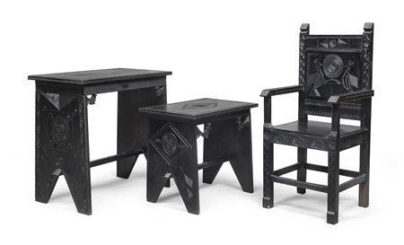 POLTRONA E DUE TAVOLI IN LEGNO EBANIZZATO, SARDEGNA INIZI XX SECOLO