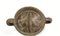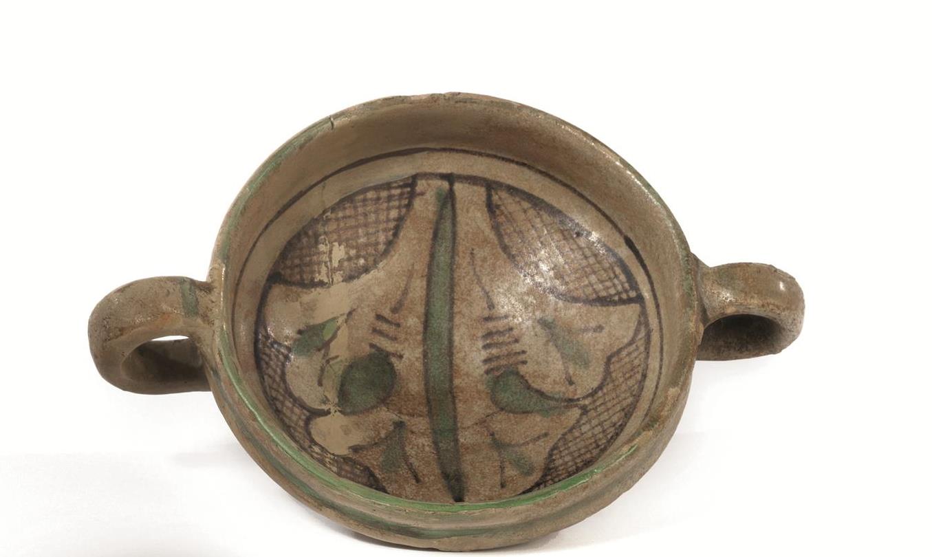 Tazza, Alto Lazio, fine sec. XV, in maiolica, decorata sul fondo da una foglia su fondo a retino, bruno manganese e verde ramina, due piccole anse, diam. cm 10, piccoli restauri
