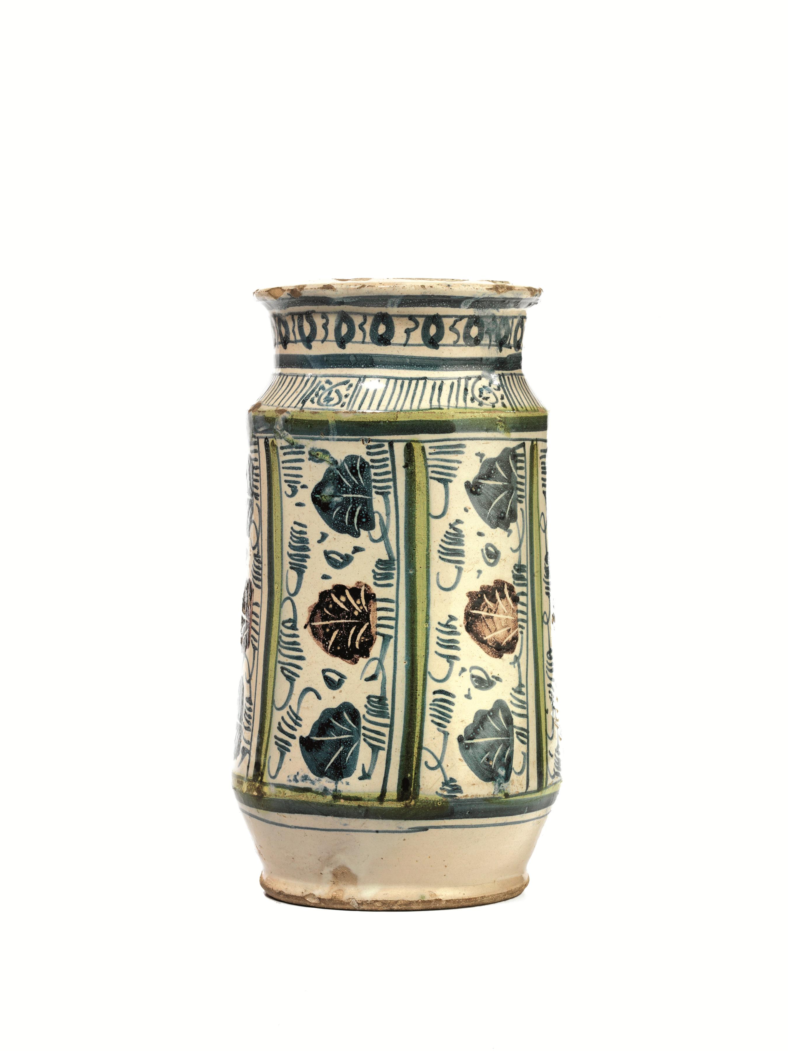 Albarello, Firenze, seconda metà sec. XV, in maiolica decorata a foglia di...