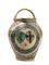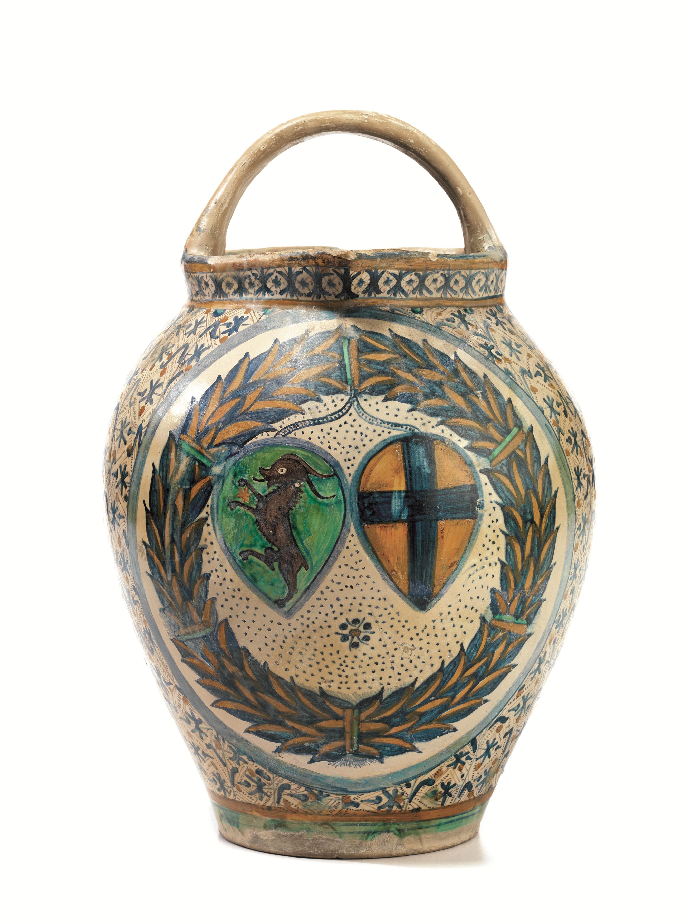 Mezzina, Montelupo o Cafaggiolo, fine sec. XV, in maiolica, fondo decorato a fitto motivo vegetale stilizzato nei toni del bruno, blu e ocra, su entrambe le facce campeggia una coppia di stemmi nobiliari su fondo bianco puntinato in blu entro grande ghirlanda di foglie blu e ocra, il tutto entro riserva azzurra, labbro modellato a doppio beccuccio con manico a nastro passante tra i due bordi, alt. cm 36, restauri