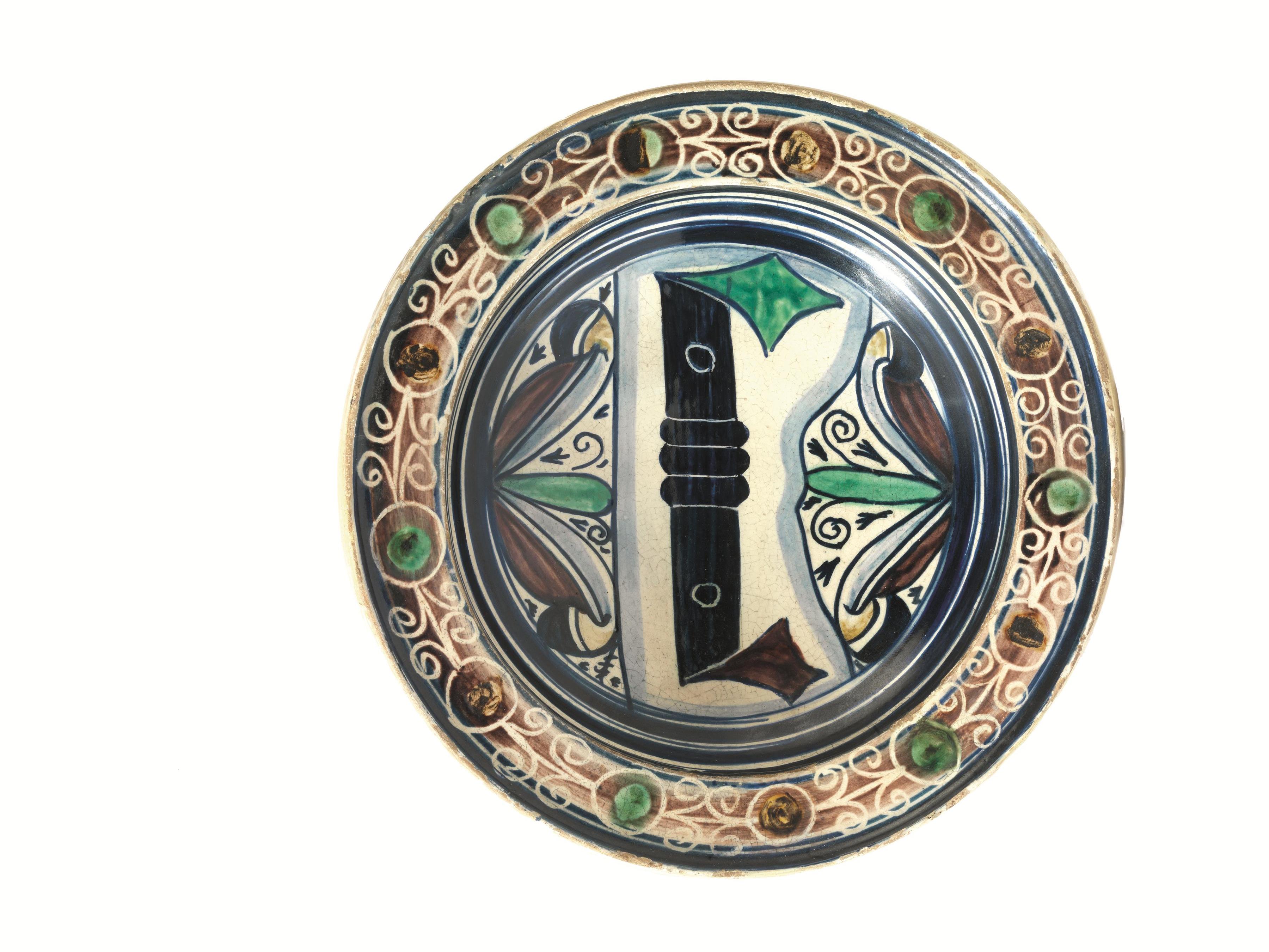 Piatto, Deruta, sec. XV, in maiolica decorata al centro con lettera gotica affiancata da motivi fogliacei, tesa a motivi circolari su fondo manganese, diam. cm 26, presenta restauri