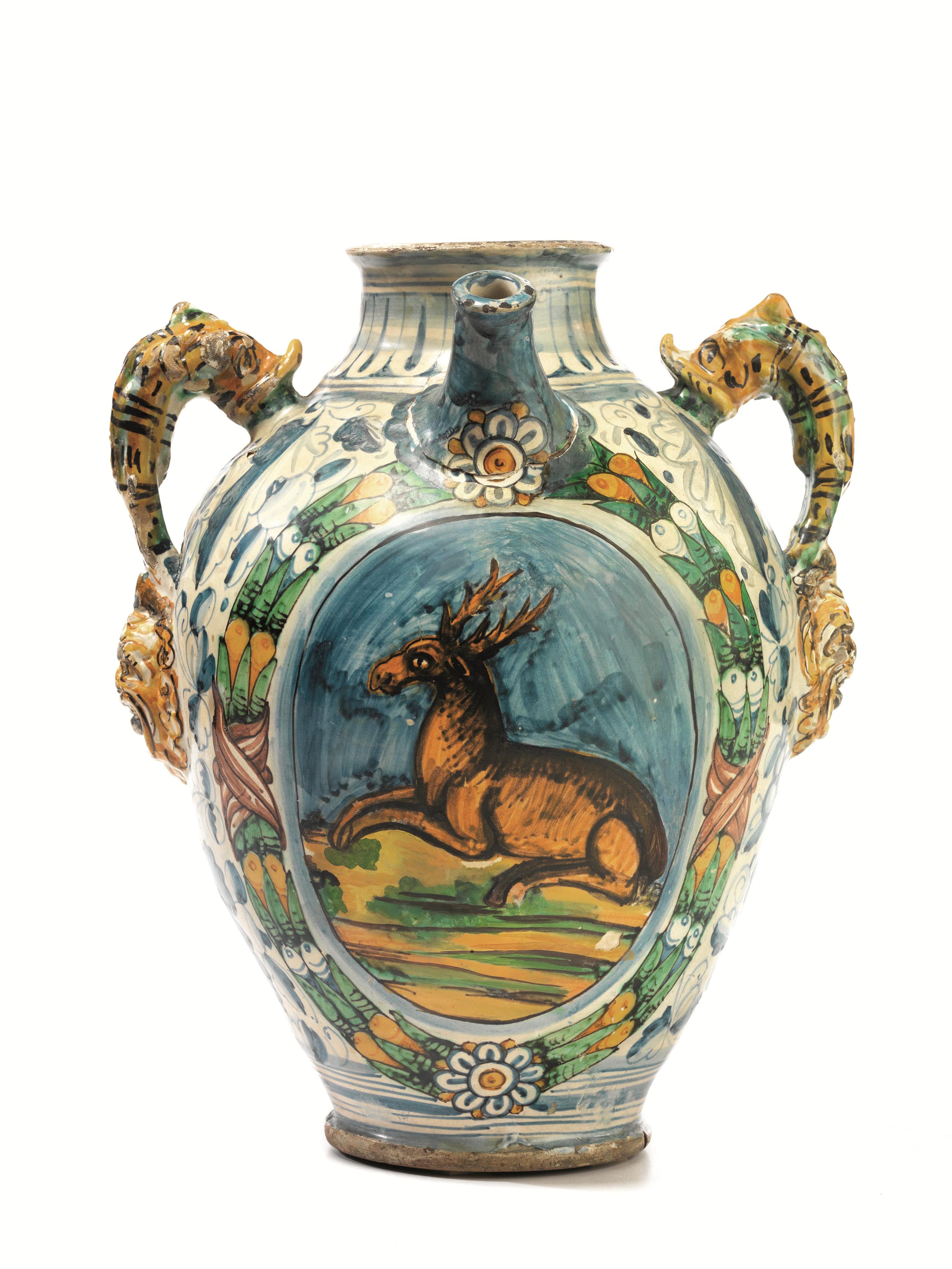 Orciolo, Montelupo, seconda metà sec. XVI, in maiolica decorata a motivi vegetali e figura di un cervo sdraiato entro ghirlanda, due anse modellate a cavallucci marini uniti al corpo da mascheroni, alt. cm 37, restauri