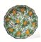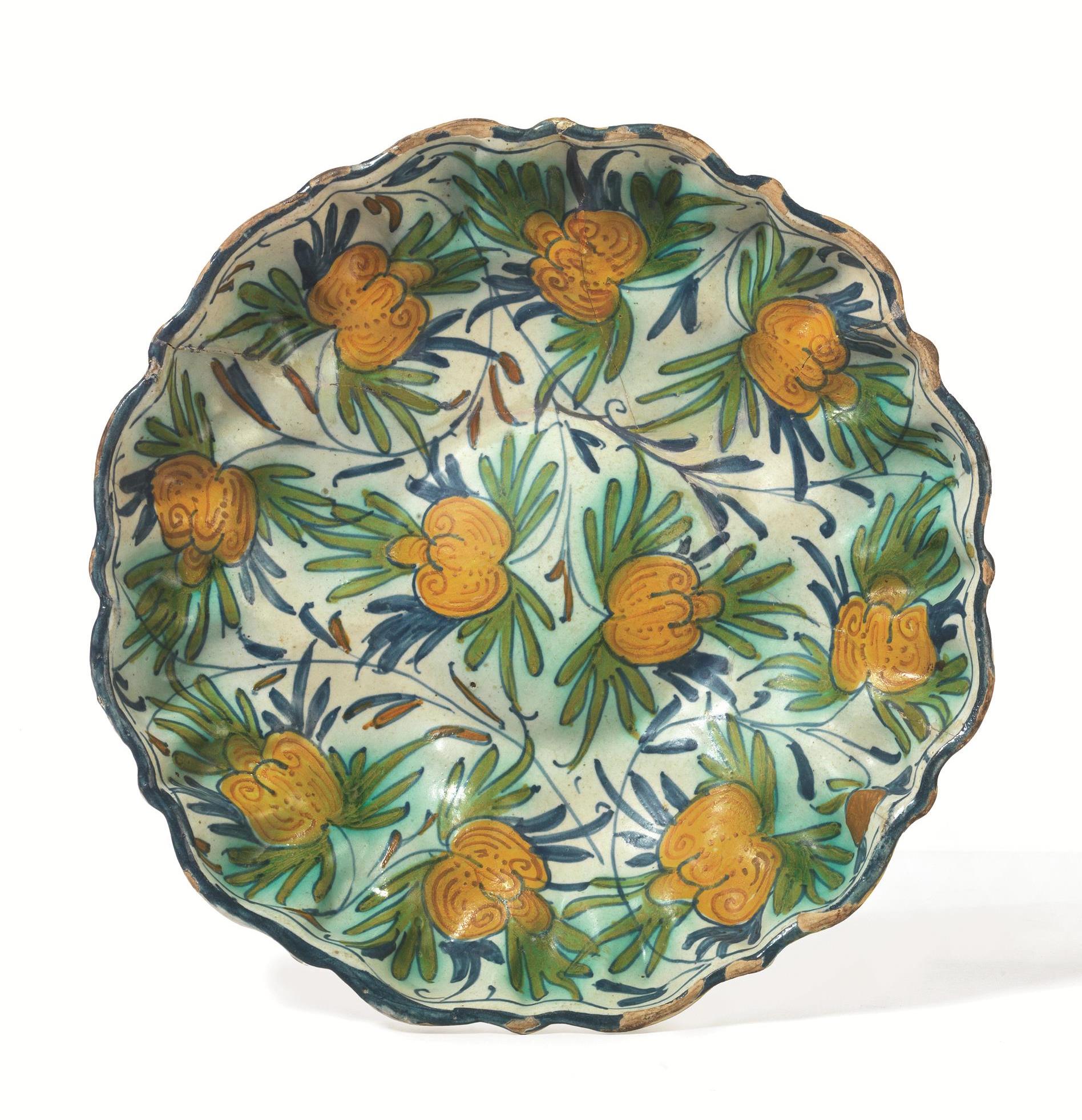 Crespina, Venezia, sec. XVI, in maiolica, decorata a fronde con foglie verdi e blu e cedri gialli e ocra, tesa ondulata, umbone convesso, verso decorato con righe gialle, blu e ocra, diam. cm 22,5, alt. cm 6, restauri e lievi danni