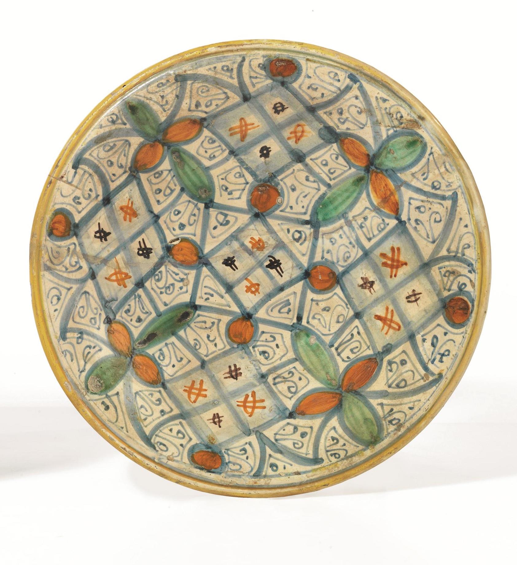 Piatto, Montelupo, sec. XVI, in maiolica, decorato da cinque losanghe alternate a fiori a quattro petali nei toni dell’azzurro, verde e ocra, bordo profilato in giallo, diam. cm 21, alt. cm 3, restauri