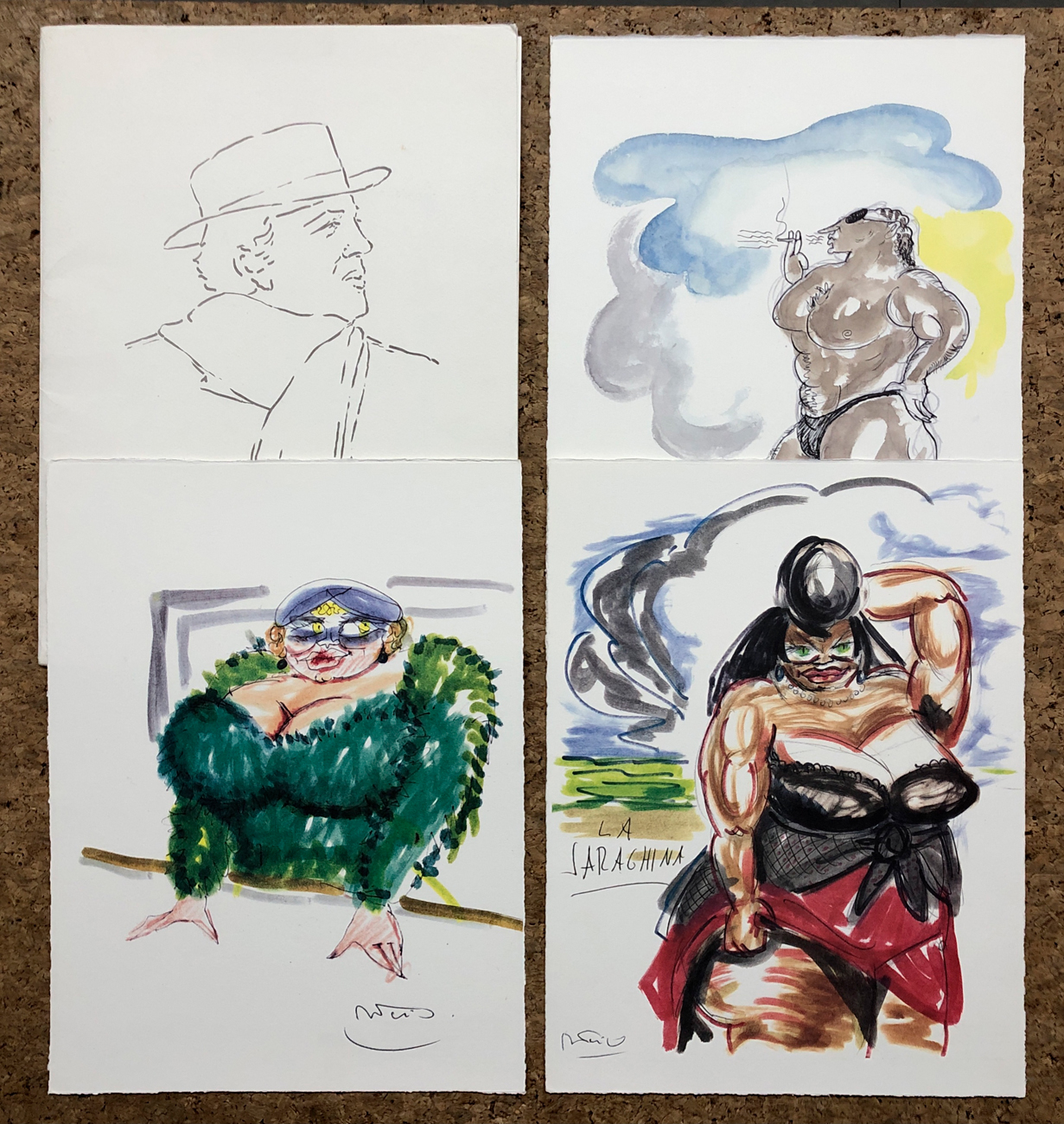 Cartella contenente 3 cromolitografie (La Saraghine, La Tabaccaia, Il vitellone) su carta a mano Rosaspina, ciascuna firmata in lastra e recante timbro per autenticità del Notaio Roberto Dini al retro
