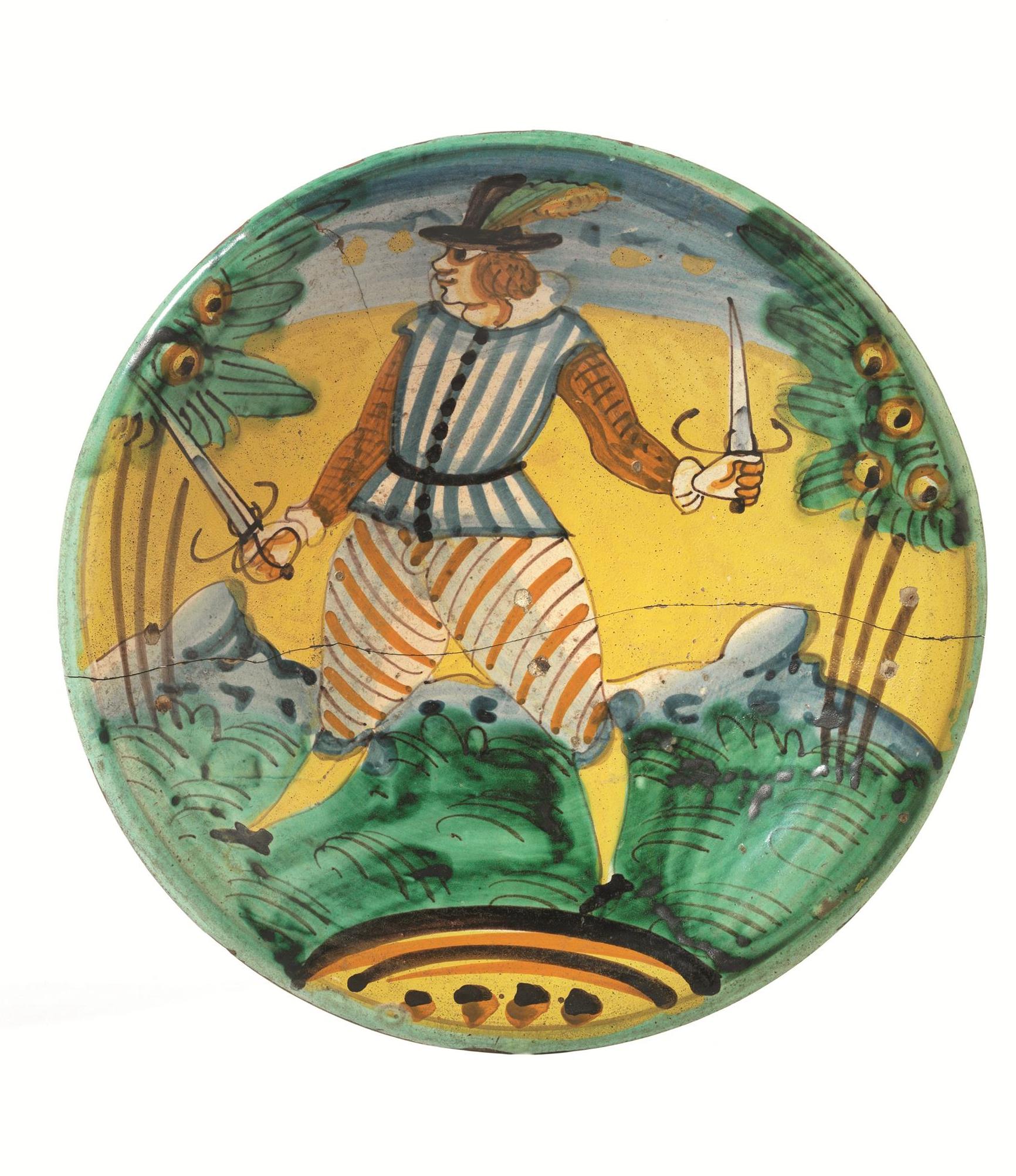 Piatto "Arlecchino", Montelupo, sec. XVII, in maiolica, superficie interamente decorata con figura di soldato che impugna una spada ed un pugnale entro un paesaggio, nei toni del giallo, verde, azzurro, bruno e arancio, labbro profilato in verde, diam. cm 31, restauri