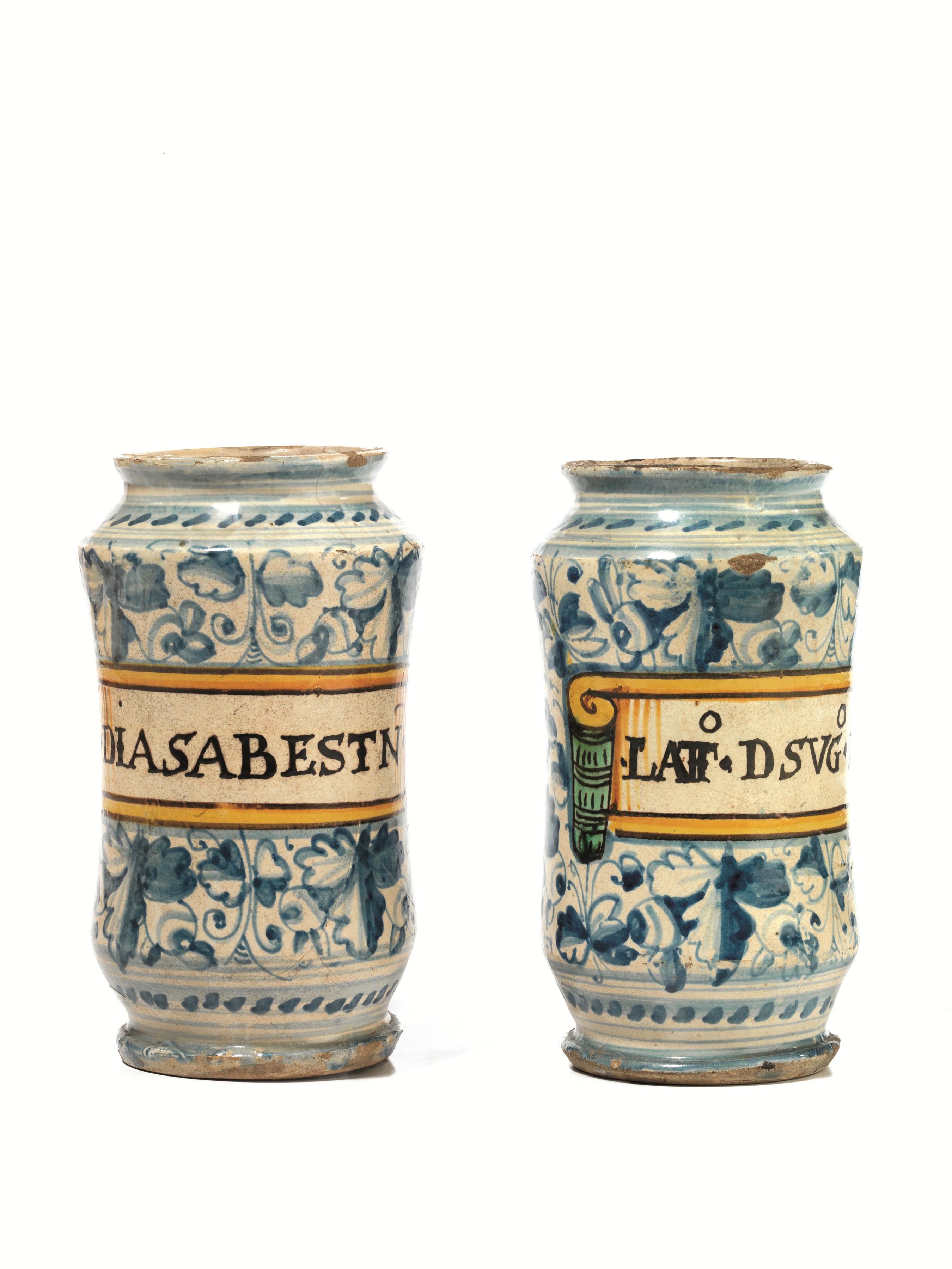 Coppia di albarelli, Montelupo, fine sec. XVI, in maiolica decorata a foglie di vite in blu e cartigli nei toni del giallo e verde con epigrafe, alt. cm 19, uno presenta una felatura