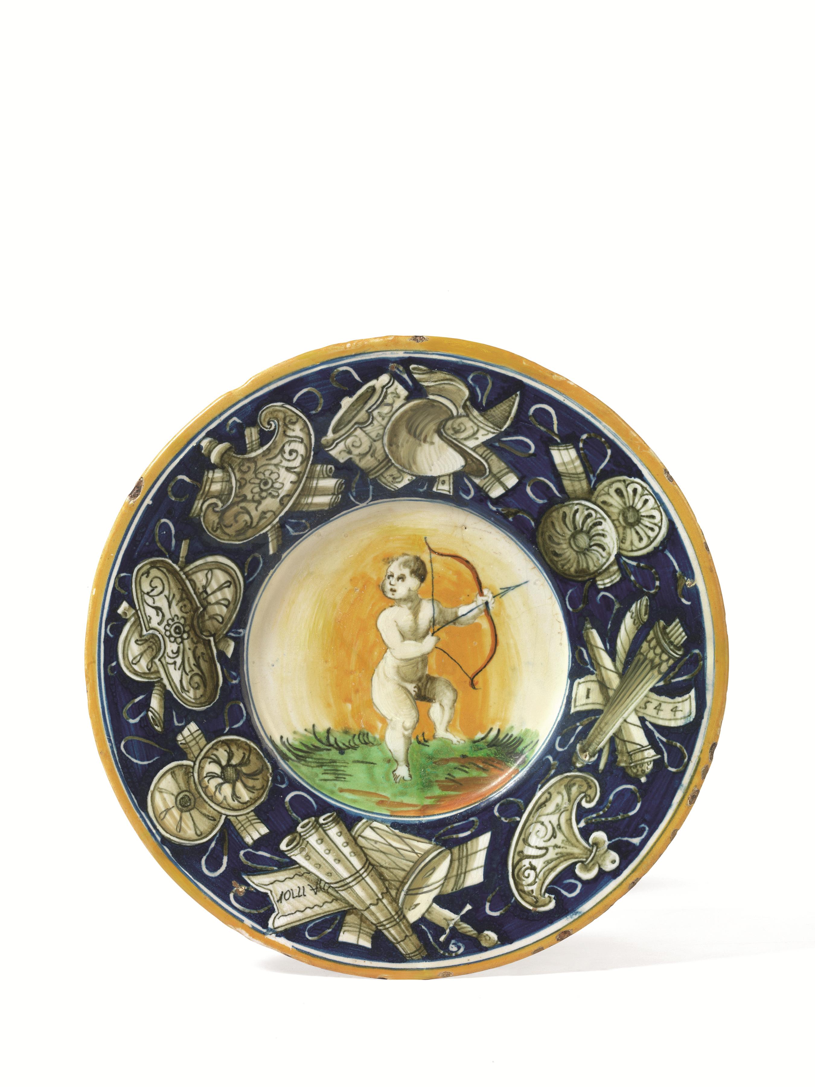 Piatto, Casteldurante, sec. XVI, in maiolica decorata nel cavetto con figura di Cupido e tesa fondo blu a trofei d’armi sui quali si legge Amor 1544, diam. cm 24