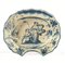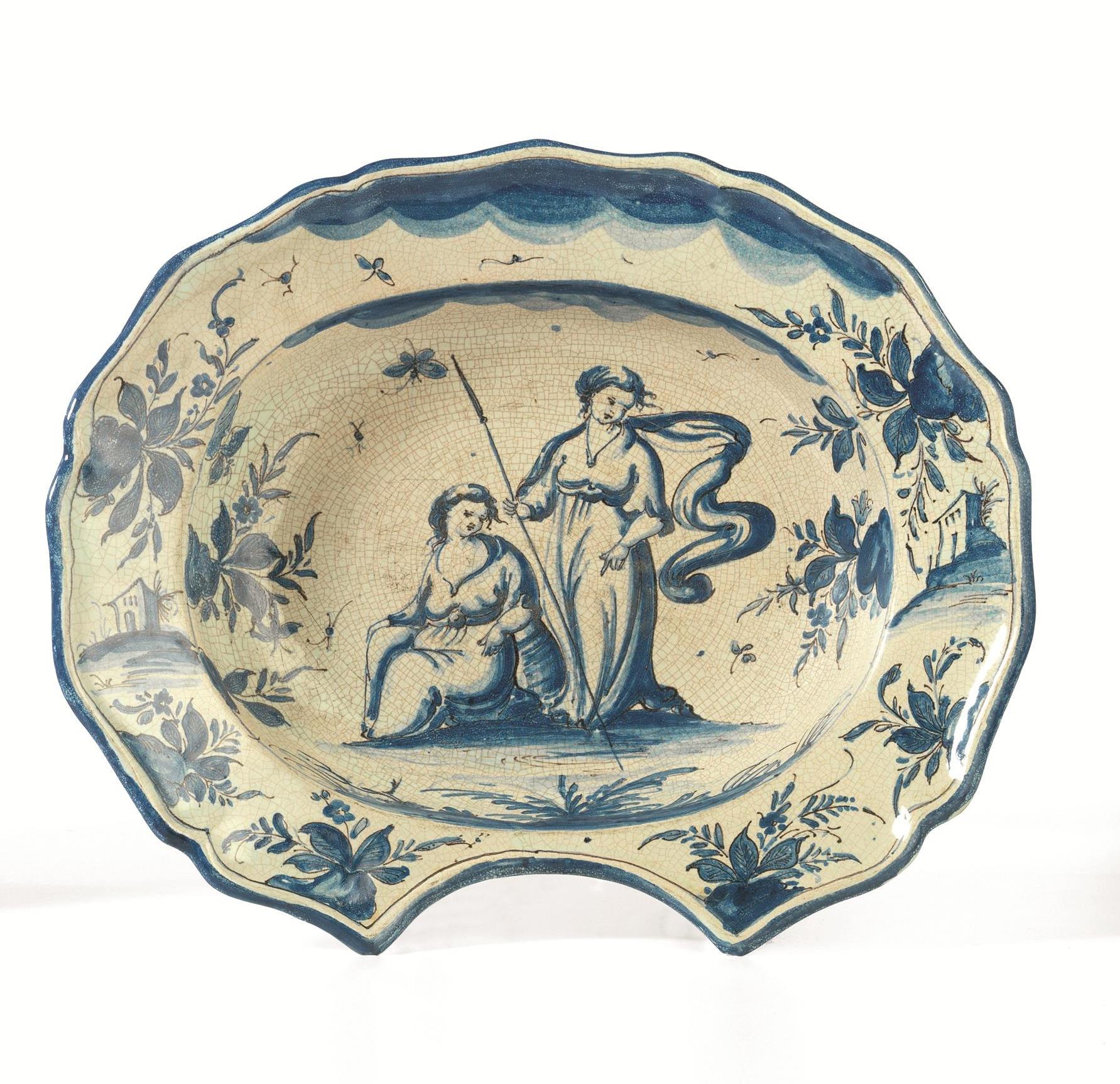 Bacinella da barba, Savona, inizi sec. XVIII, in maiolica decorata in monocromo blu a figure femminili, orlo sagomato, tesa decorata a motivo vegetale, cm 40x32